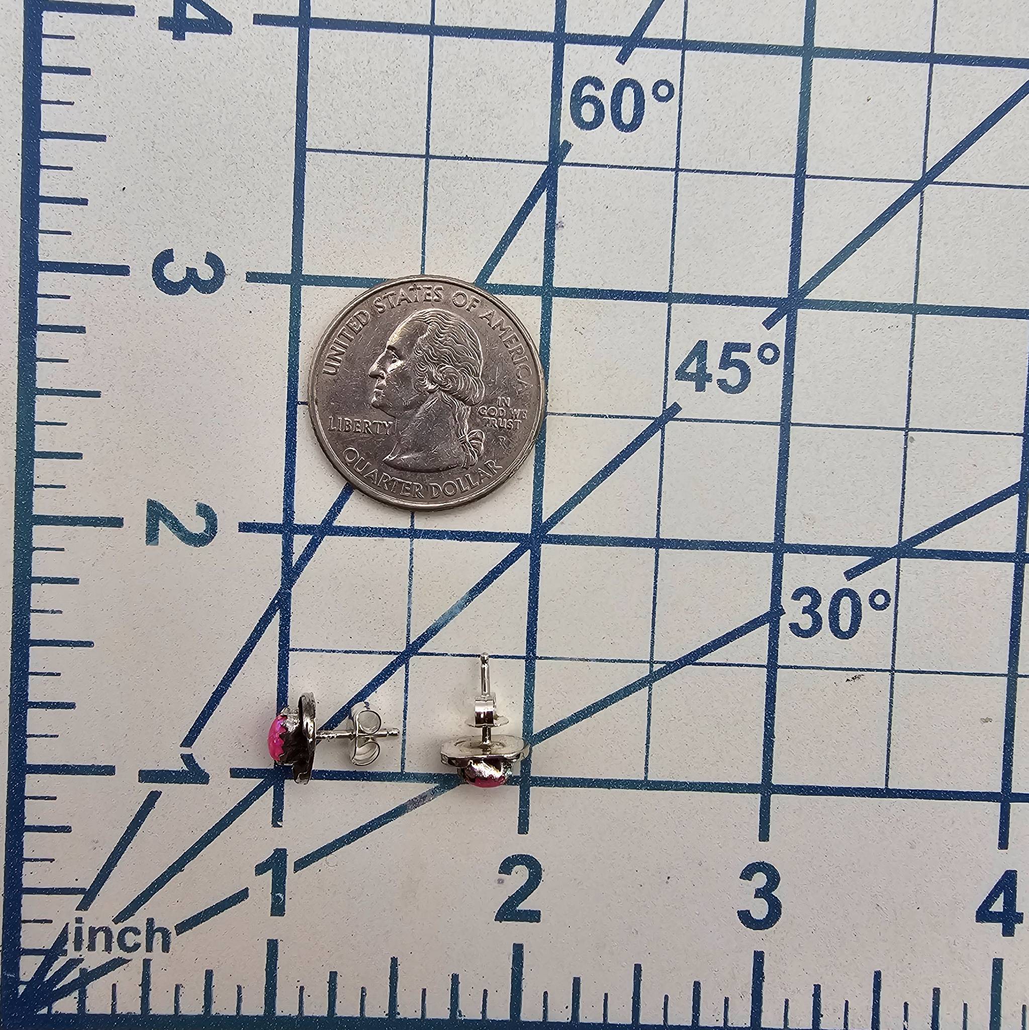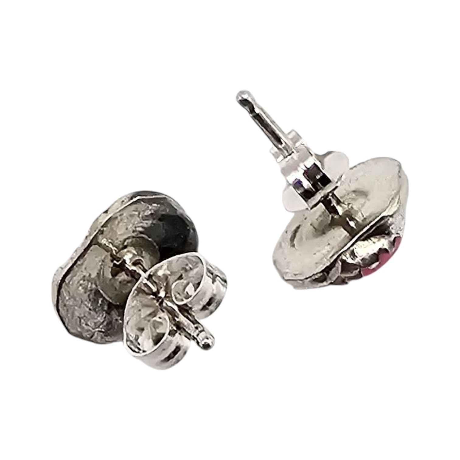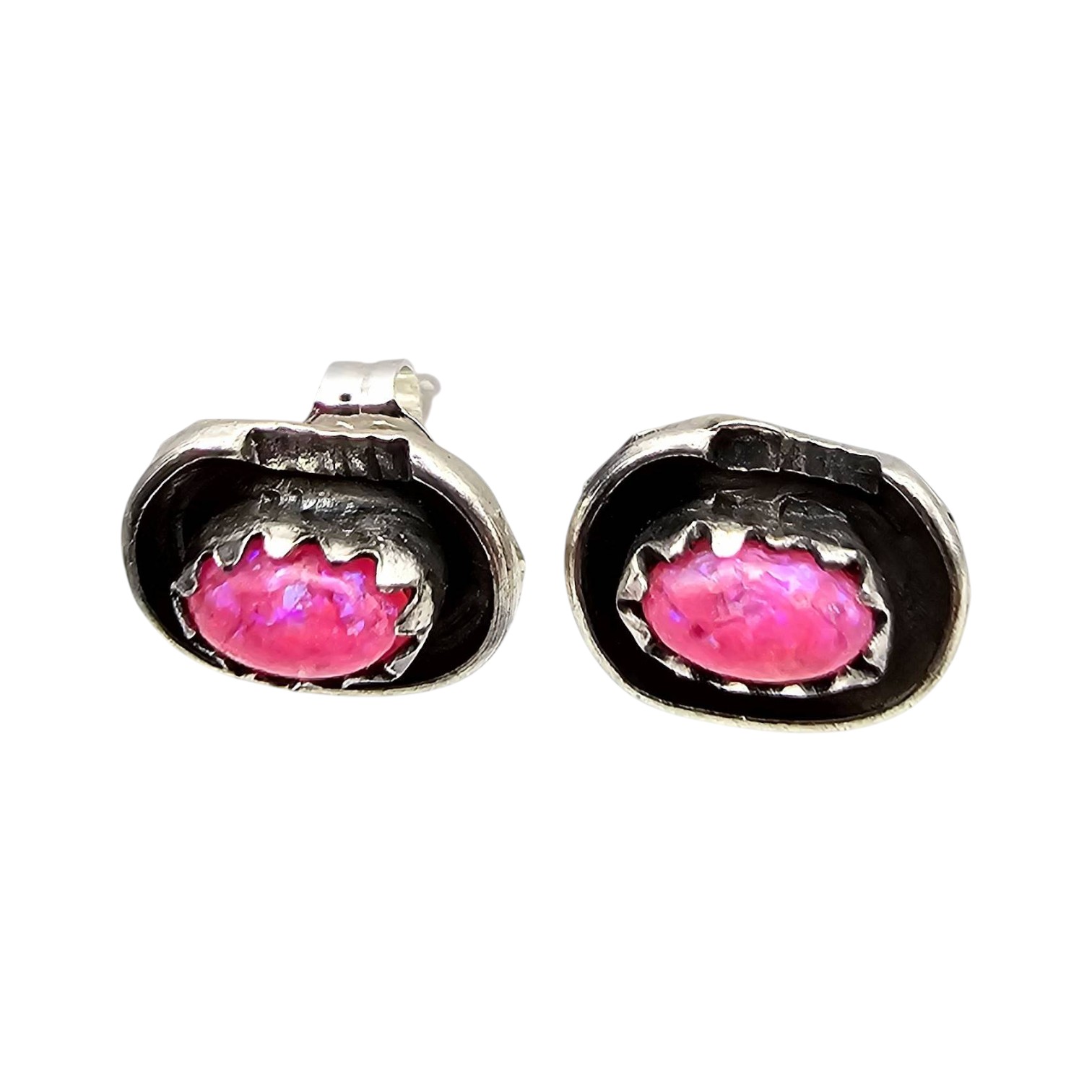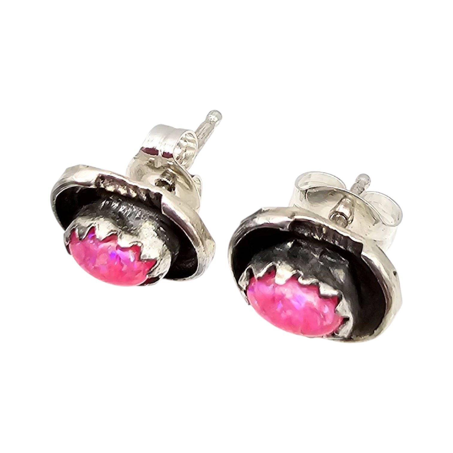 Sterling silver stud earrings set with pink opals, attributed to Navajo artisan Roselene Joe. The earrings weigh 1.1 grams collectively and feature an oxidized silver design surrounding the opals. Includes sterling silver butterfly backs. The earrings measure approximately 1/2 inch across.