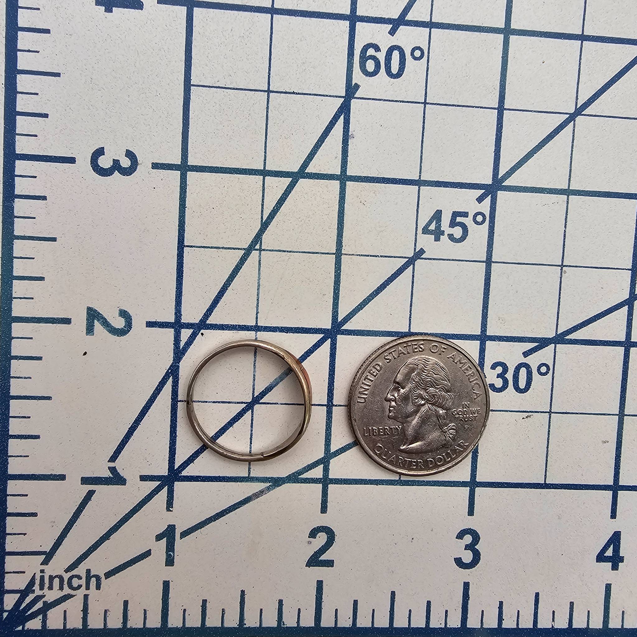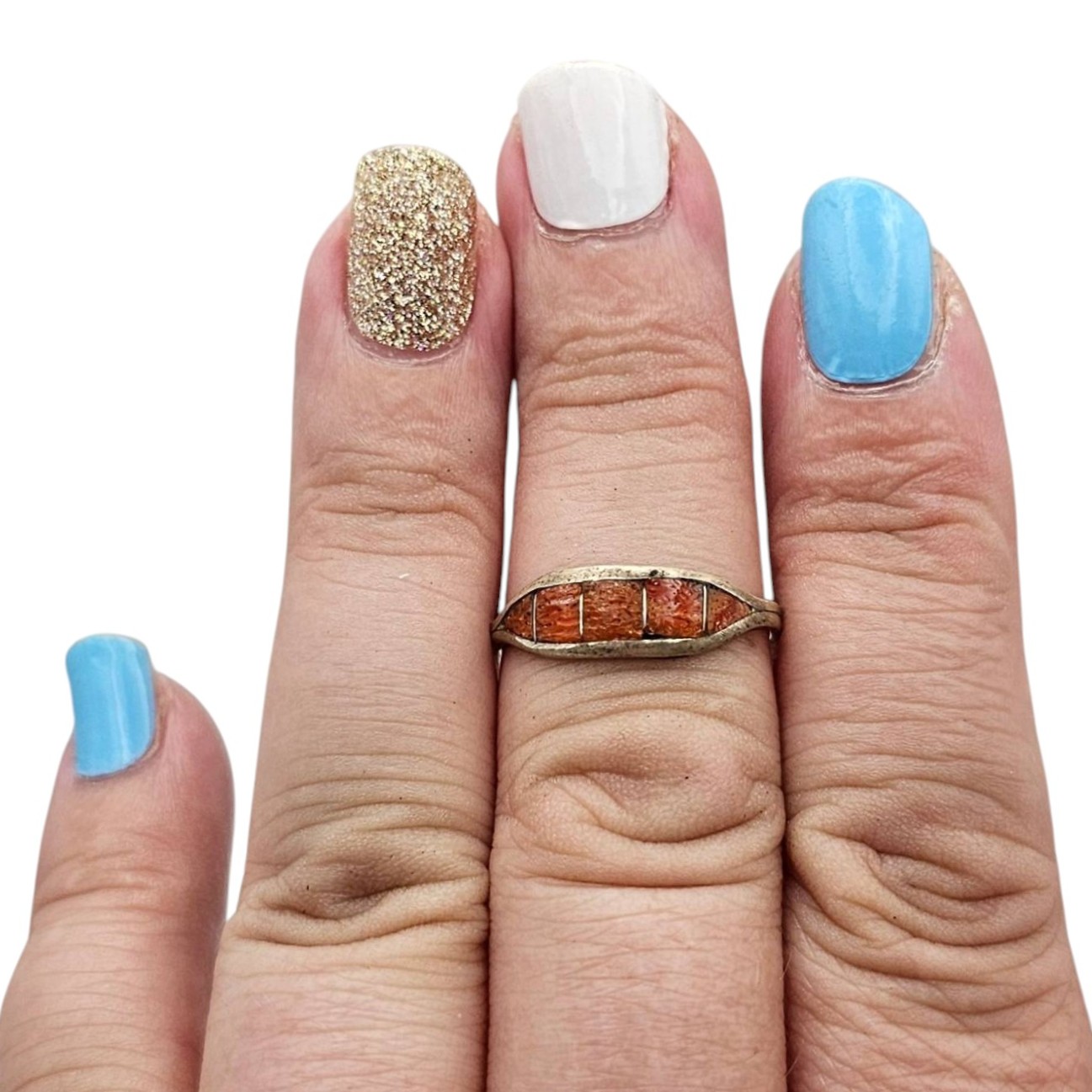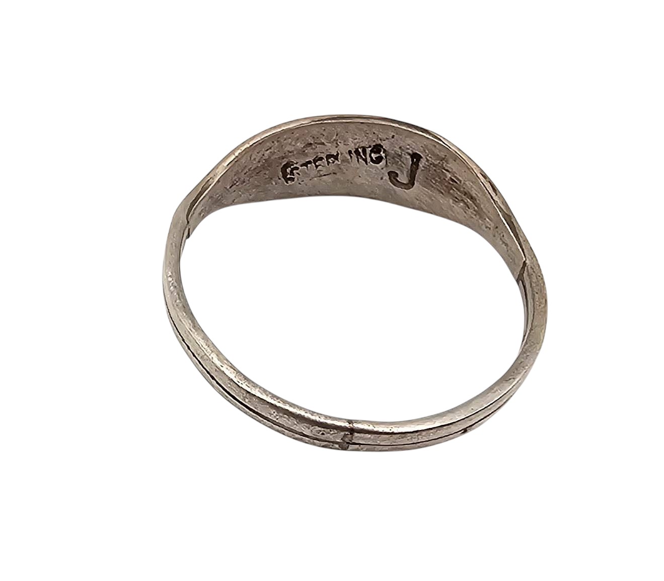 Sterling silver ring featuring coral inlay sections across the band. The interior of the band is marked ‘Sterling J’. Weighs approximately 1.3 grams. Suitable for use as a fashionable accessory or addition to a jewelry collection. Size 8 shown with comparative objects for scale.