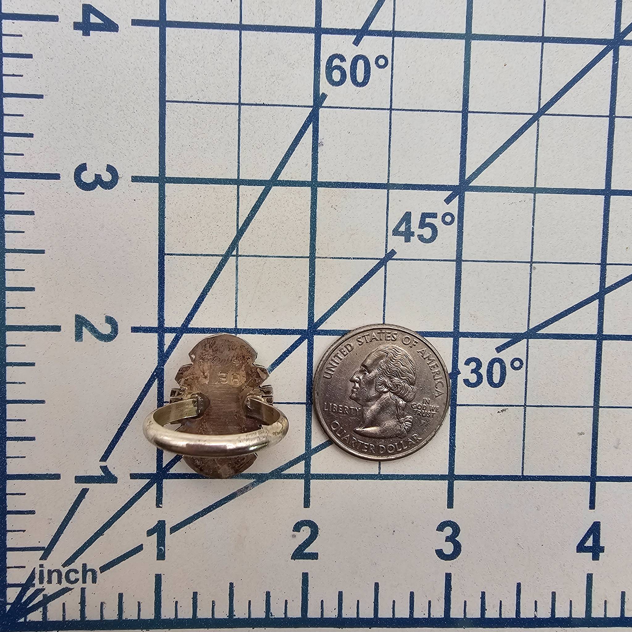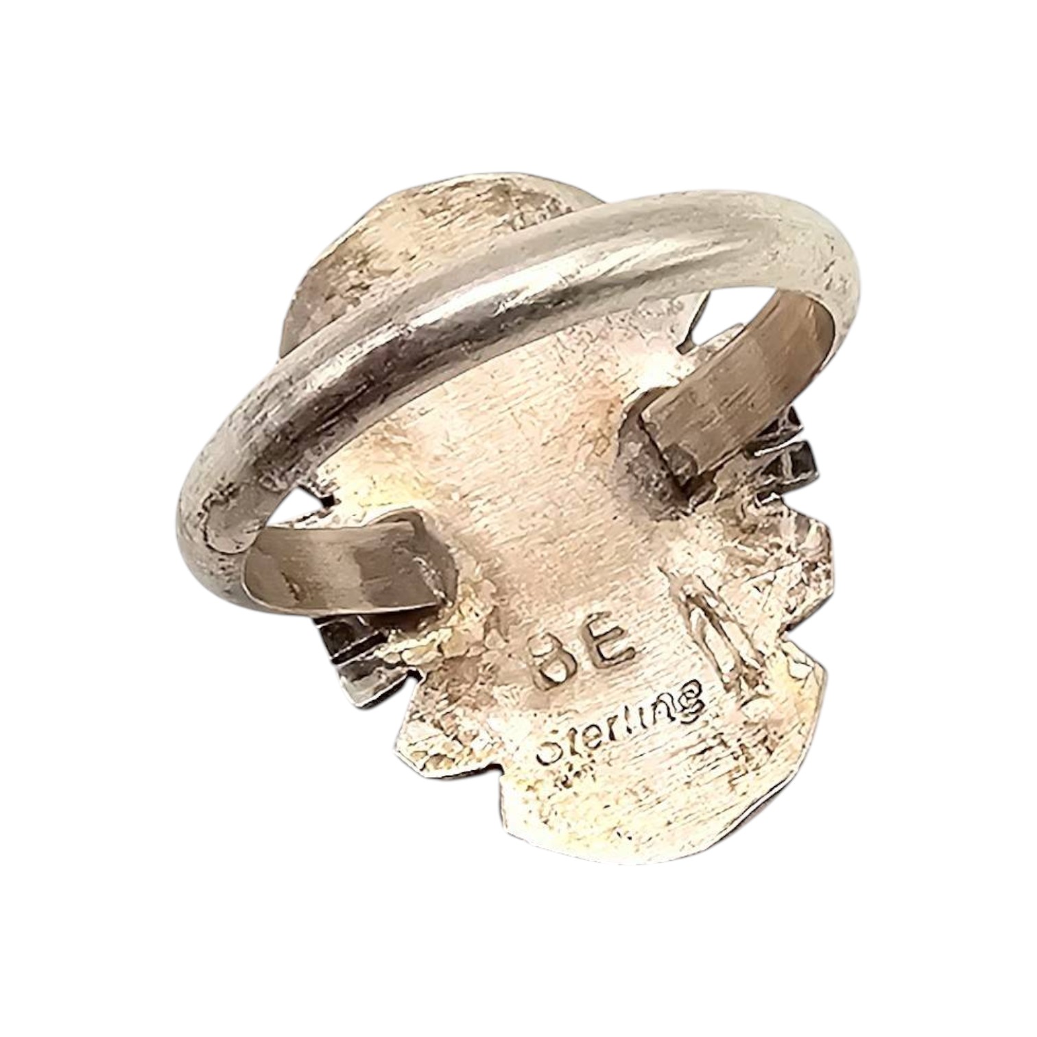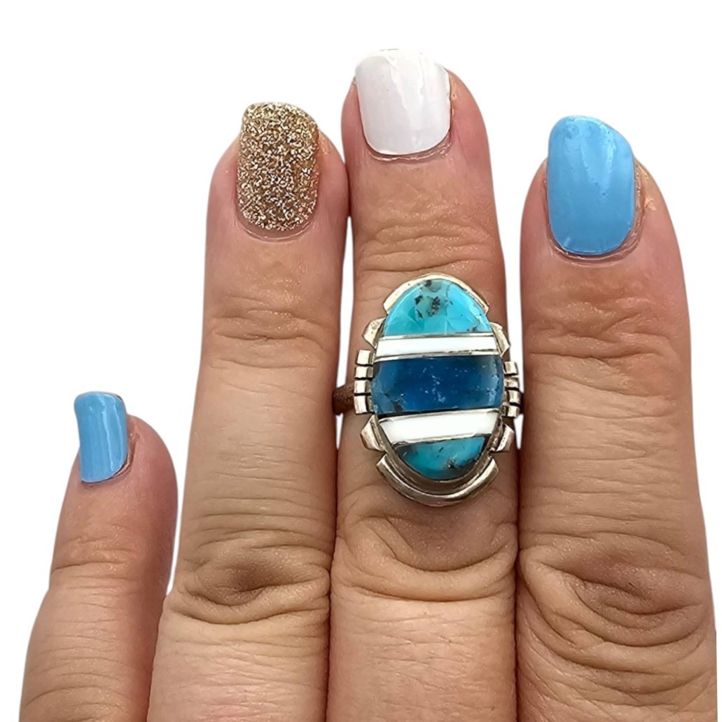 Navajo handmade sterling silver ring by Brandon Etcity features multi-stone inlay, including vibrant turquoise and white stones. The ring is marked ‘Sterling’ and weighs approximately 5.6 grams. Ring size 7.5. The craftsmanship showcases a classic Navajo design with intricate detailing on the band and stone setting.