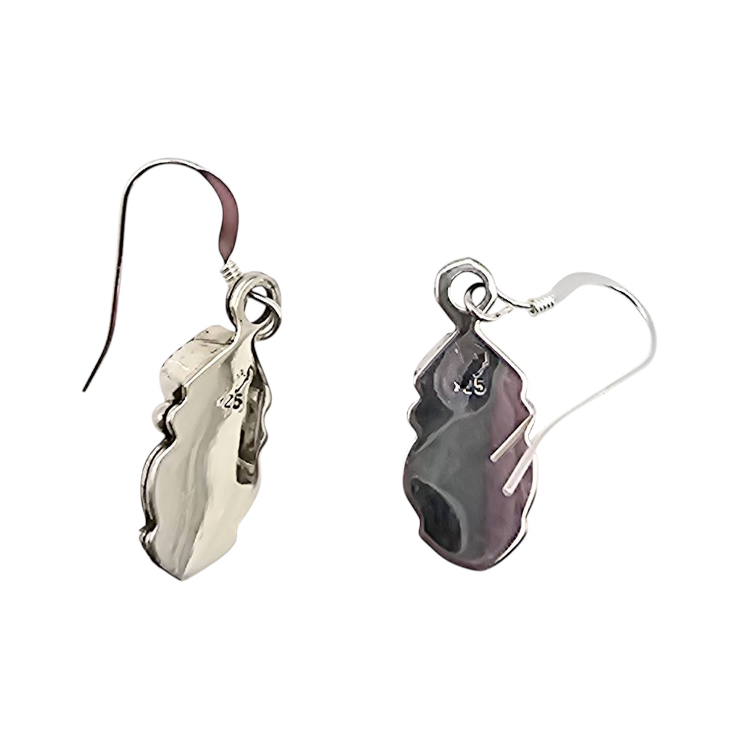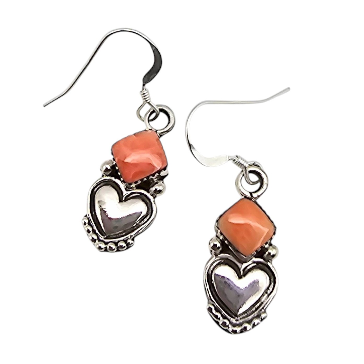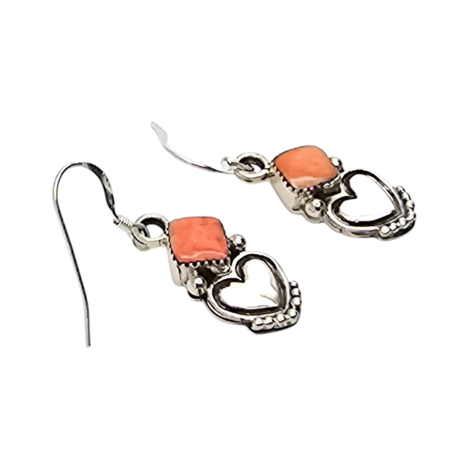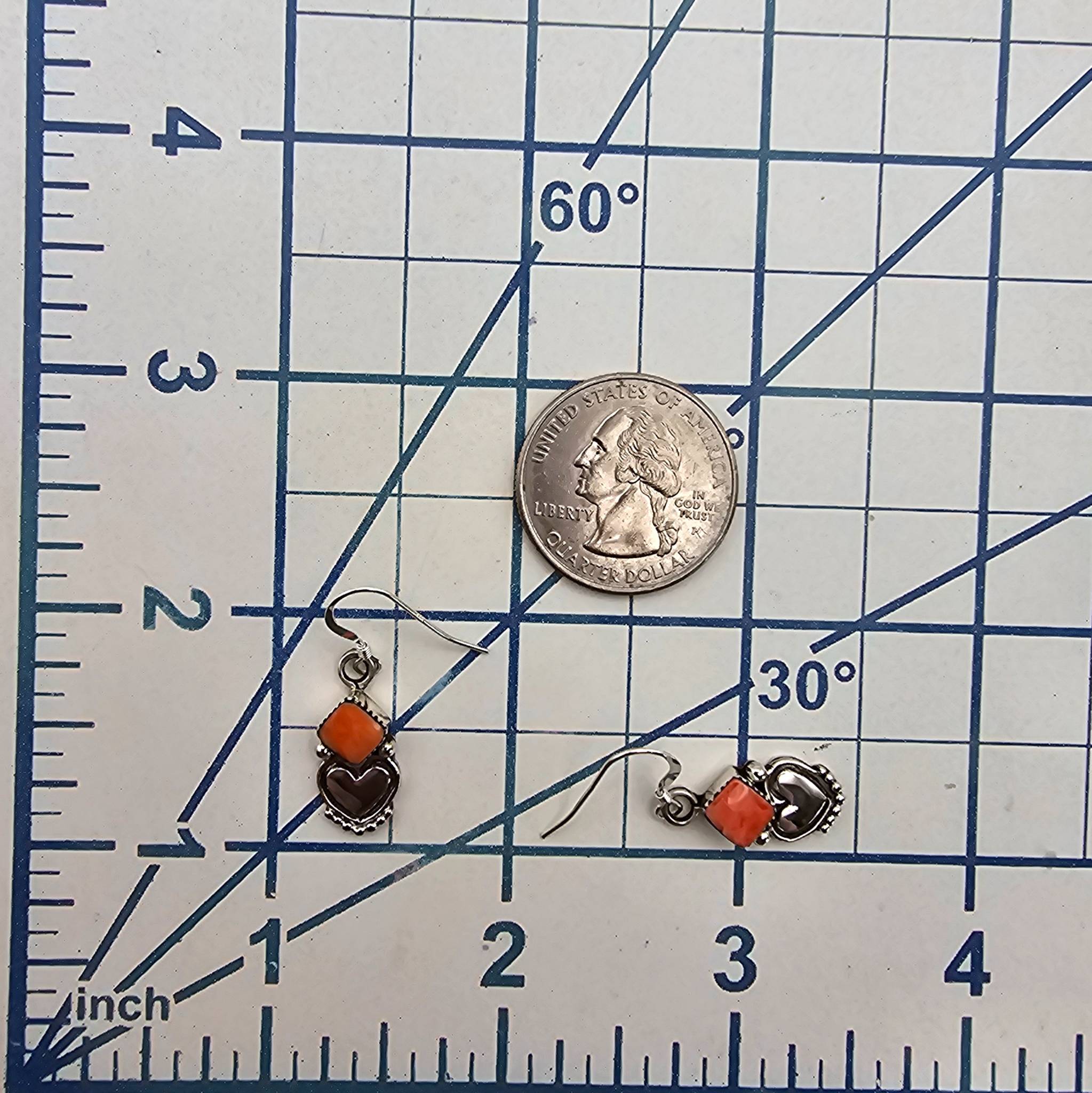Sterling silver earrings handcrafted by Navajo artist Sheena Jack, featuring a heart-shaped design accented with polished coral stones. Marked ‘.925’ for sterling purity. Lightweight at 3.3 grams and approximately 1 inch in length. Delicate hook ear wires complete the design.