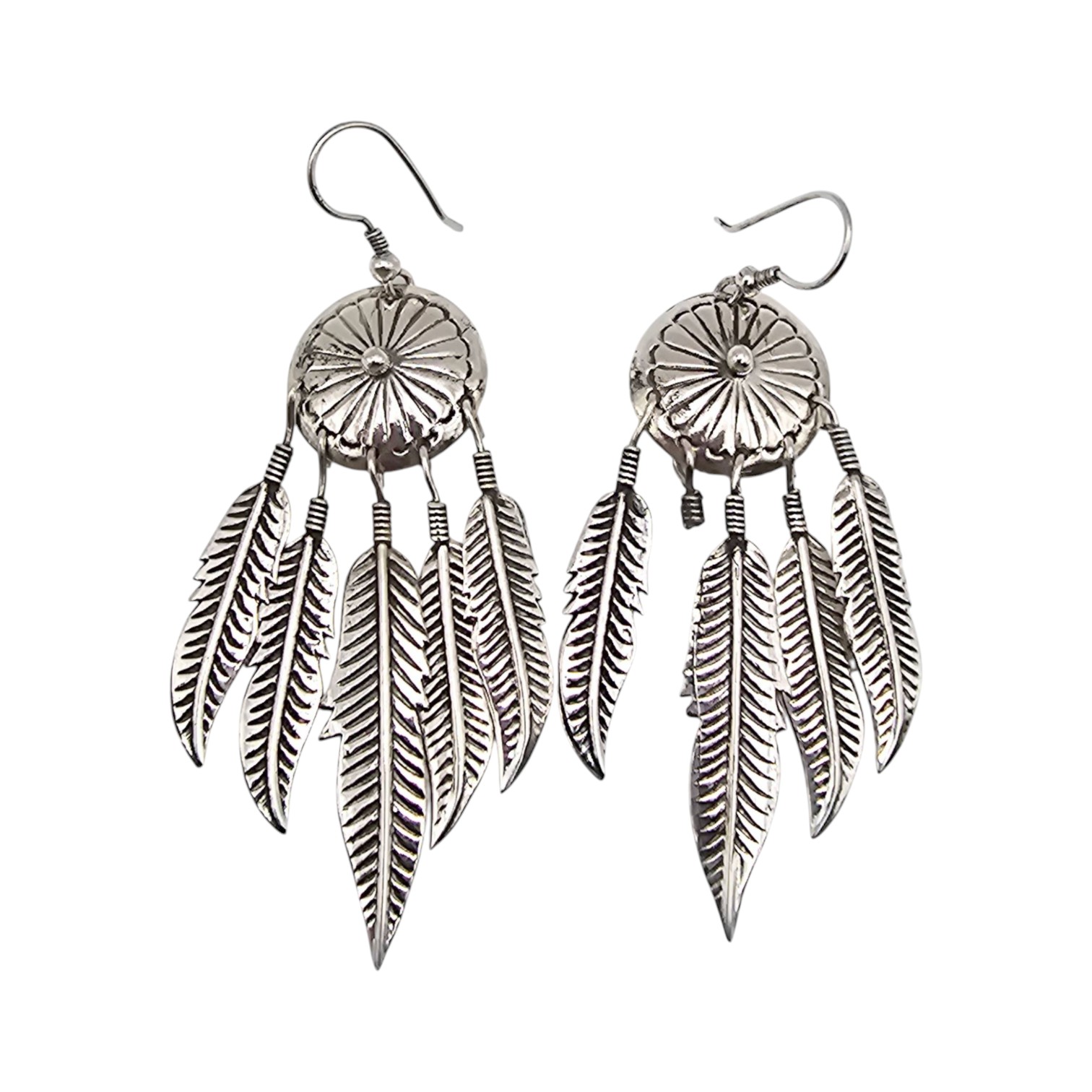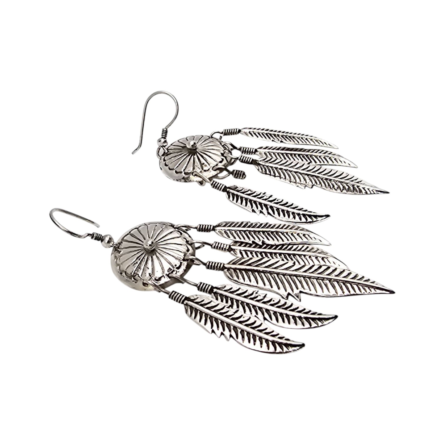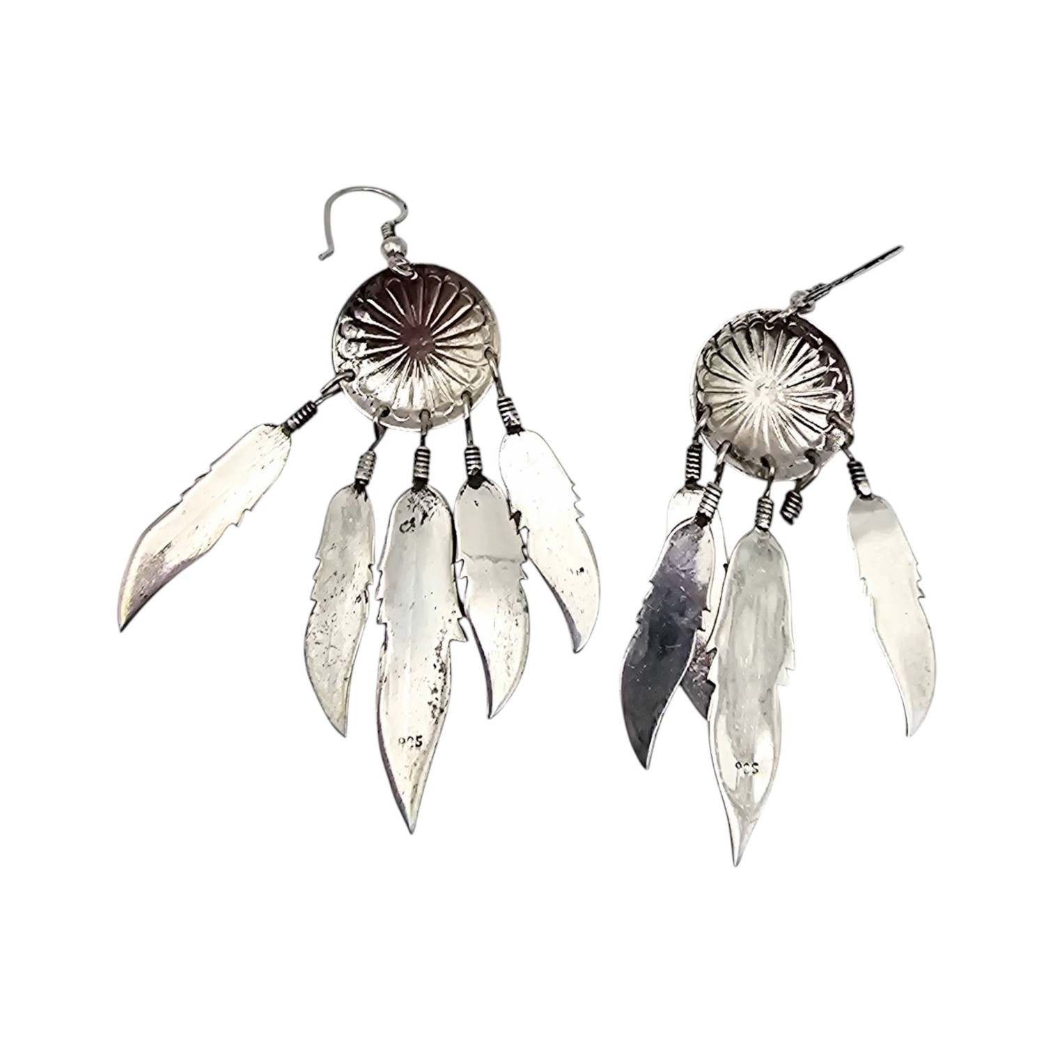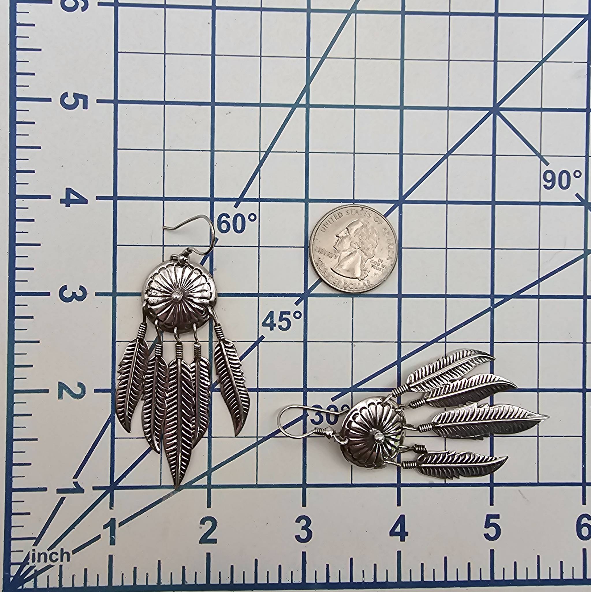 Southwestern sterling silver feather drop earrings weighing approximately 15.6 grams. The earrings feature a round concho-like centerpiece with engraved designs and five dangling feather accents on each. Sold as-is. The overall length of the earrings is displayed for context alongside a ruler.