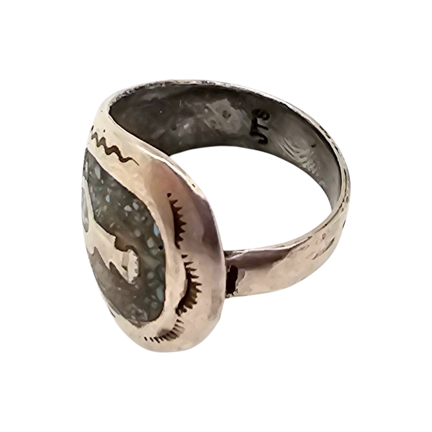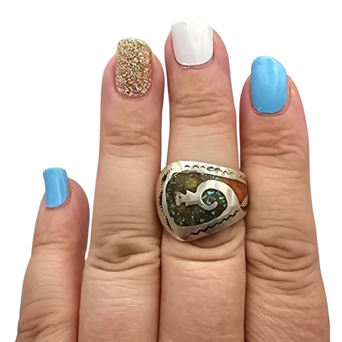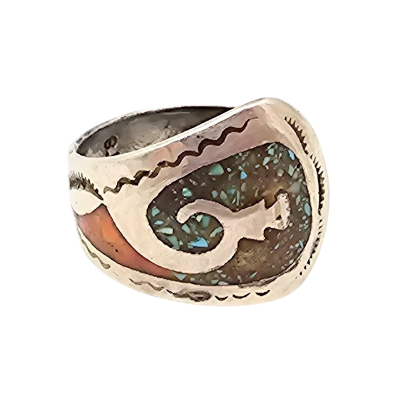 Sterling silver Navajo ring crafted by Juan Singer featuring inlays of coral and turquoise with intricate native design details. The ring is size 9.25 and weighs approximately 5.4 grams. A prominent Arizona Native American jewelry piece displaying excellent craftsmanship.