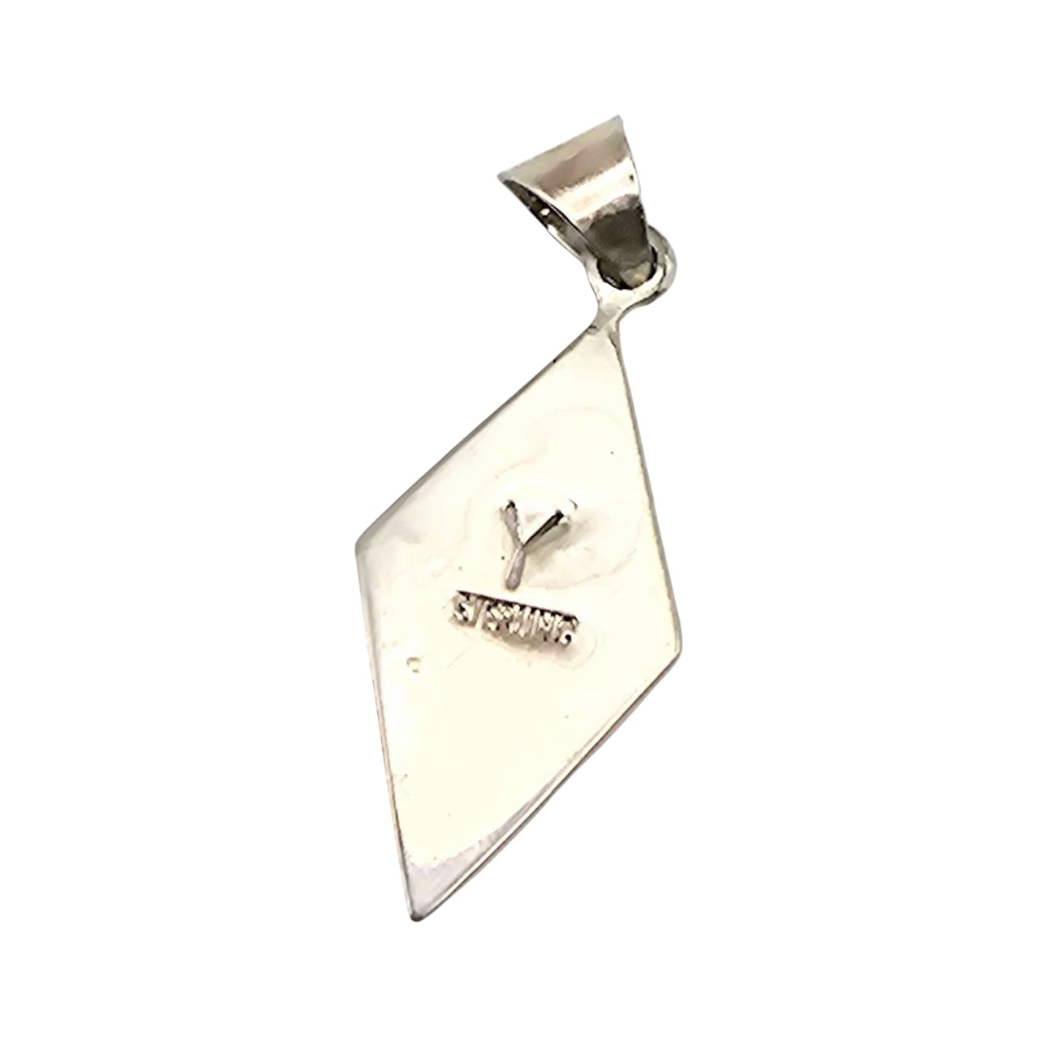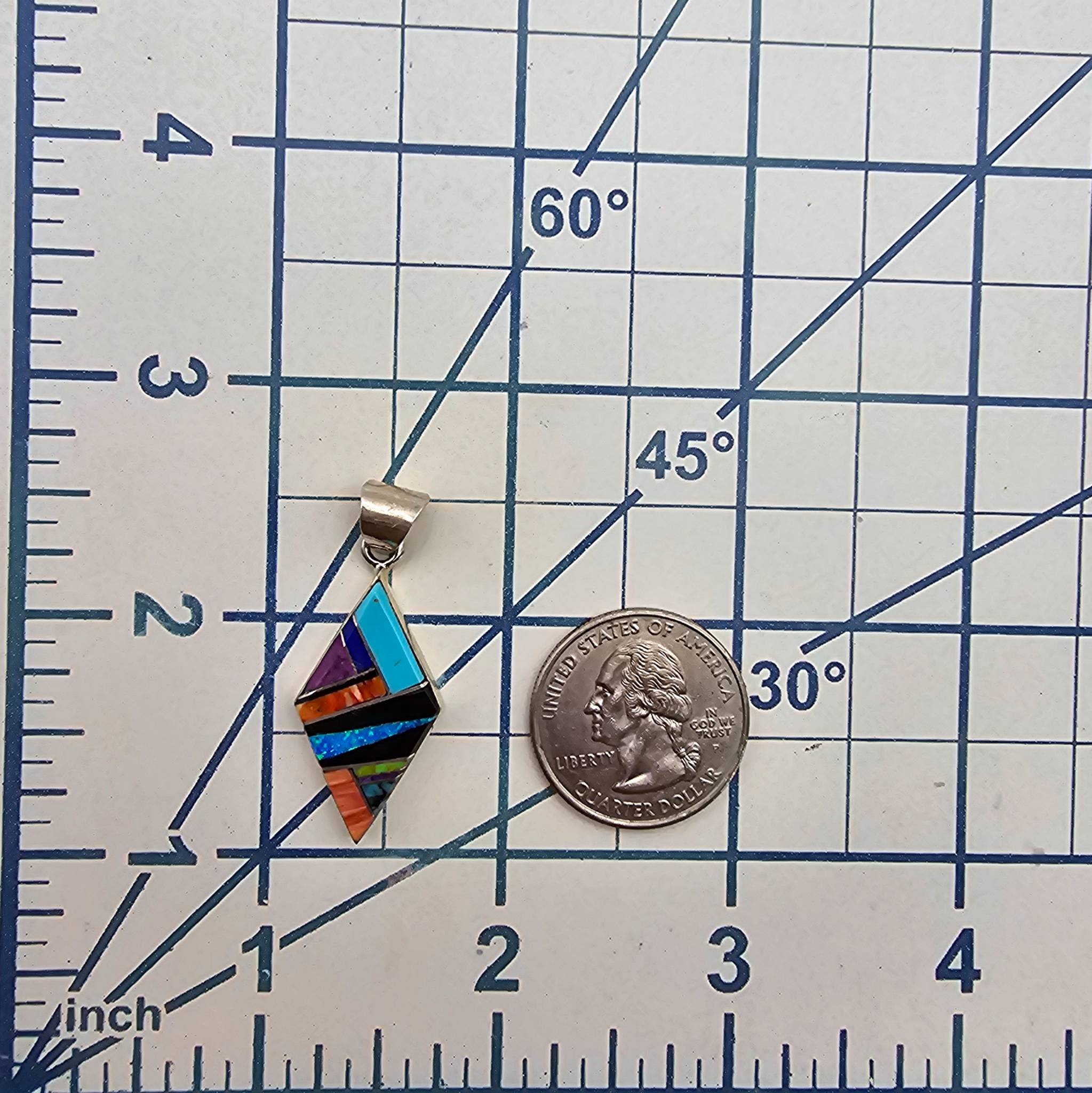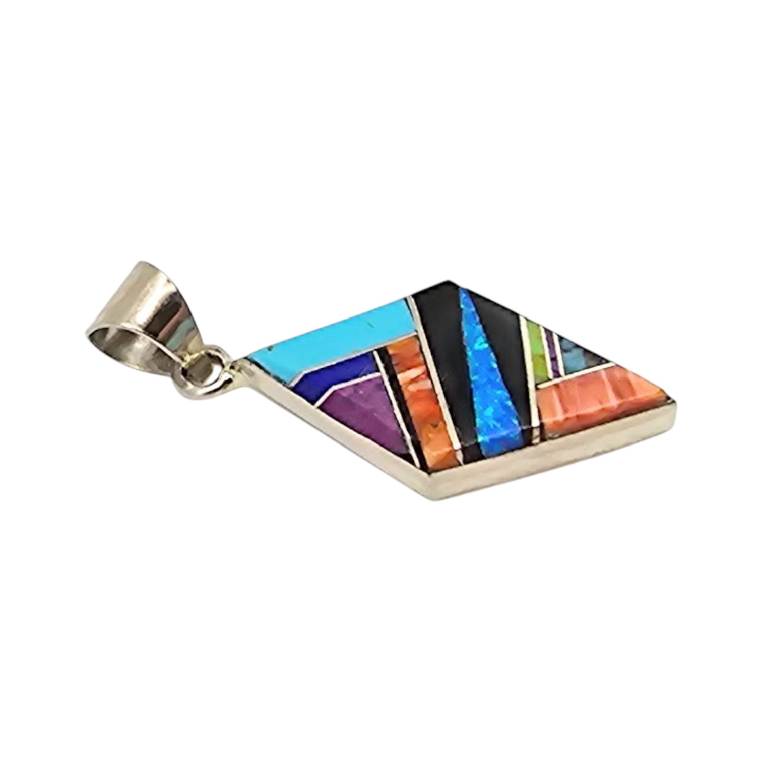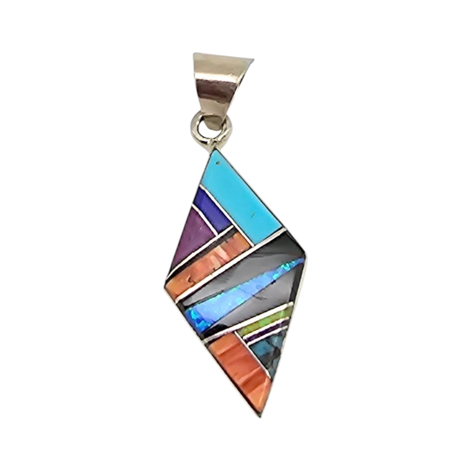Handmade by Navajo artisan Arnold Yazzie, this pendant is crafted from sterling silver and showcases a multi-color inlay design featuring stones such as turquoise, spiny oyster,opal, onyx, chrysoprase, and other vibrant materials. Measuring approximately 1.5 inches in length, it weighs 3.6 grams and includes a stamped hallmark on the back. Ideal for collectors of Native American jewelry.
