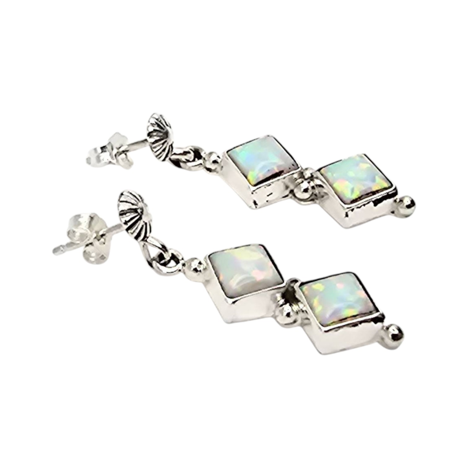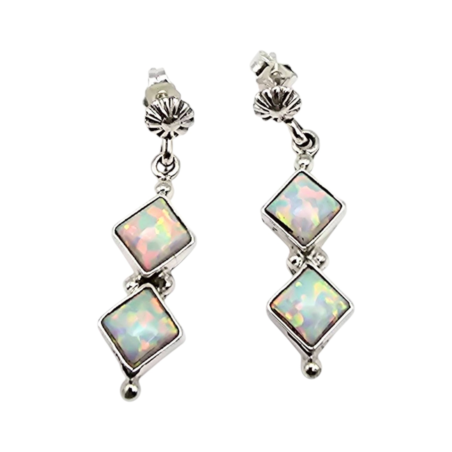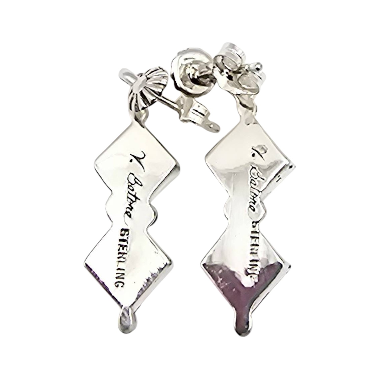 Sterling silver earrings handcrafted by Navajo silversmith Verley Betone. These earrings feature an opal inlay in square settings and measure approximately 1.5 inches in total length. Marked on the back with the artist’s signature. Weighs approximately 3.8 grams. Includes original packaging, stating ‘Genuine Indian Handcrafted Sterling Silver.’