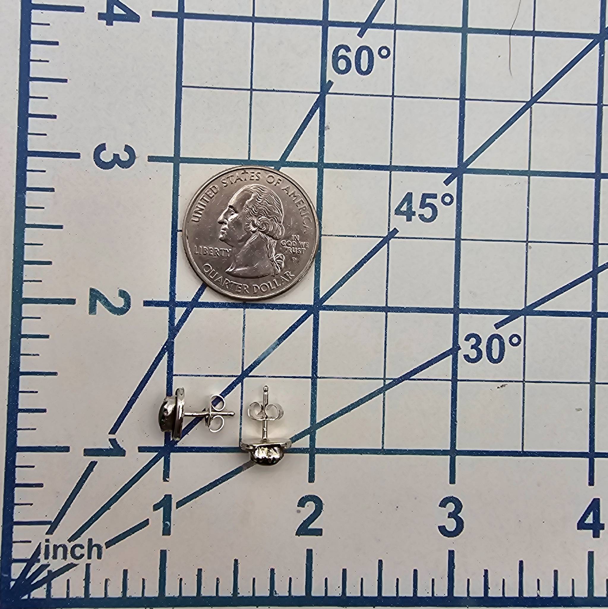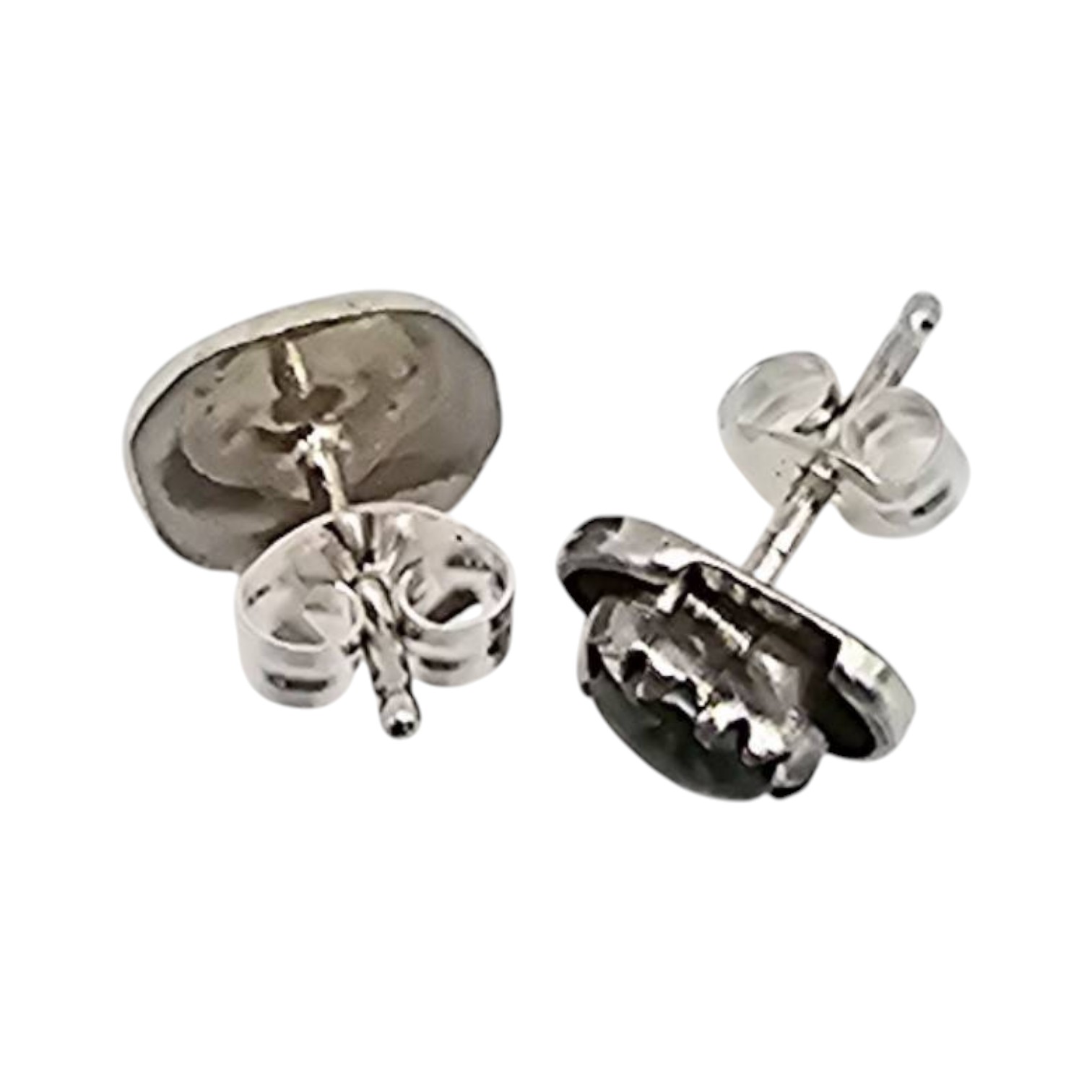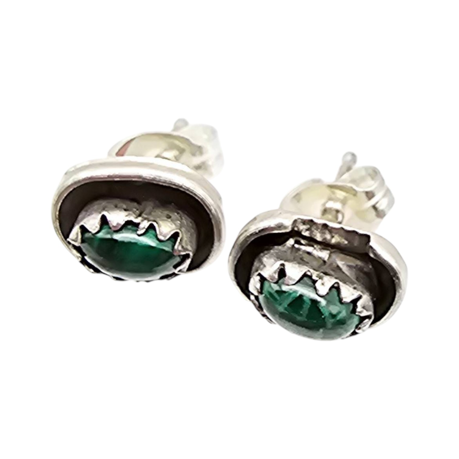 Stud earrings handcrafted by Roselene Joe, a Navajo artisan. Made of sterling silver and featuring malachite stones surrounded by bezel settings. Weighs approximately 1.0 gram in total. Includes butterfly clasps for secure wearing. Measures approximately 0.5 inches in diameter.