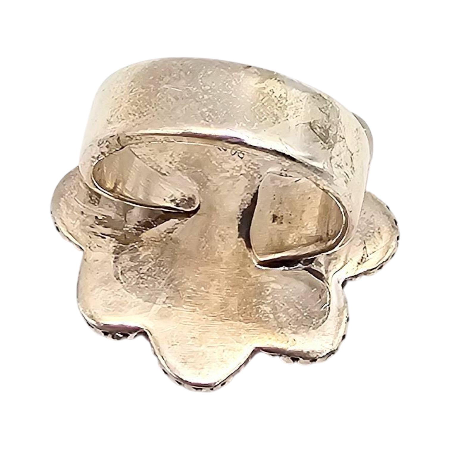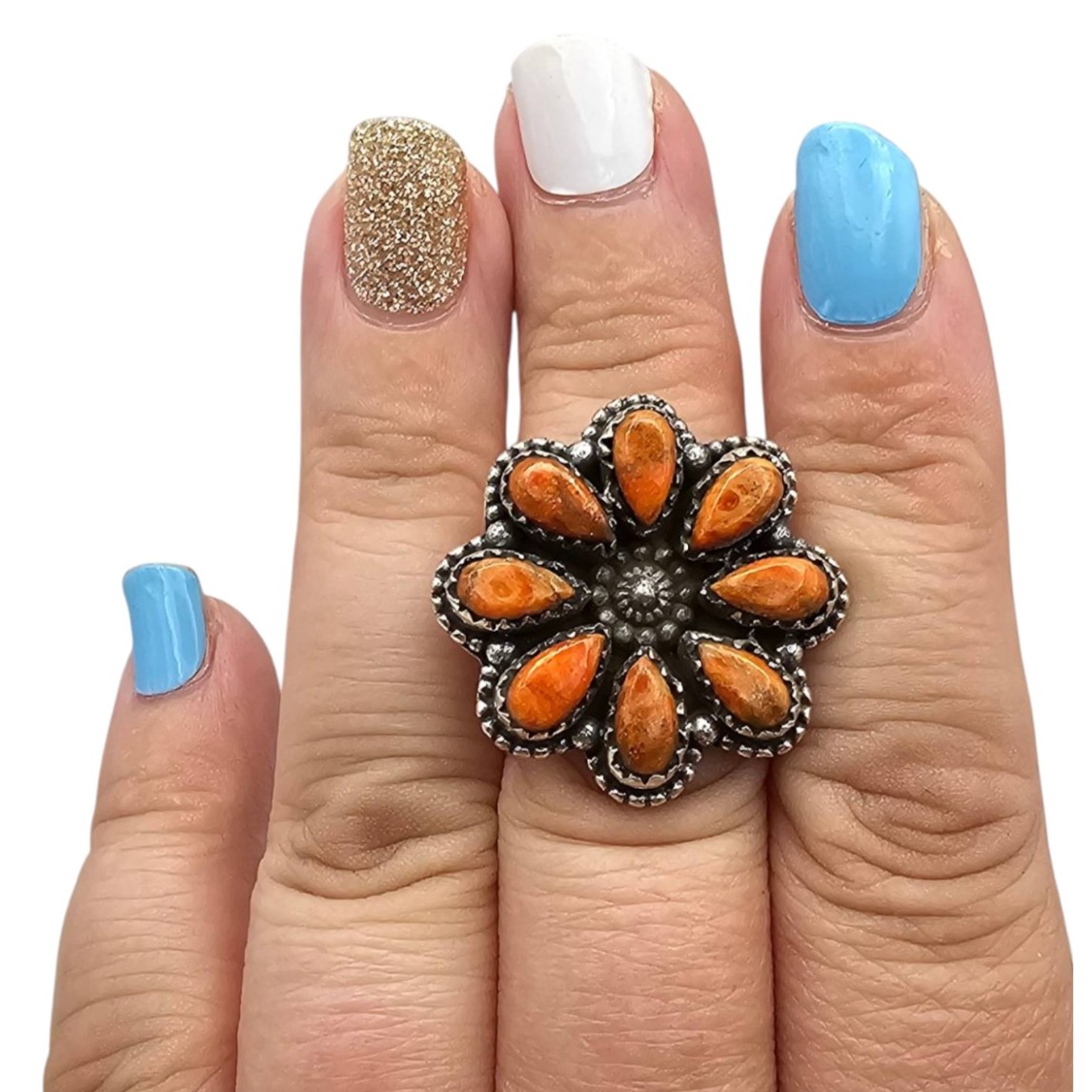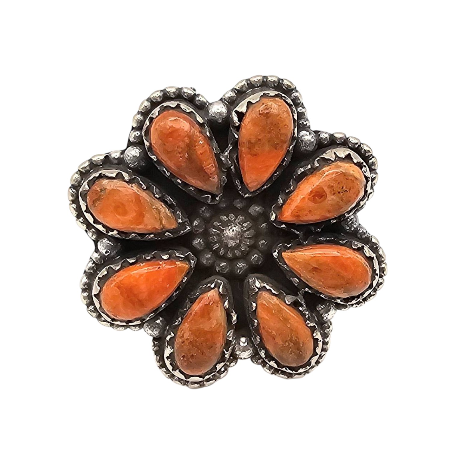 Sterling silver adjustable ring from the Hada Collection featuring a floral design with apple coral stones. The ring weighs 12.9 grams and showcases intricate craftsmanship. The adjustable band ensures a comfortable and versatile fit size 7.5