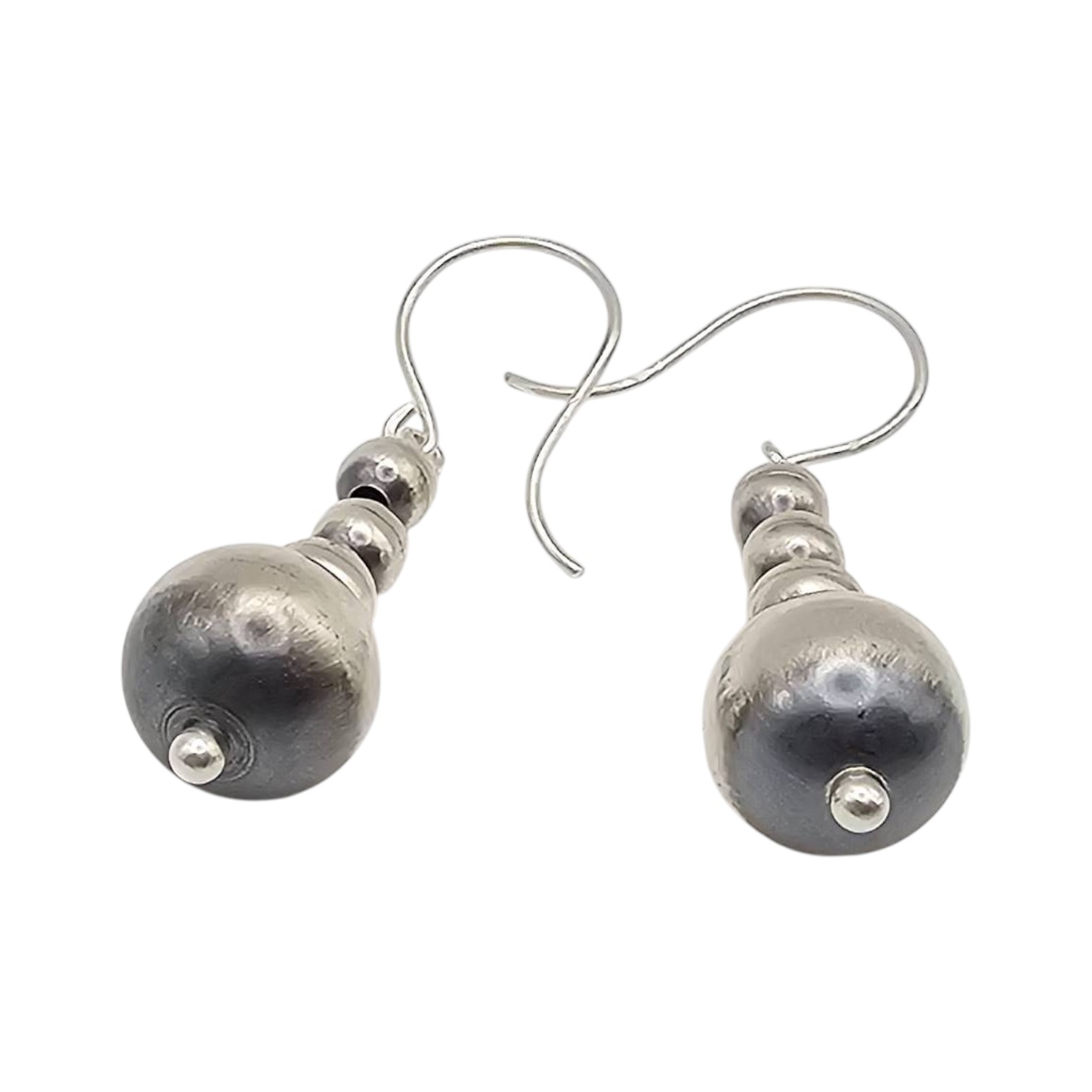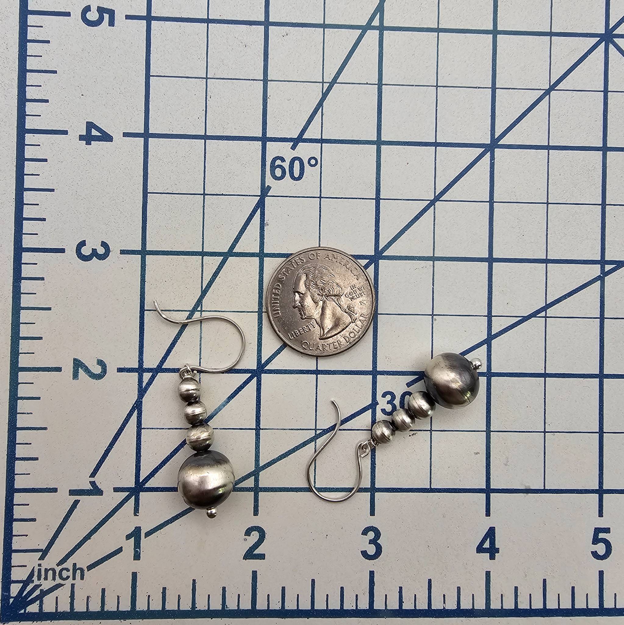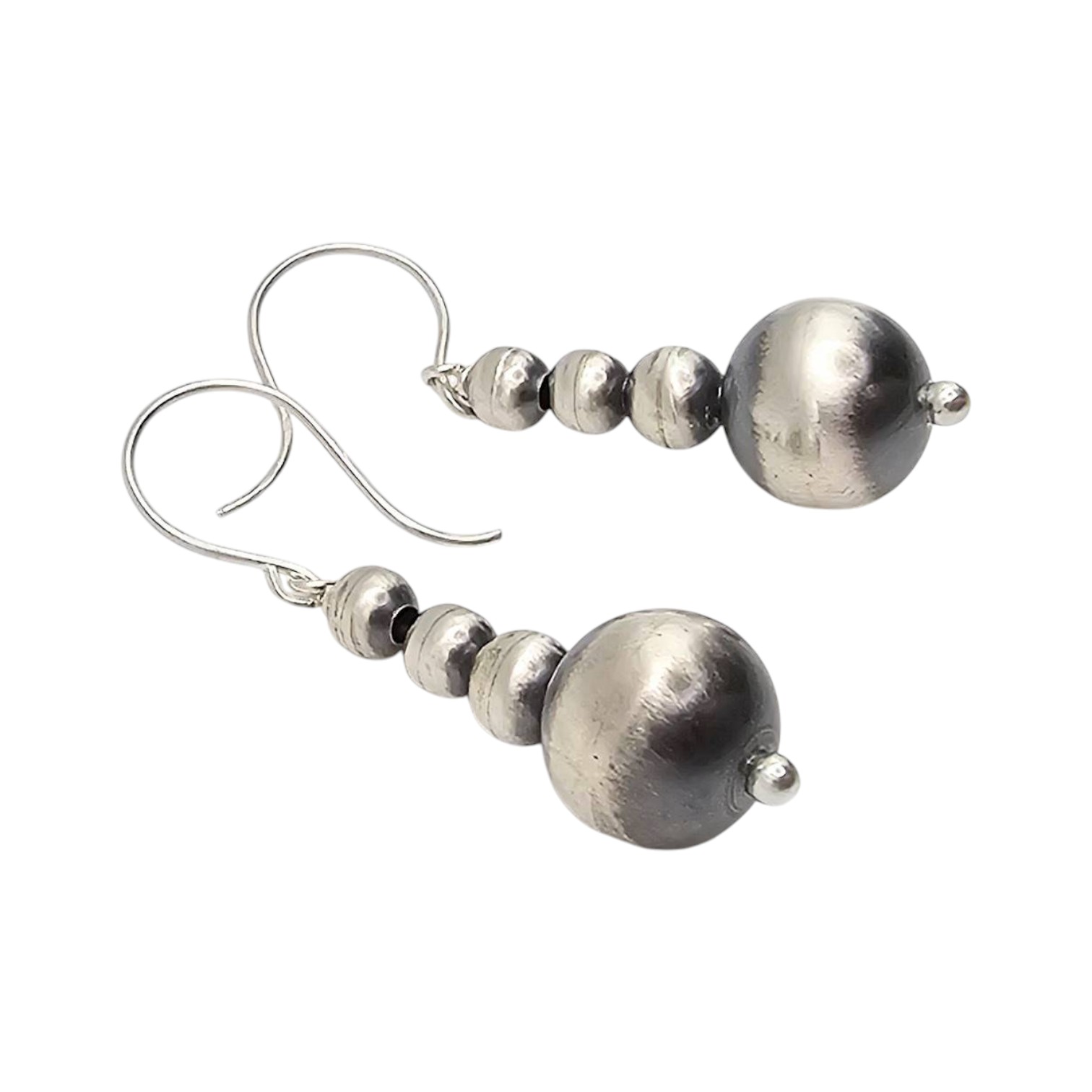 Genuine Navajo handcrafted sterling silver earrings by Amanda Larry. These earrings feature a graduated bead design in sterling silver with shepherd hook closures. They weigh approximately 4.4 grams and are marked to confirm sterling silver composition.