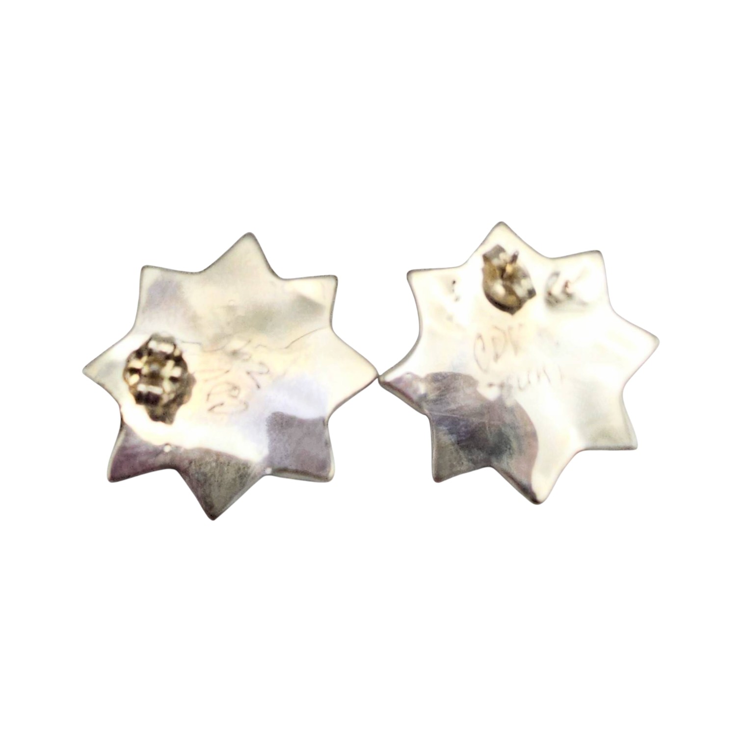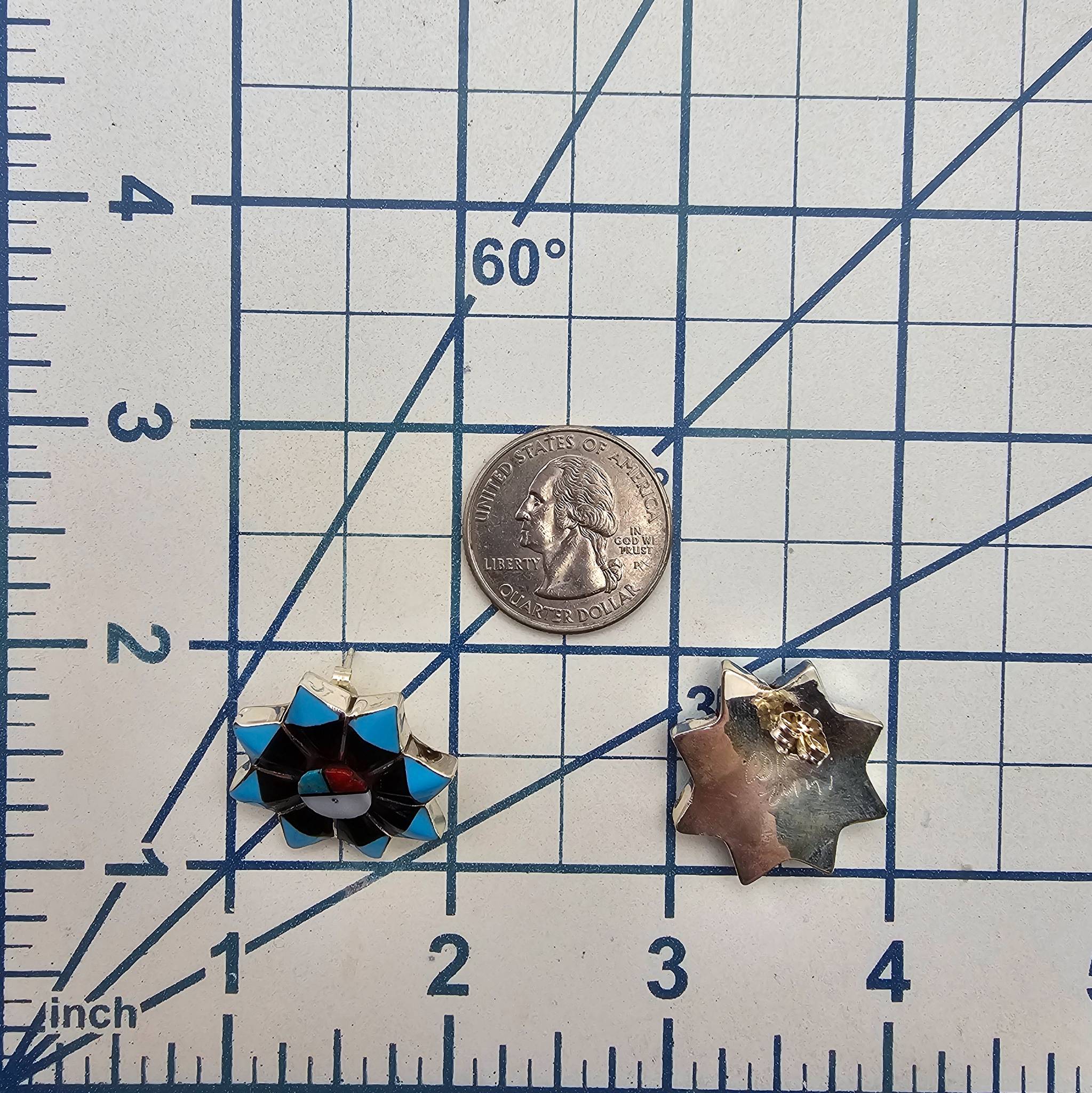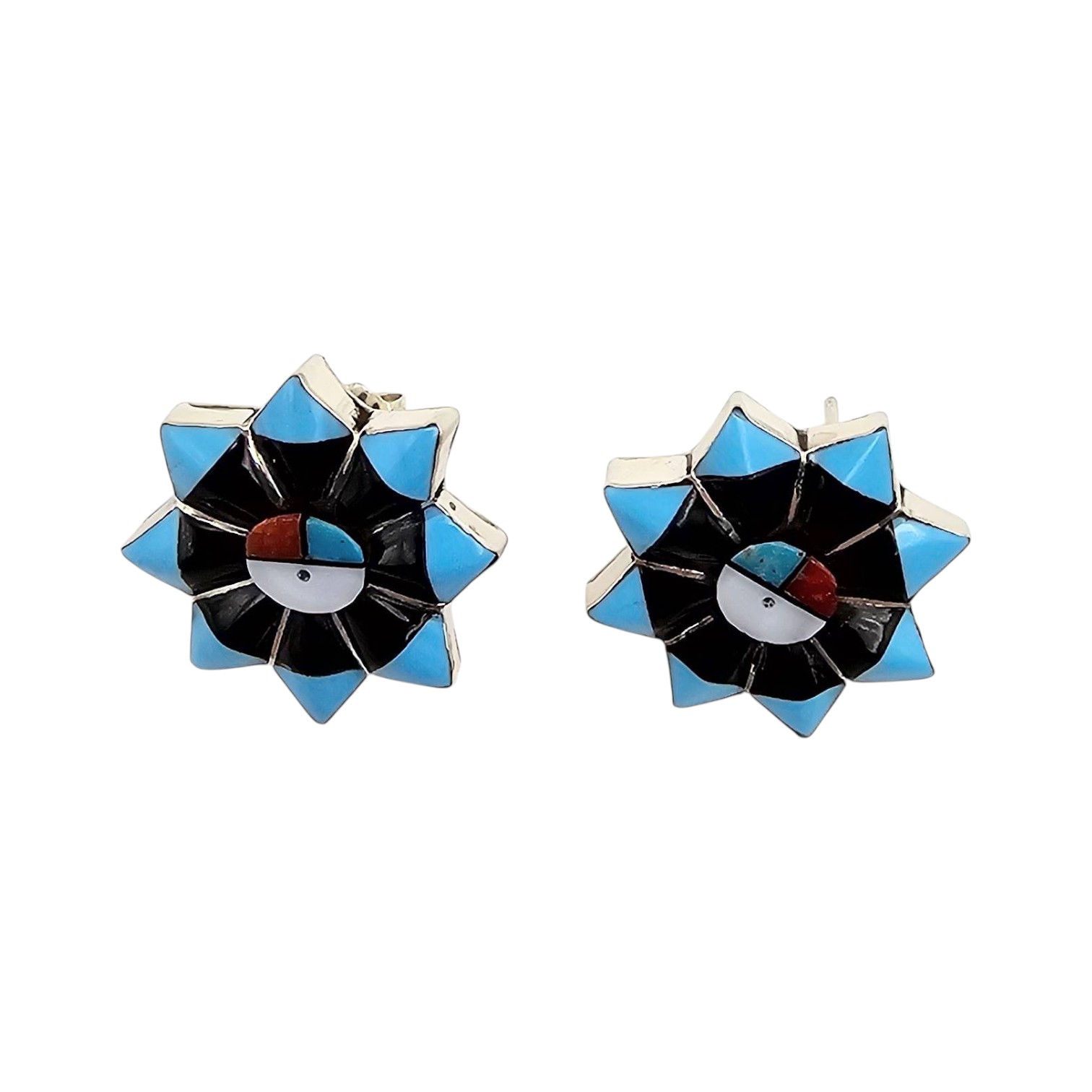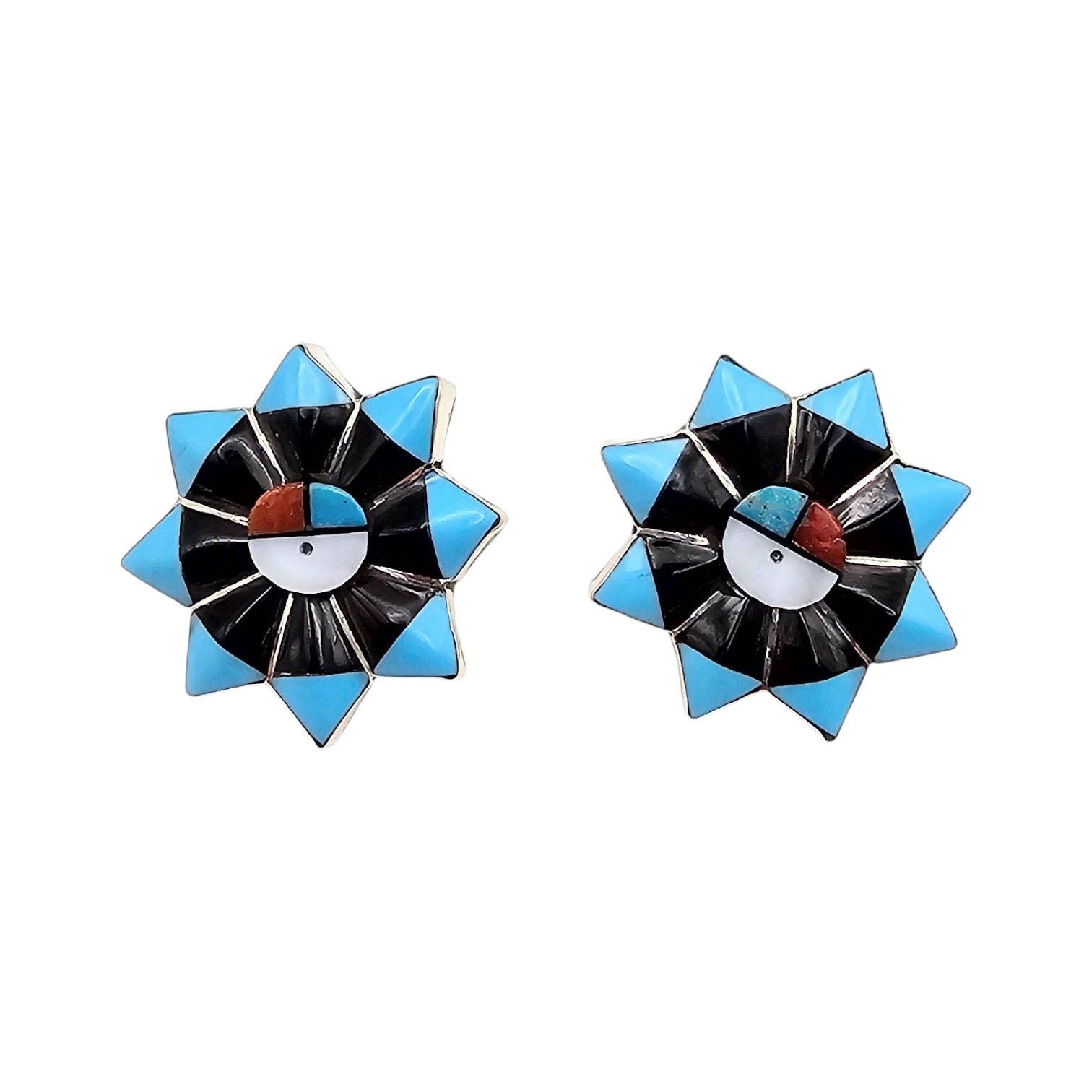 Pauline Lonjose Zuni handmade earrings crafted from sterling silver and featuring a Multi-Stone inlay design. The earrings showcase a unique starburst design with turquoise, onyx, mother-of-pearl, and red coral stones. Each earring weighs a total of 8 grams combined. These earrings are signed on the back and are handmade by the Zuni artist Pauline Lonjose.