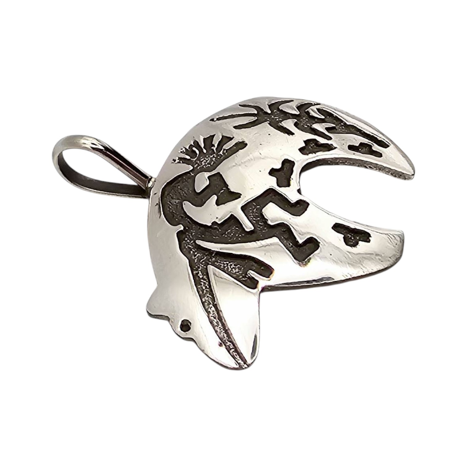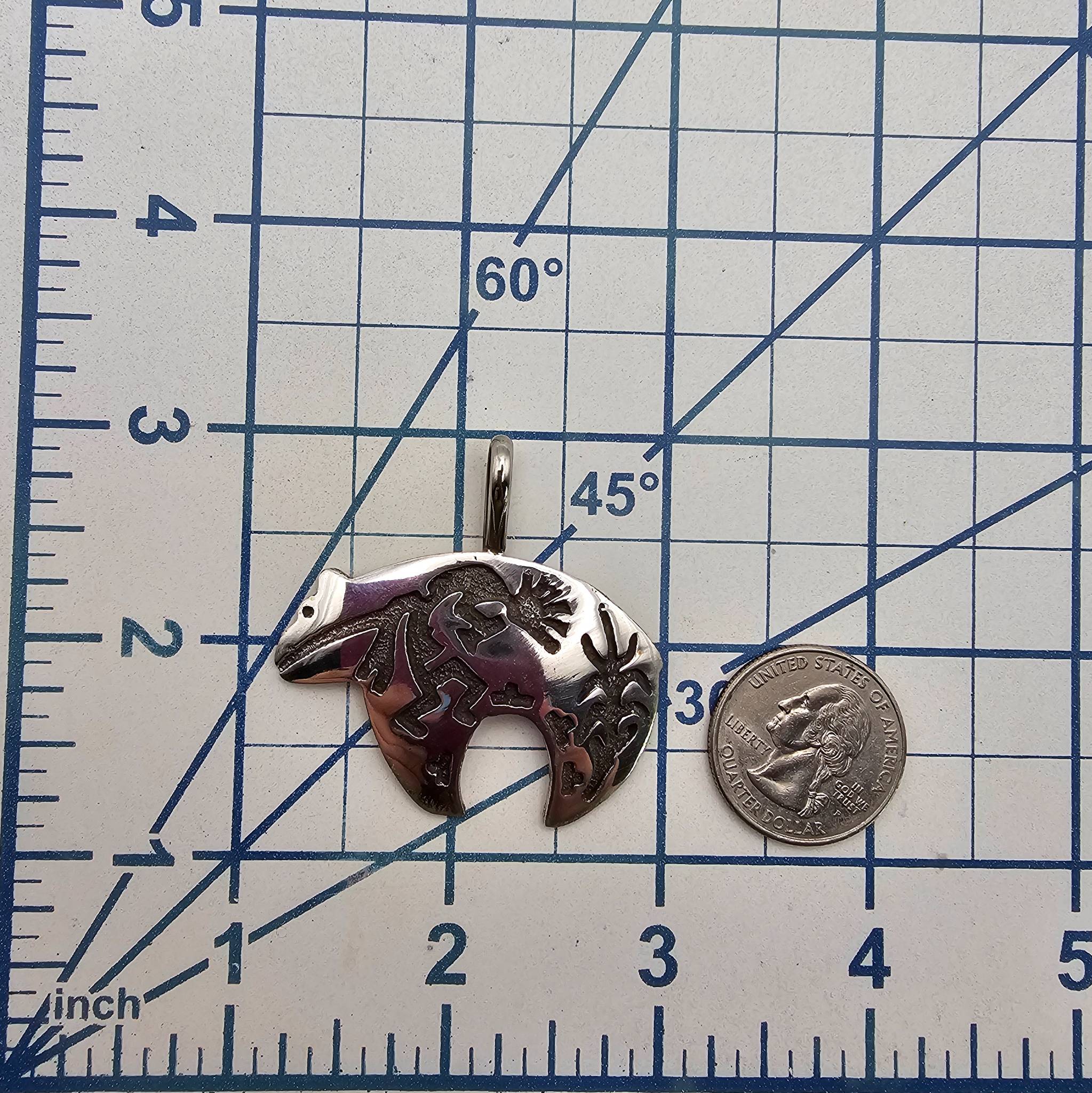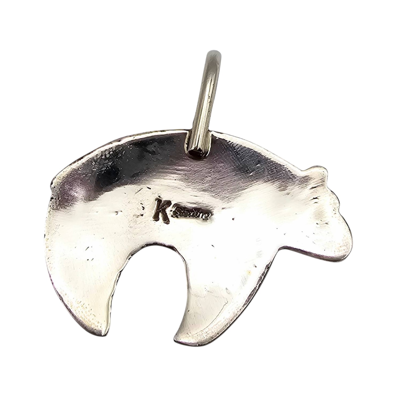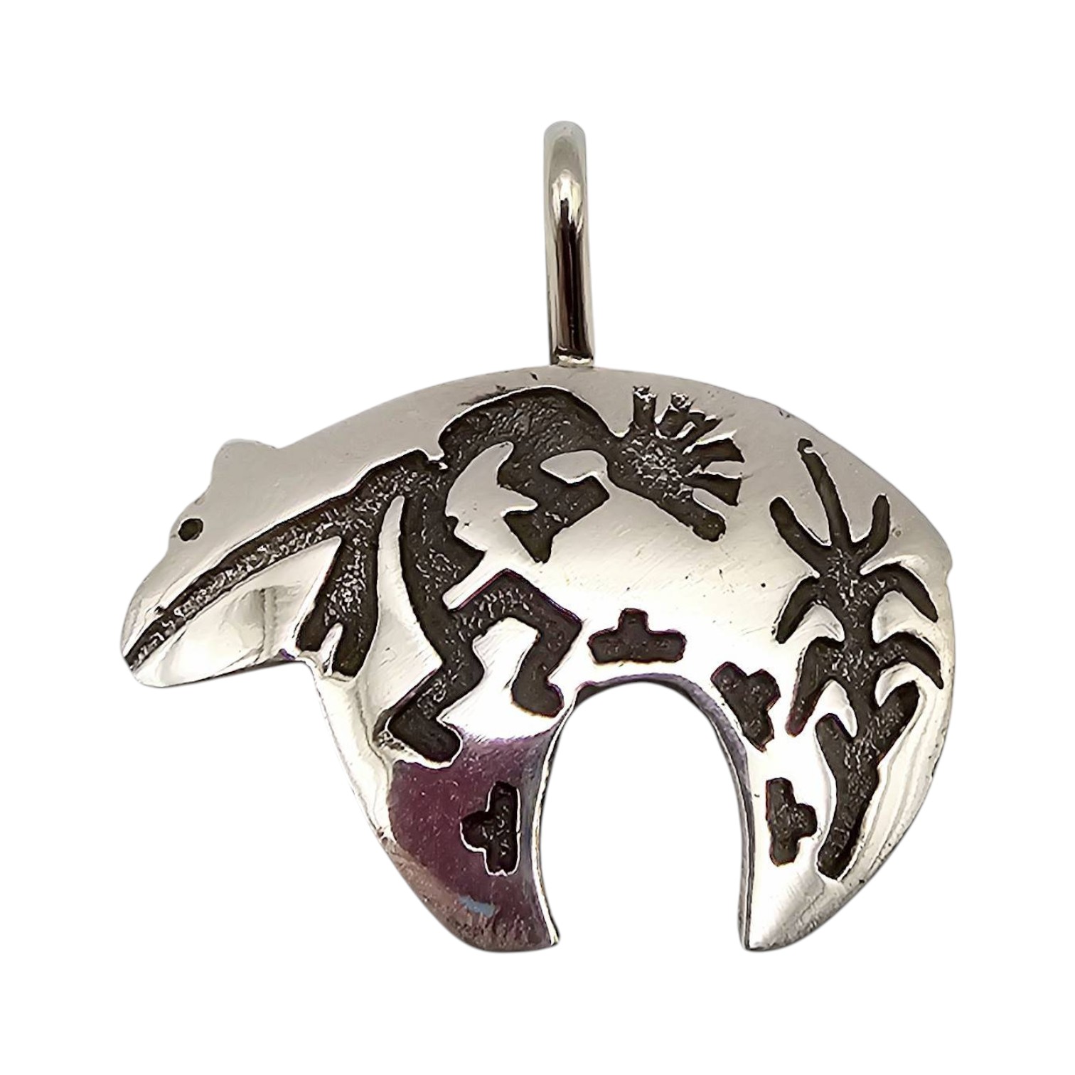Sterling silver bear-shaped pendant crafted by Navajo artisan Emerson Kinsel. Features traditional stamped designs, including kokopelli and foliage motifs. Marked ‘Kinsel’ on the reverse. Weighs approximately 13.7 grams. Measures approximately 1.5 inches wide and 2 inches tall, excluding the loop.