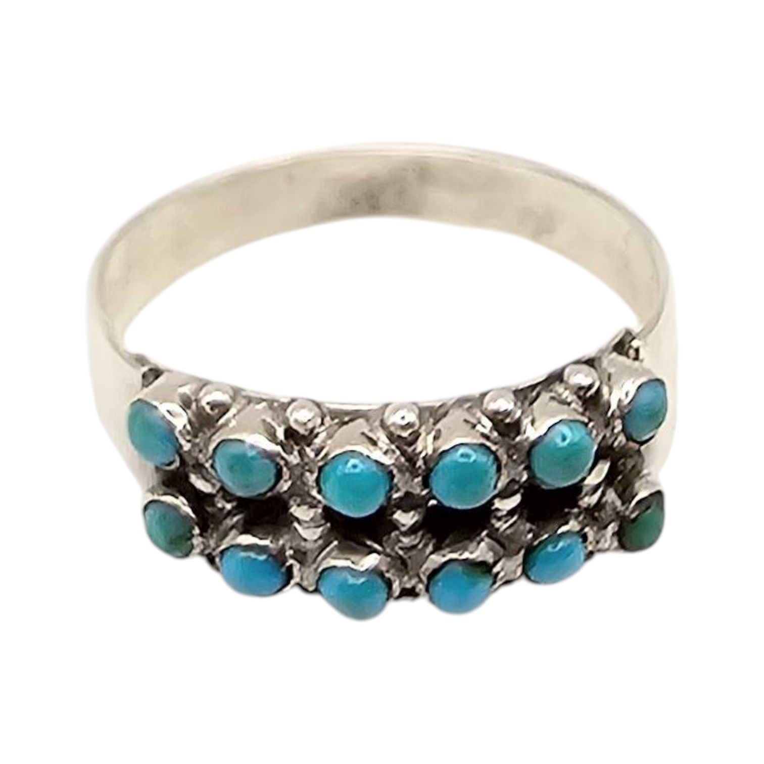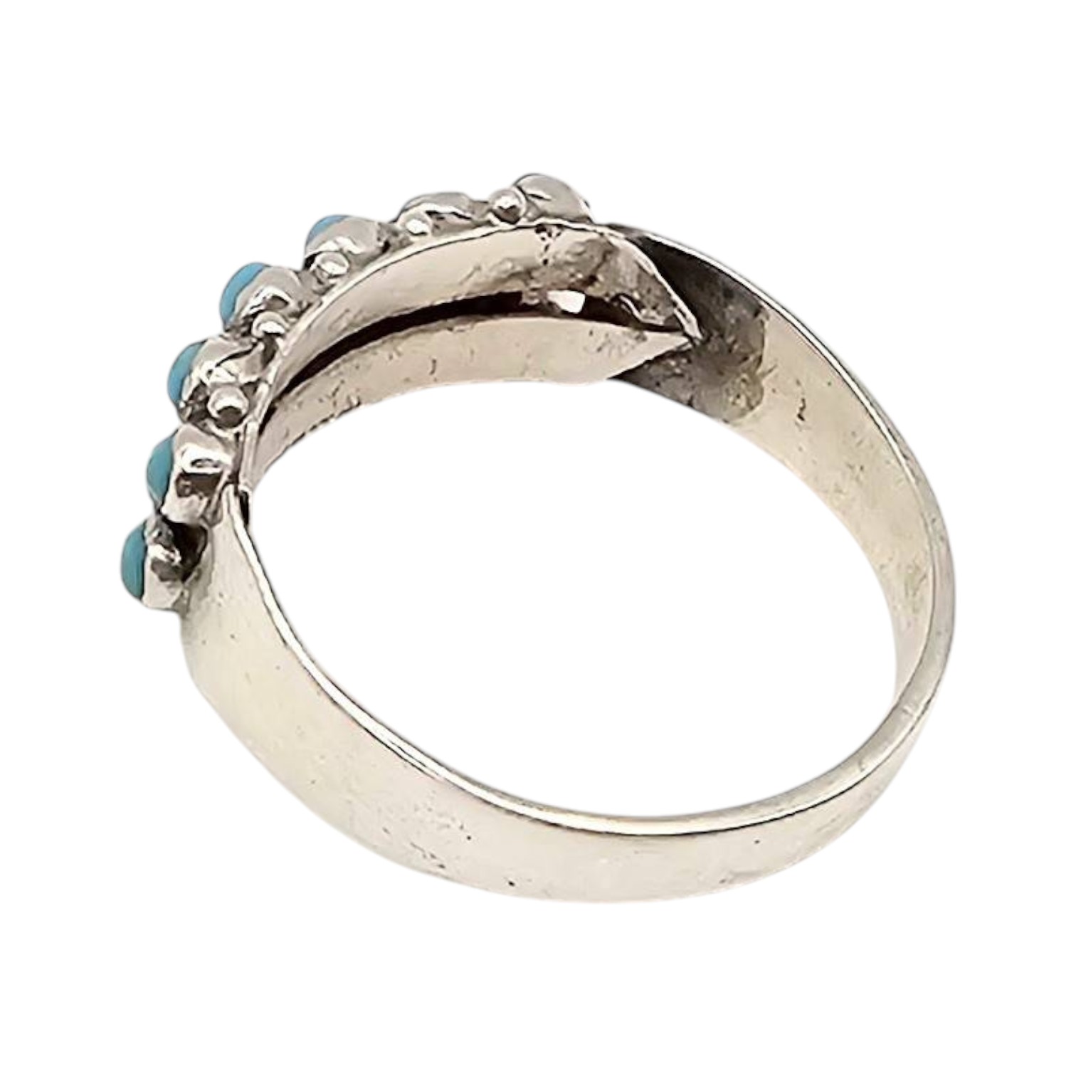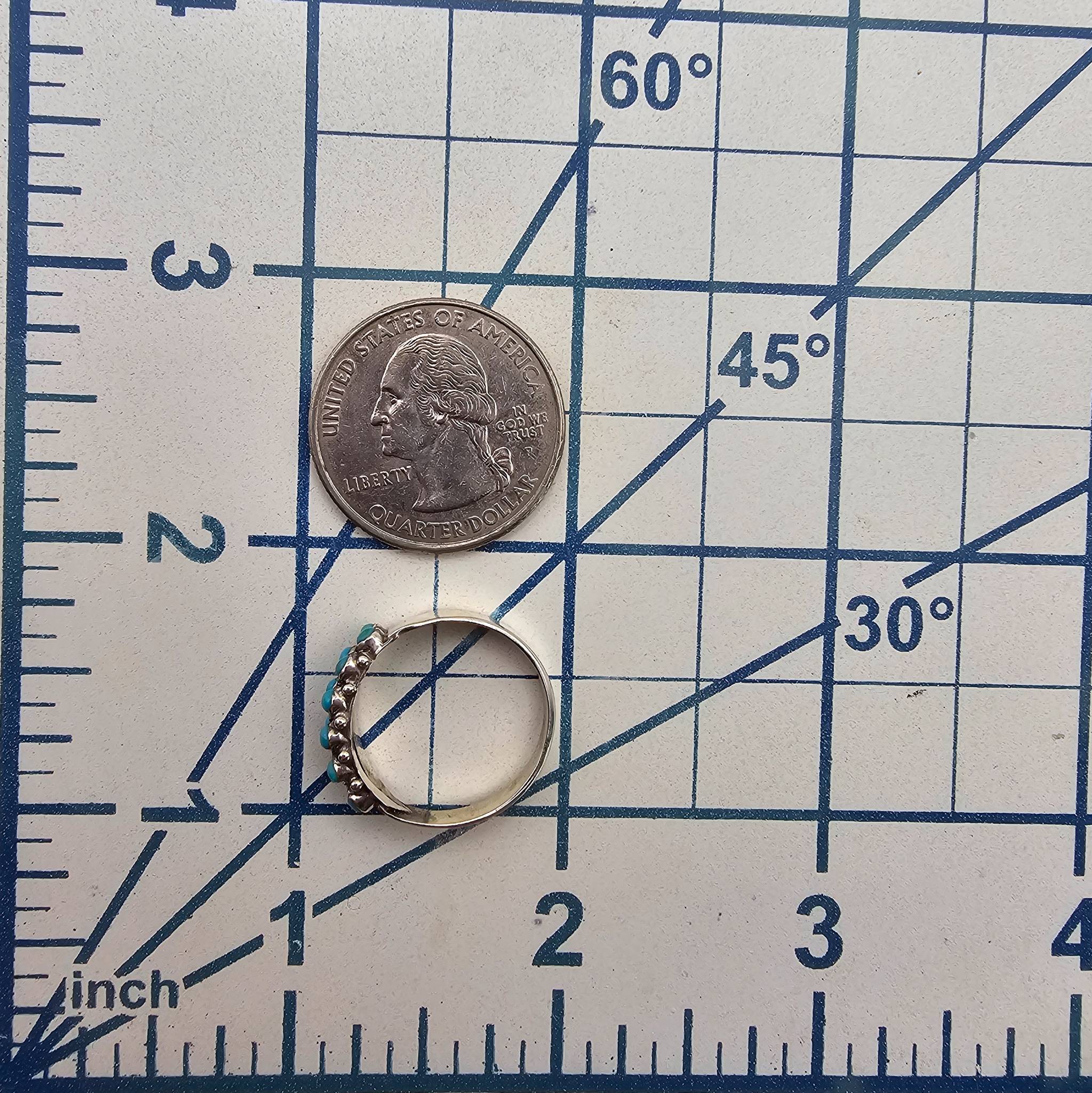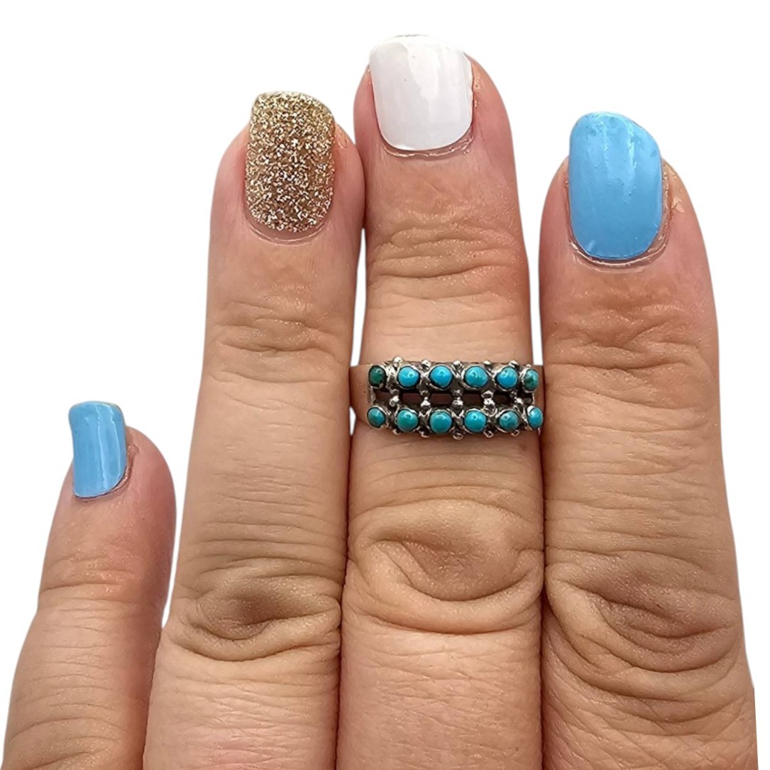 Navajo handcrafted sterling silver ring featuring a traditional snake eye design with turquoise stones. Ring size is 7.5. The weight is approximately 2.3 grams. The ring displays intricate craftsmanship with multiple turquoise cabochons in a row. A fine example of Native American artistry.