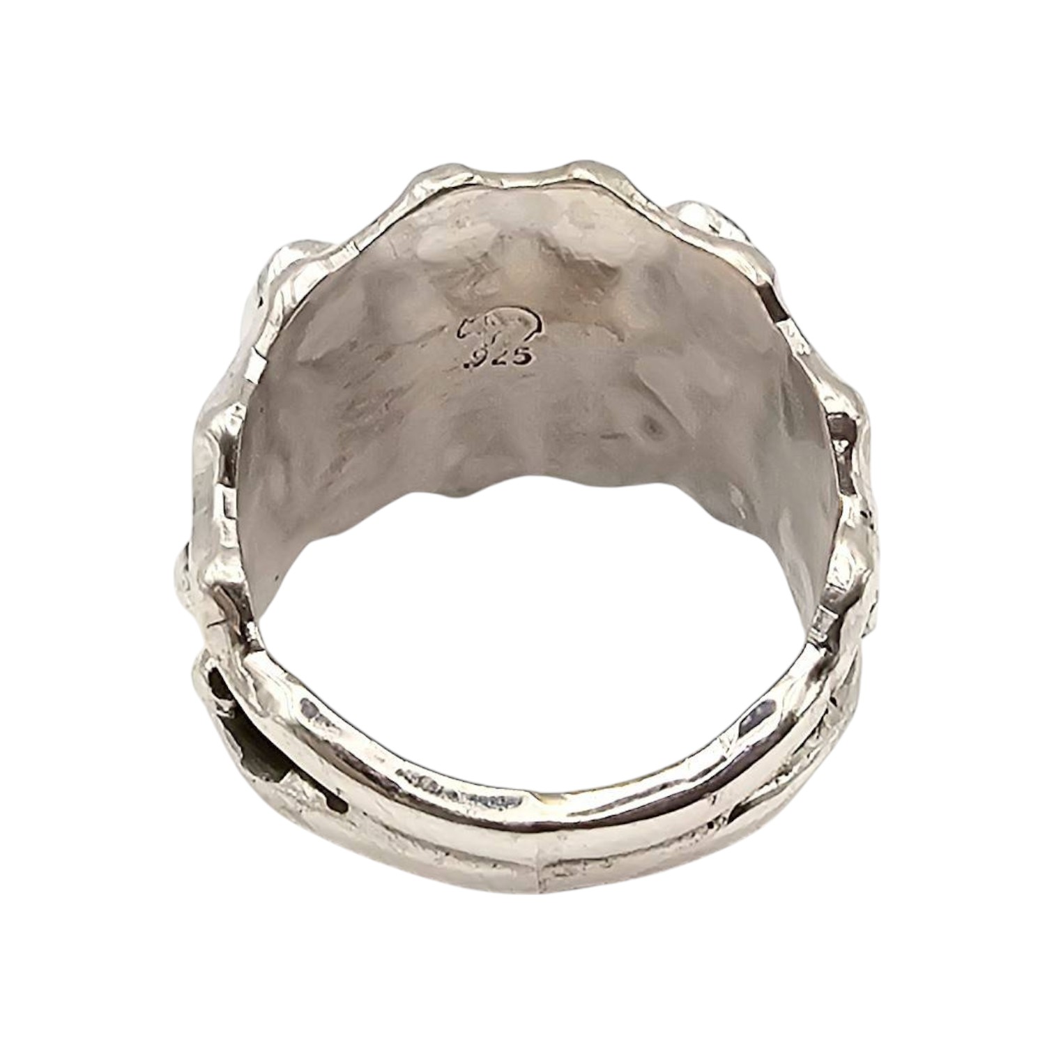 Navajo-crafted sterling silver ring by Andrew Vandever, featuring three oval-shaped purple stones with an opalescent finish. The ring has a wavy edge design, weighs 8.2 grams, sterling silver. Size appears to be suitable for a medium to large finger. The design and craftsmanship highlight traditional Navajo jewelry-making techniques. Size 8.75
