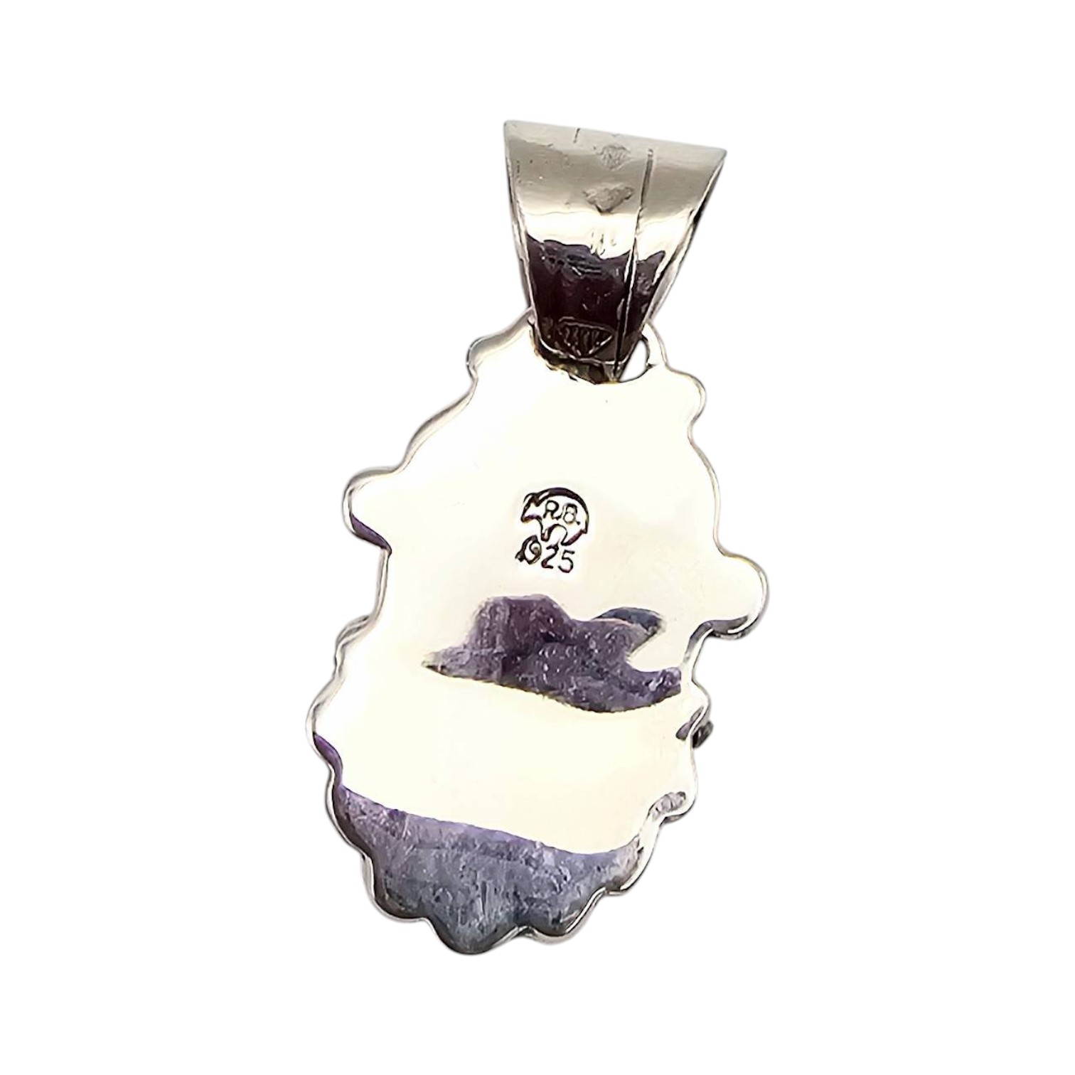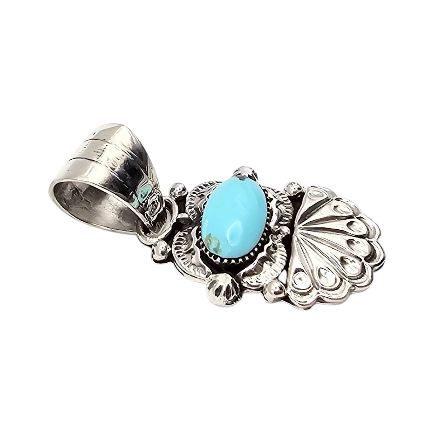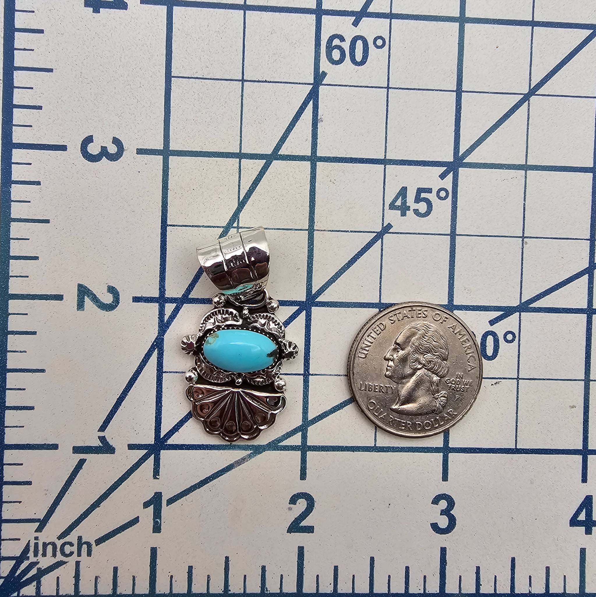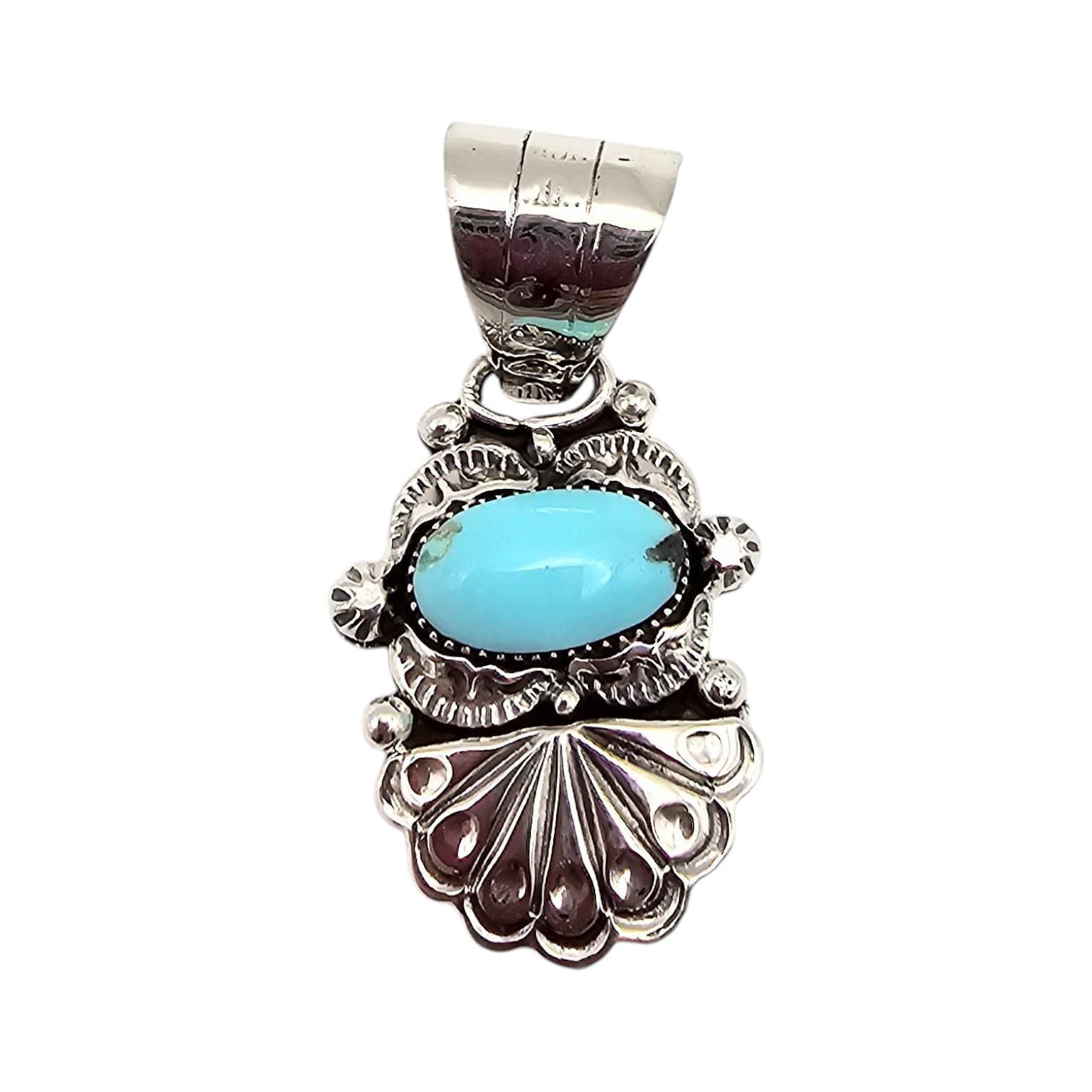 Navajo sterling silver pendant handcrafted by Phyllis A. Smith, featuring a vibrant turquoise stone in an oval bezel setting. The design includes intricate silverwork with stamped and sculptural details. Weighing approximately 7.7 grams, the pendant is marked ‘925’ and includes a large bail suitable for various chain sizes. Measures about 1.25 inches in length.