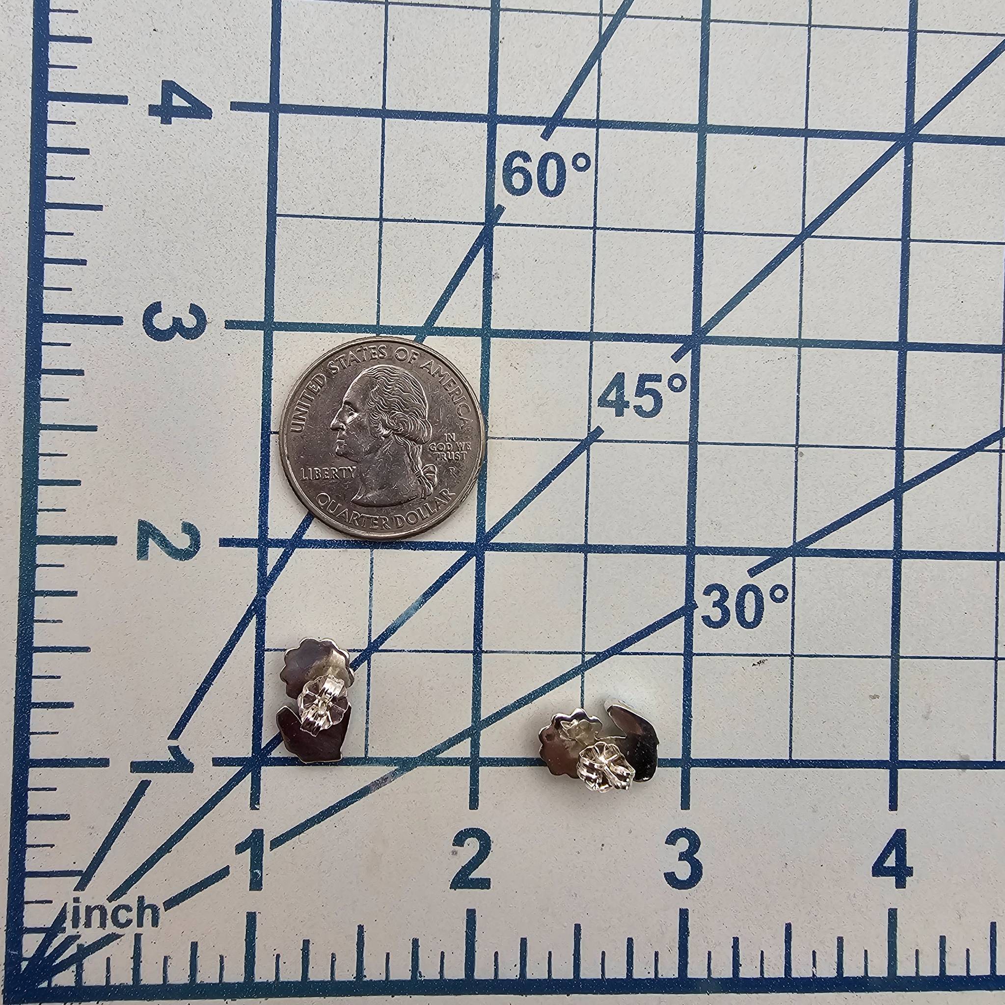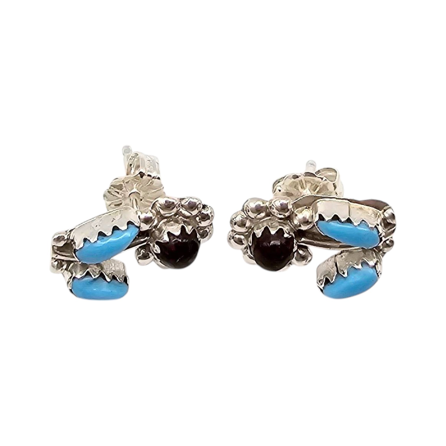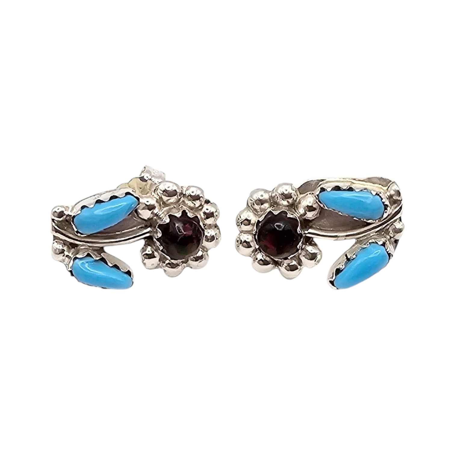 Zuni-style sterling silver flower earrings handcrafted by artist Erva Quam. Each earring features turquoise and garnet gemstone accents arranged in a floral design. The earrings are lightweight with a total weight of 1.9 grams. Includes post-back closures for secure wear. Dimensions are visible for scale against a US quarter.
