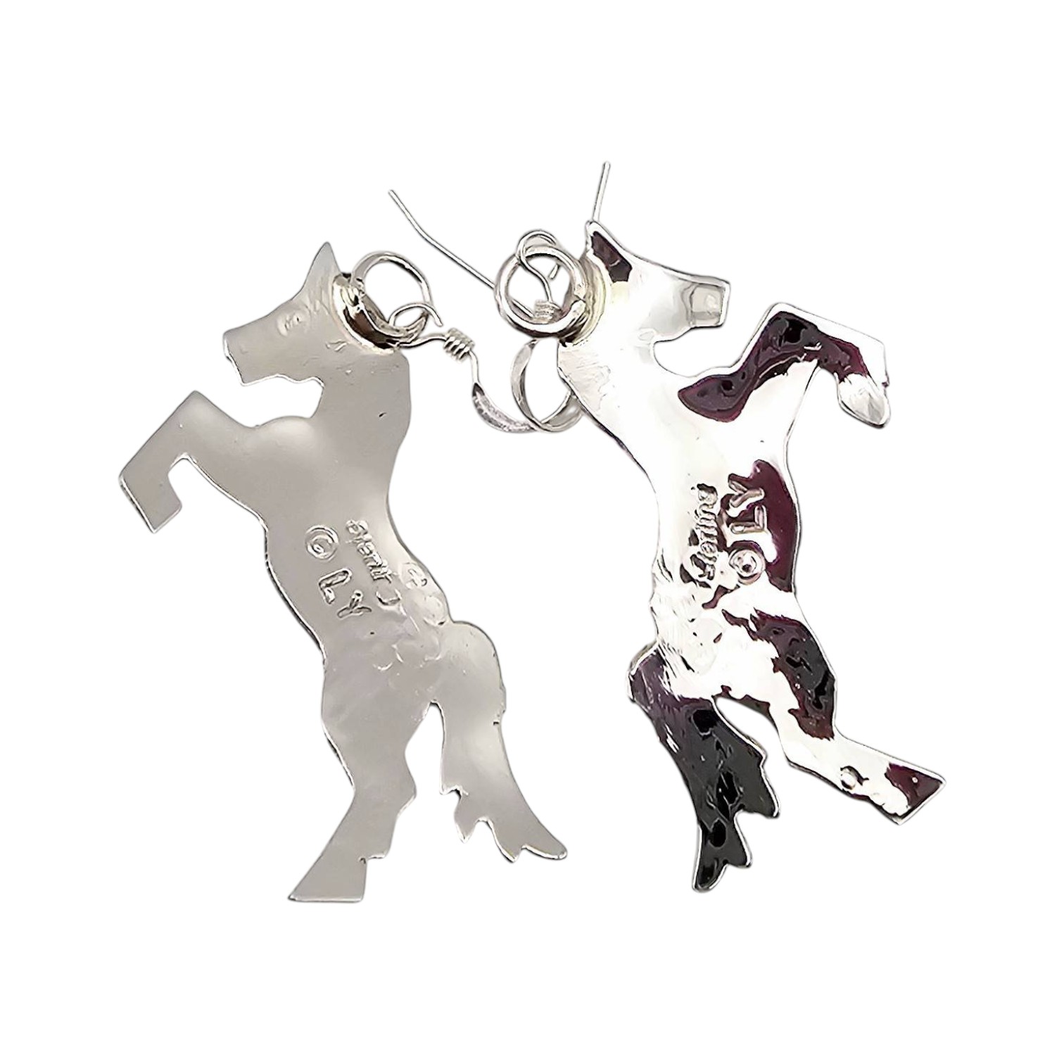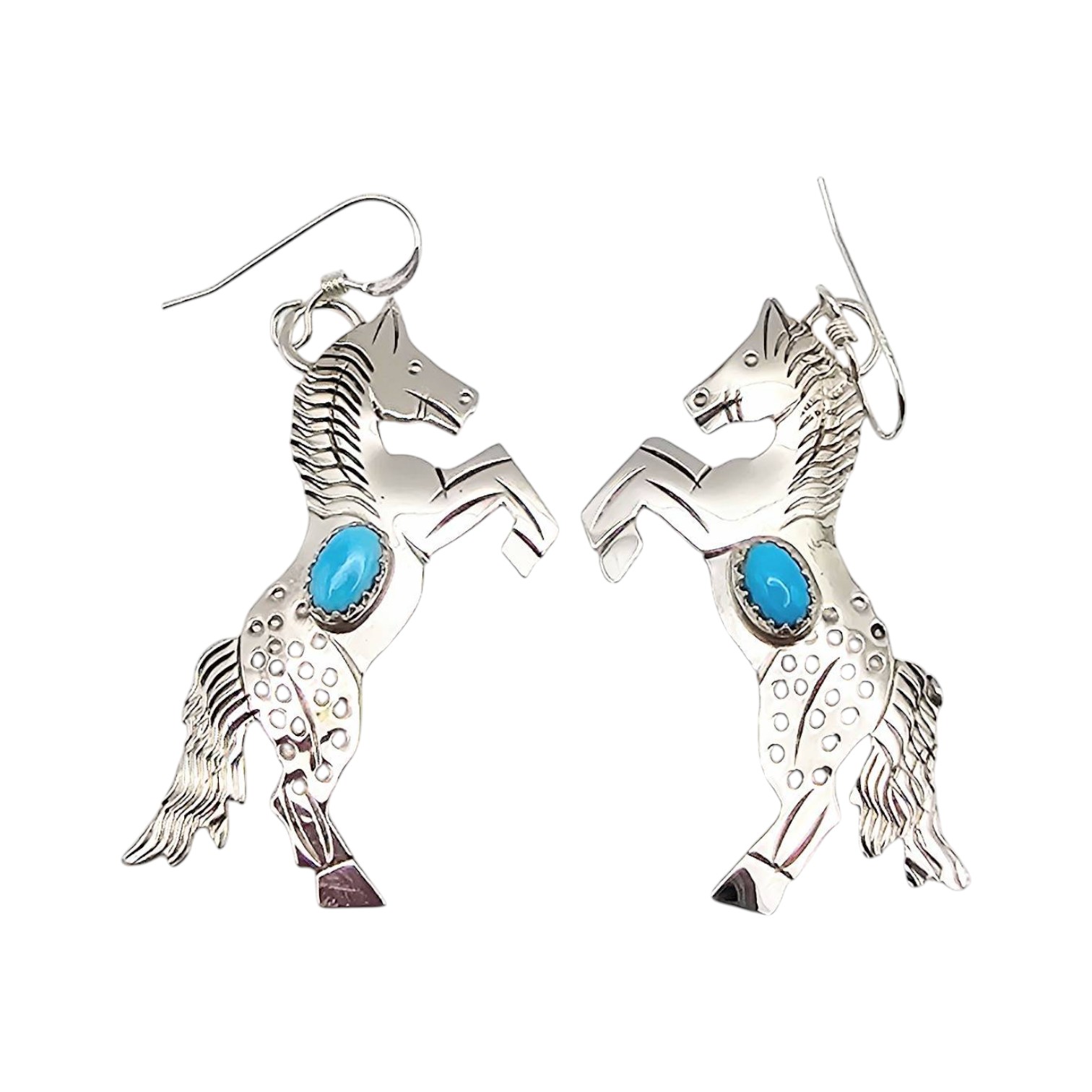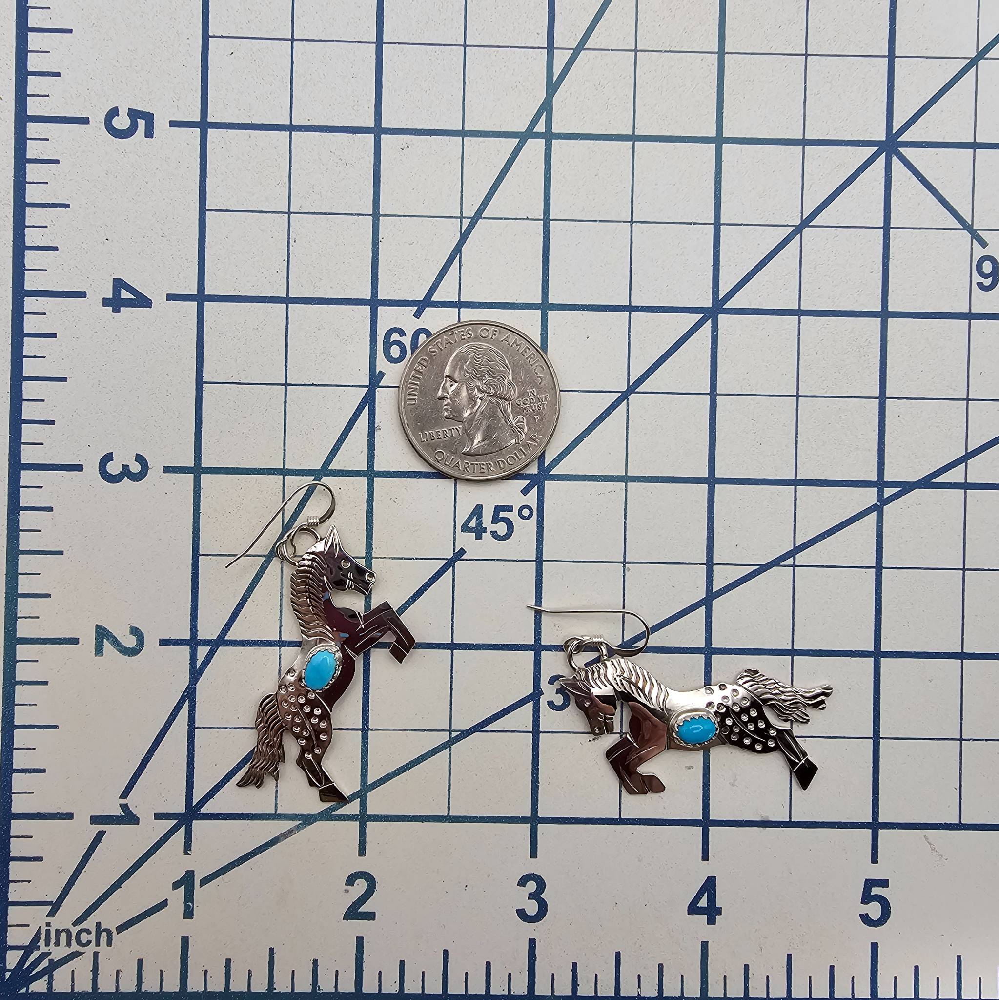 Sterling silver horse-themed earrings handcrafted by Navajo artisan Louise Yazzie. Embellished Horse with turquoise stones and detailed stamping. Marked on the reverse side. Total weight: 5.5 grams. Approximate dimensions available on scale comparison image.