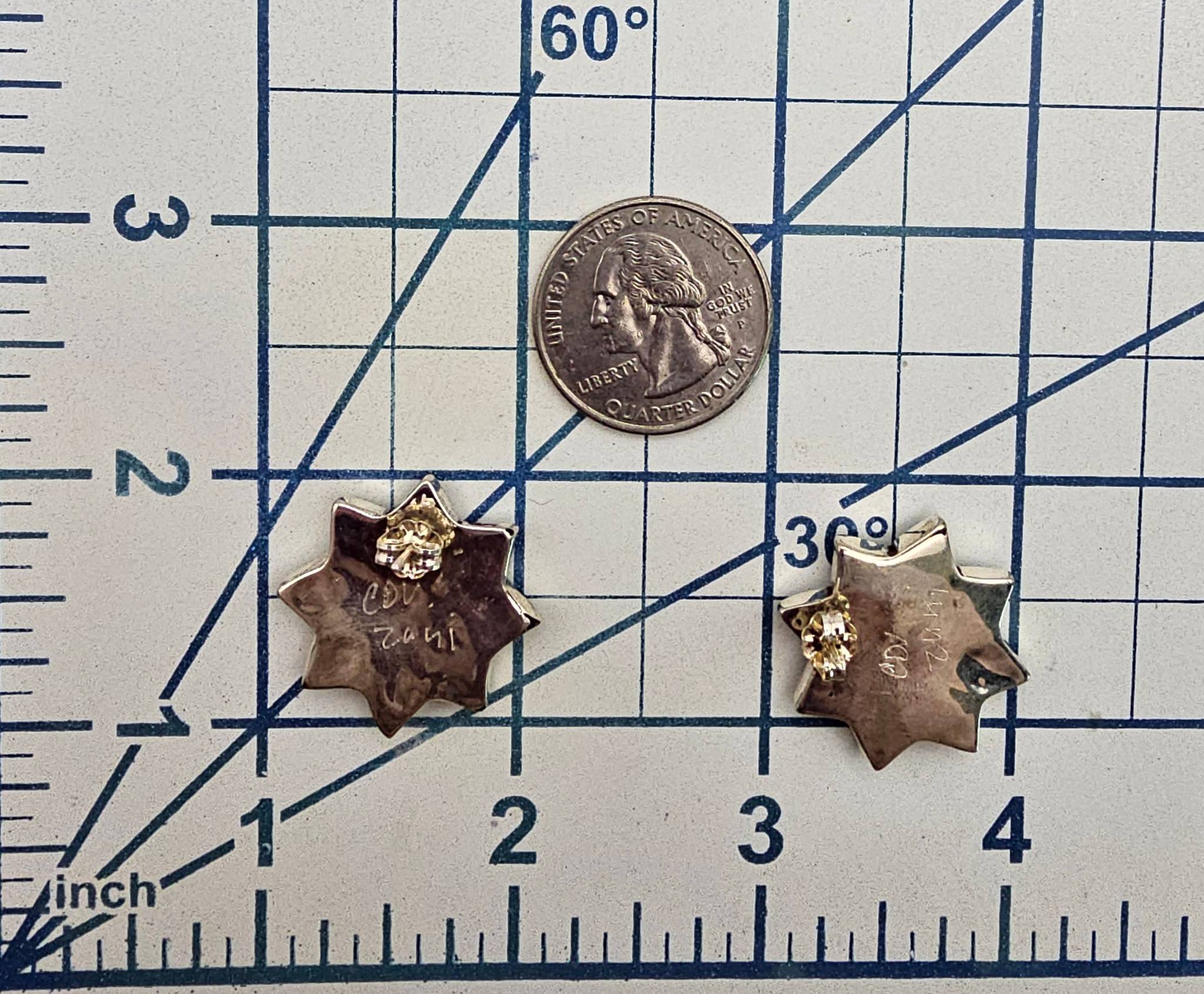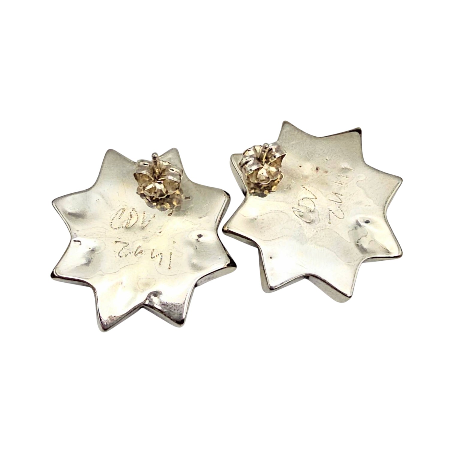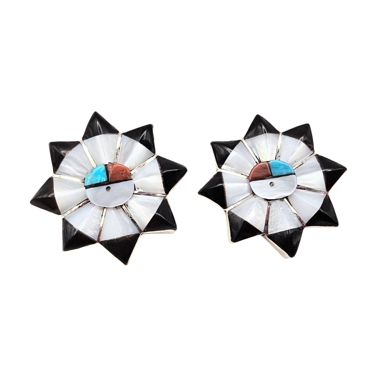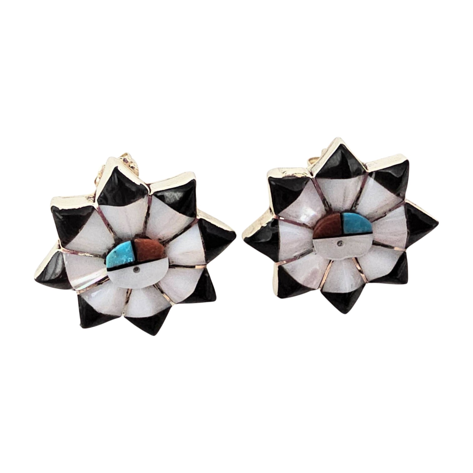 Zuni handmade earrings by Pauline Lonjose, crafted in sterling silver with inlay showcasing black onyx, mother of pearl, turquoise, and coral stones in a starburst design. The earrings are marked on the back and come with secure post backs. Each earring weighs approximately 3.9 grams with a combined total of 7.8 grams.