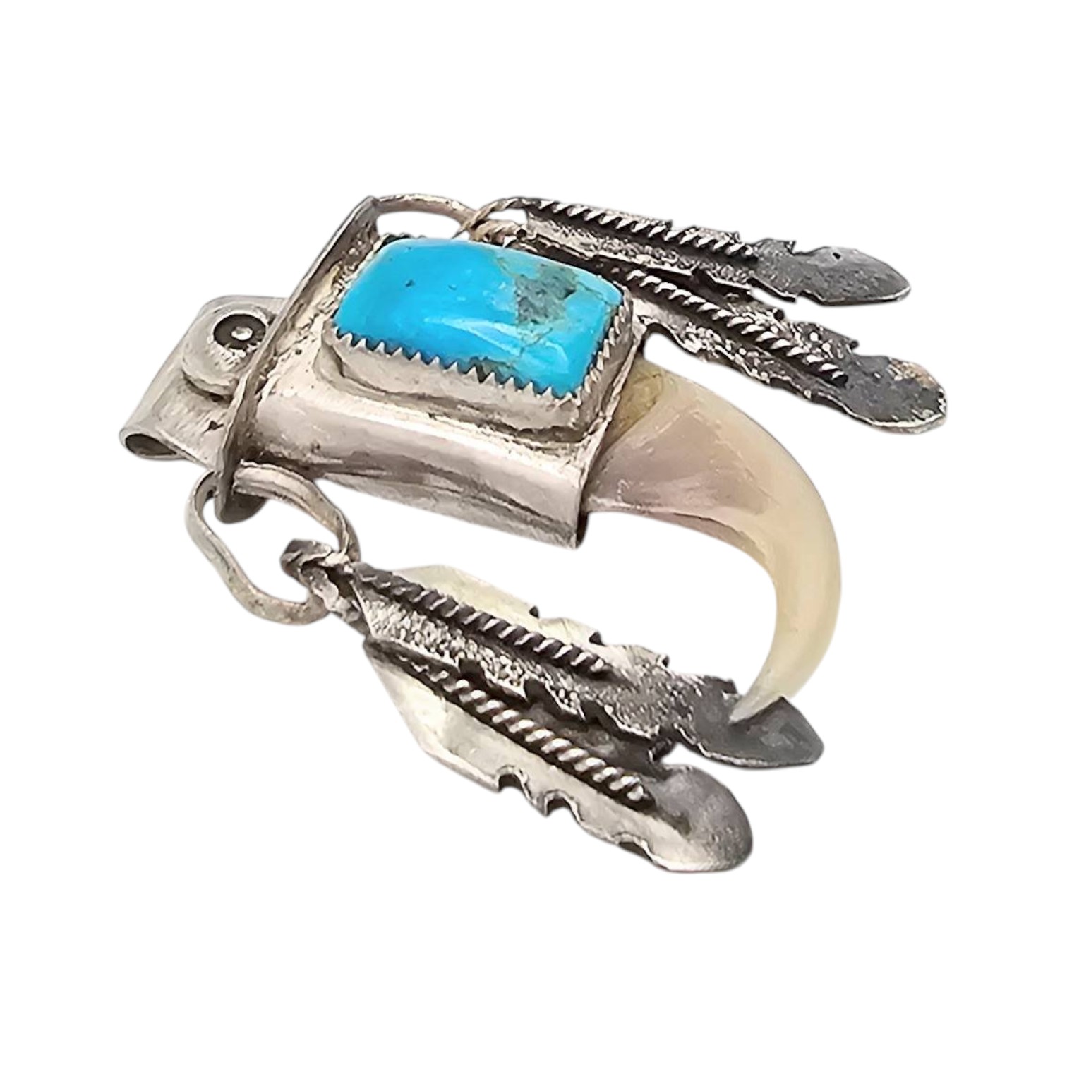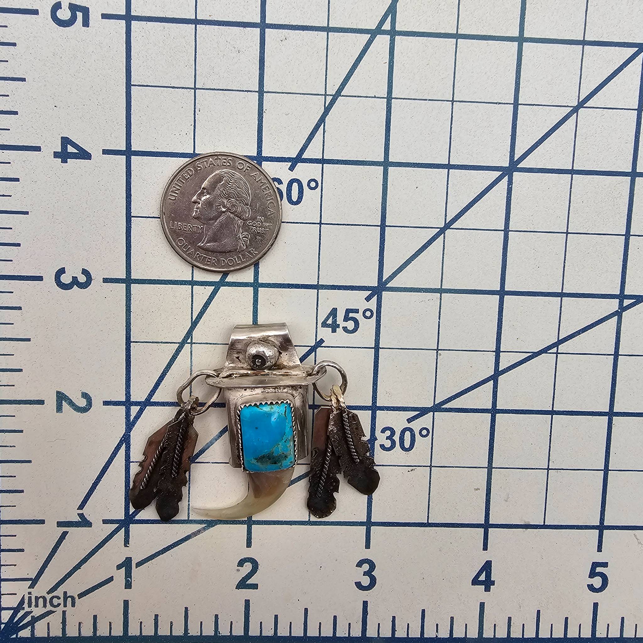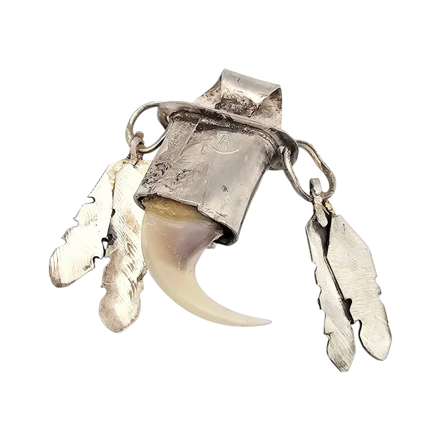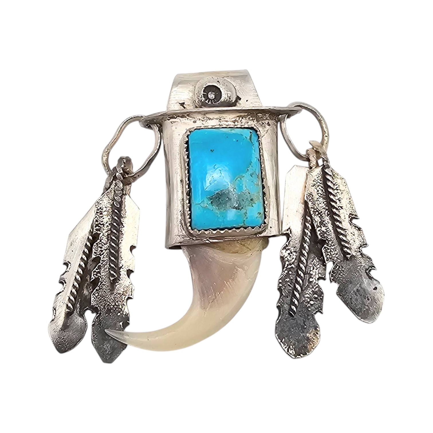 Signed R Southwestern-style pendant featuring a sterling silver construction with a natural bear claw and a turquoise set in a bezel setting. The pendant includes three feather-style silver dangles. Weighs approximately 14 grams and measures roughly 2 inches tall. Notable for its craftsmanship and meaningful cultural style.