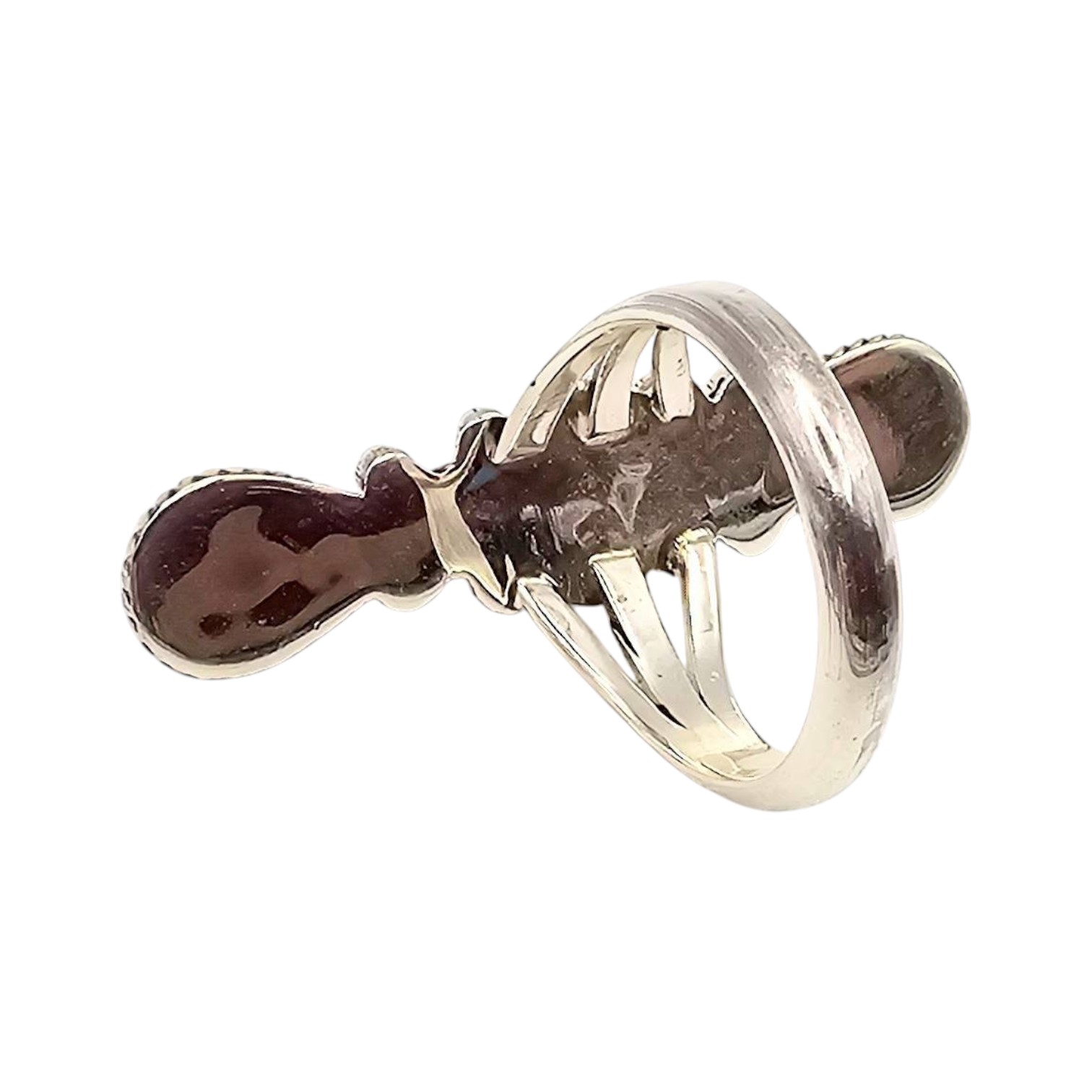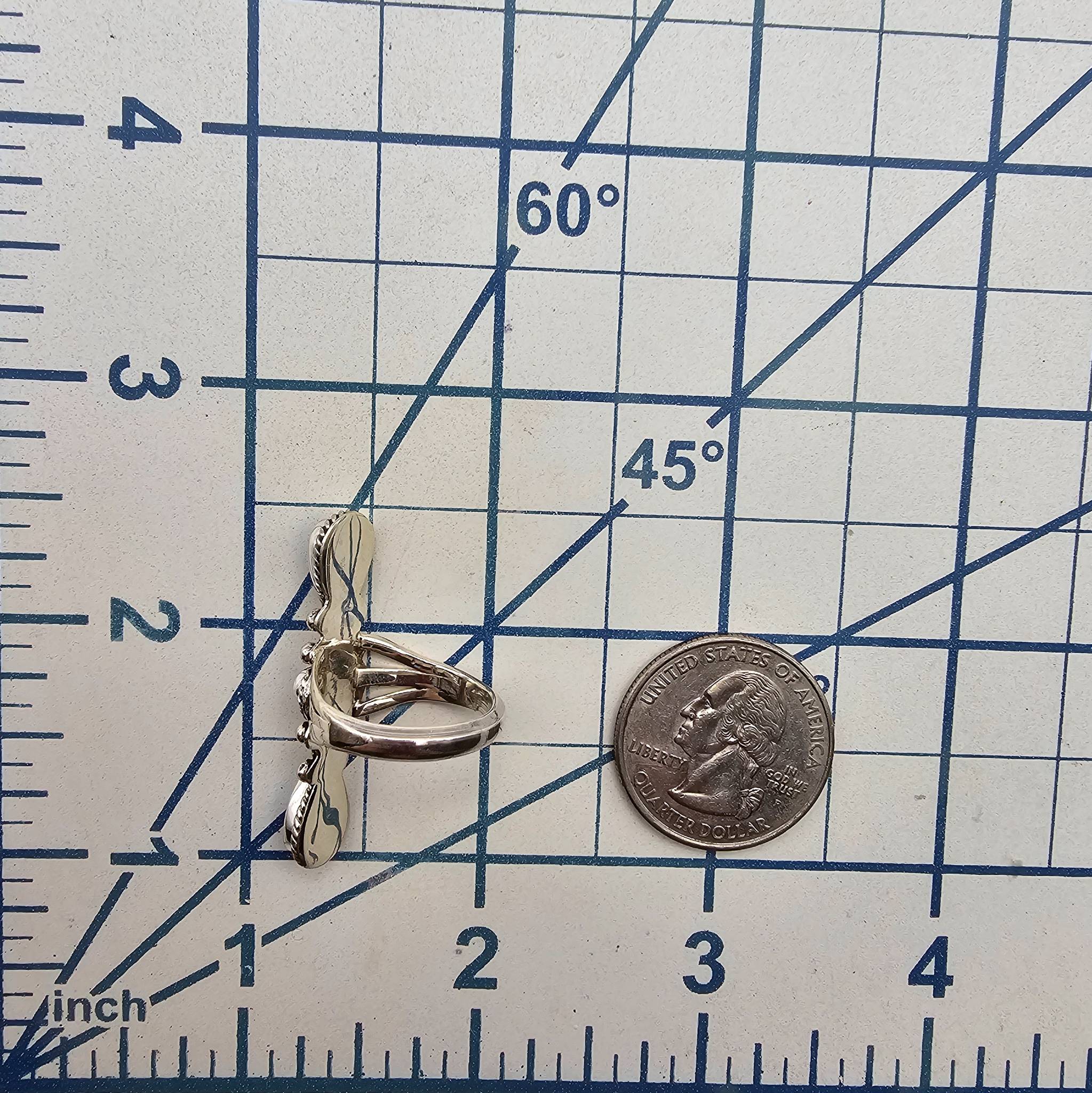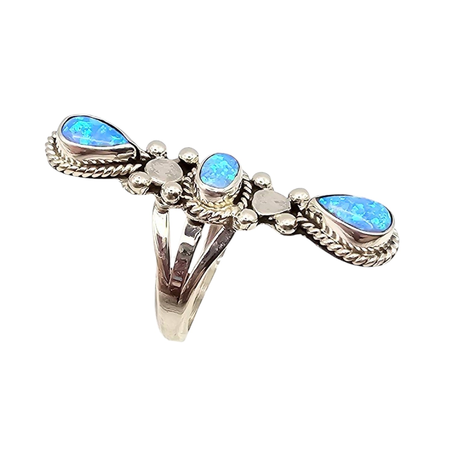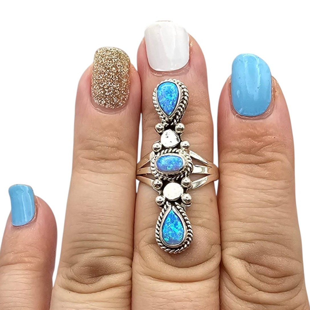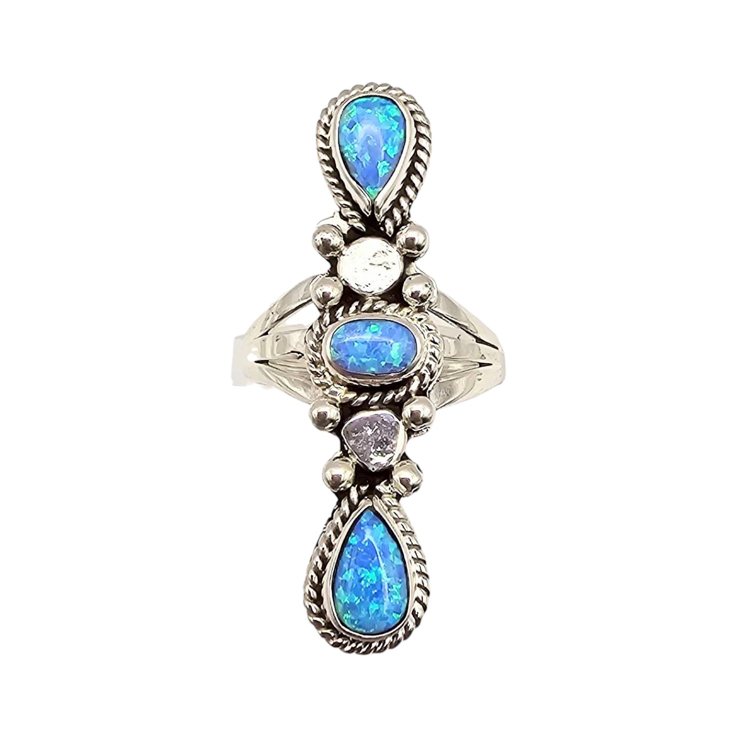 A Navajo sterling silver ring by artisan Jimson Belin, featuring a vertical design with three opal stones accented by polished silver beads and braided detailing. The ring weighs 5.1 grams and is approximately 2 inches in length. Size 6 Fine example of handcrafted Native American jewelry.