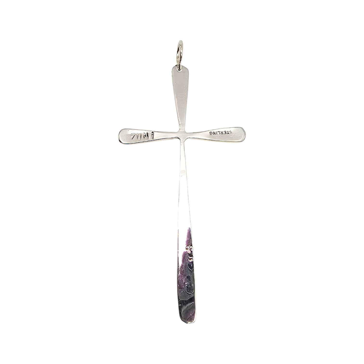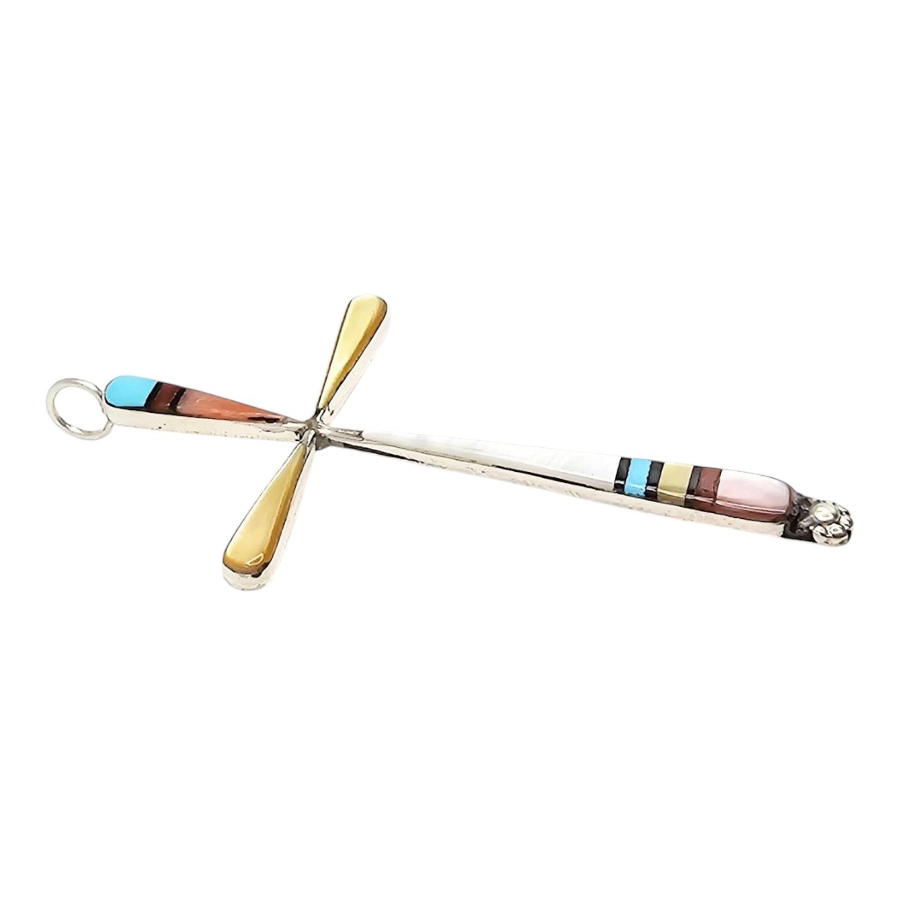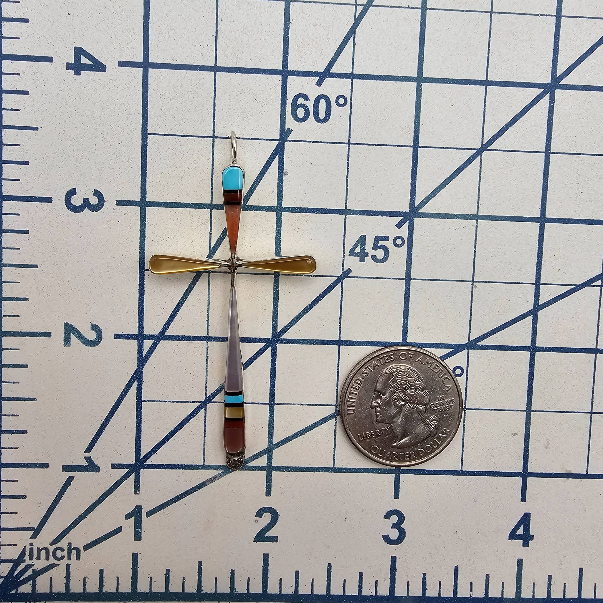 Zuni-crafted cross pendant by Lynette Bowannie, featuring sterling silver construction with intricate inlay detail using turquoise, coral, onyx, and shell. The reverse side is stamped with maker’s mark and material. Measures approximately 2.9 inches in length and weighs 2.6 grams. Includes an attached loop for necklace use and displays excellent craftsmanship.