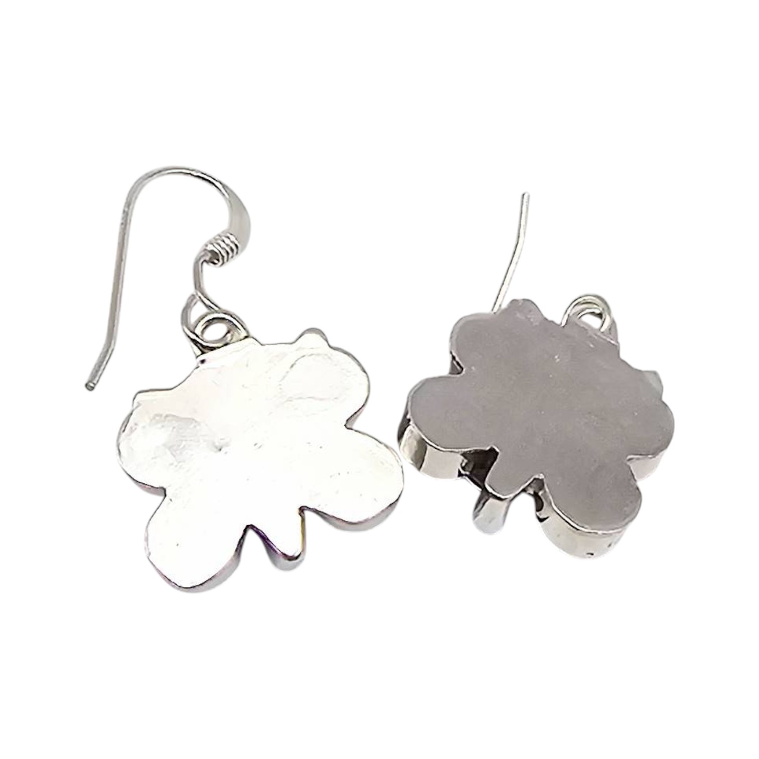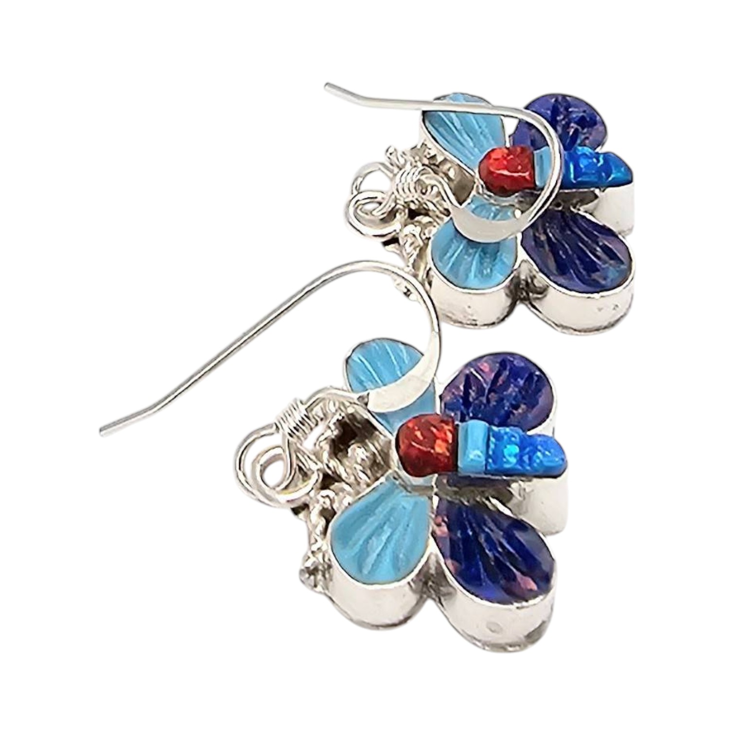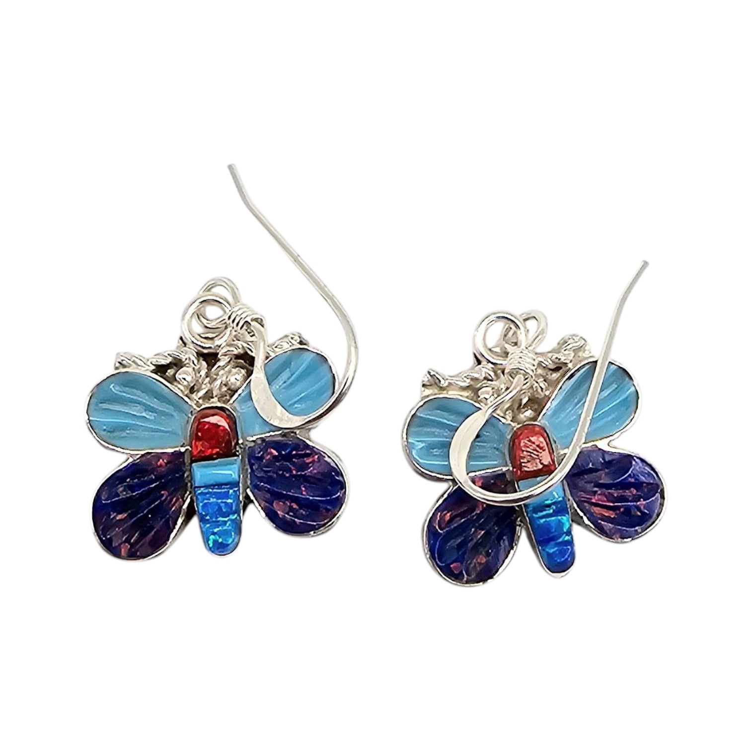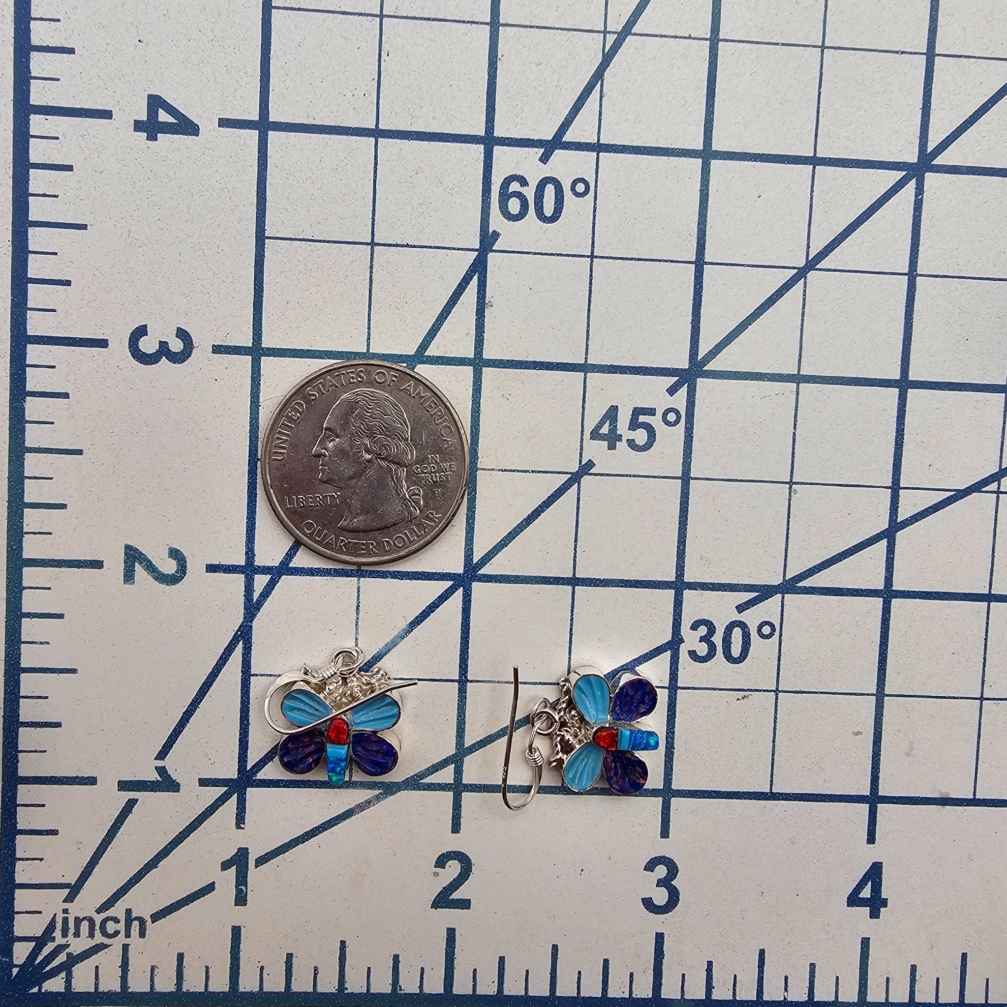 Zuni-made sterling silver butterfly earrings by artisan Erva Quam. These earrings feature inlaid designs with vibrant materials in shades of blue, red, and purple, done using the traditional Zuni mosaic inlay technique. Weighing approximately 3.3 grams, they measure about an inch in height, with fish hook wire backs for pierced ears. The back of each earring is polished silver.