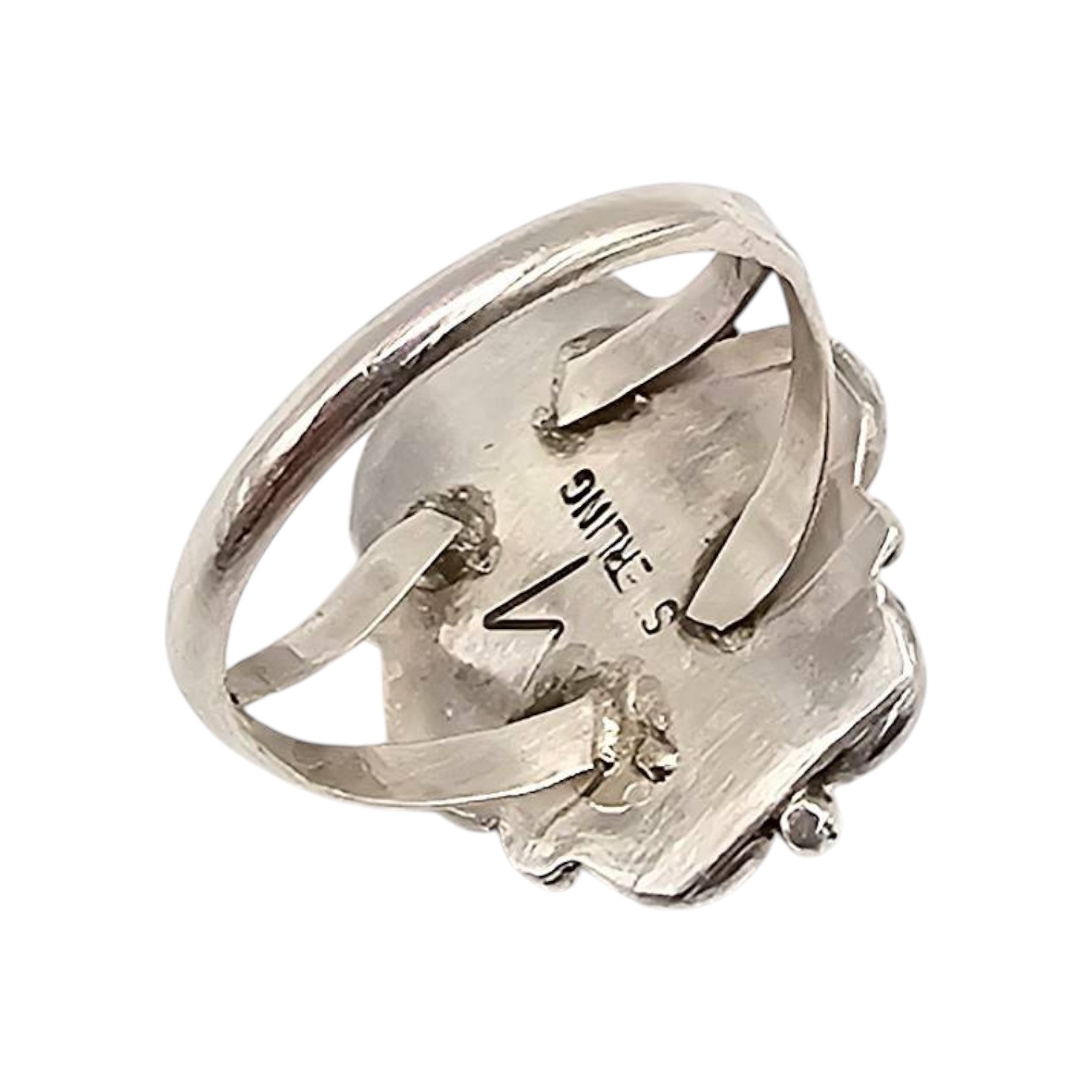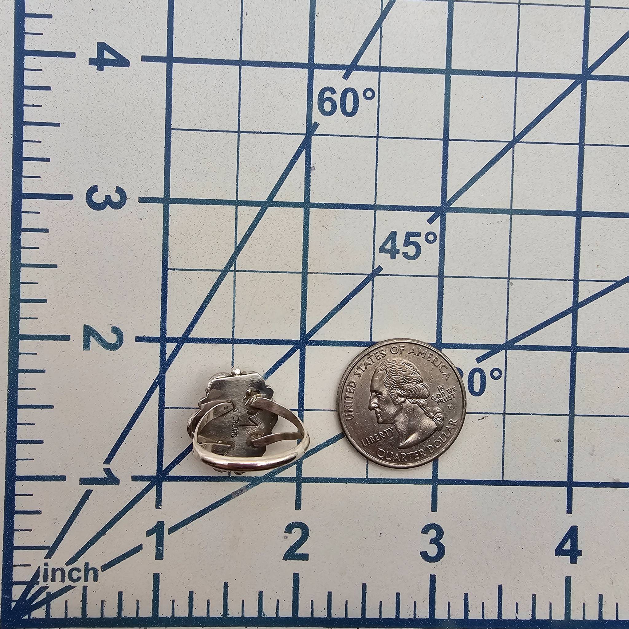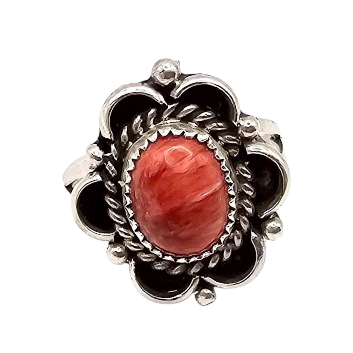 Sterling silver ring handmade by Navajo artisan Freda Martinez, featuring a spiny oyster stone set in a decorative floral bezel design. Weighs approximately 3.5 grams and measures as size 6. Back of the ring is stamped ‘STERLING’ and bears the artist’s hallmark. Excellent craftsmanship and unique design.