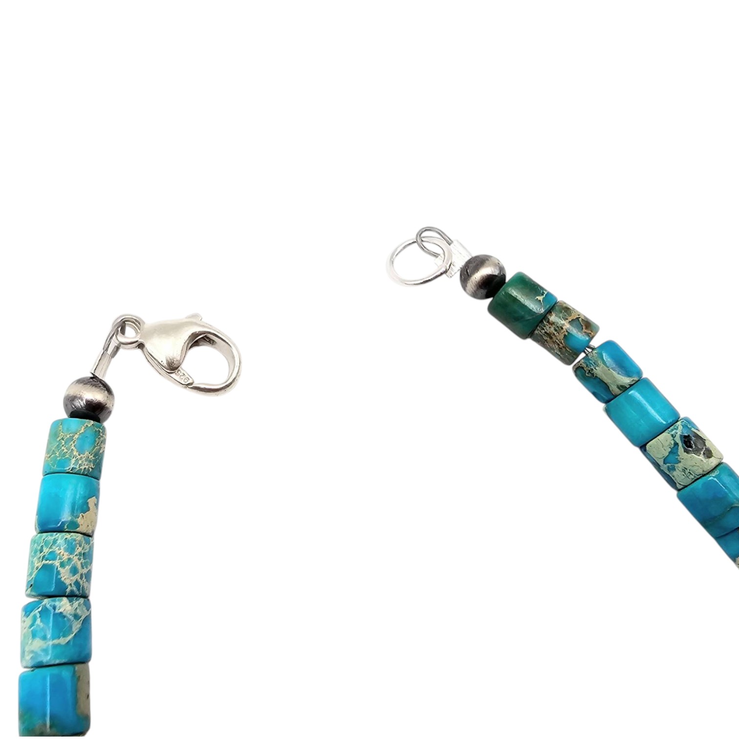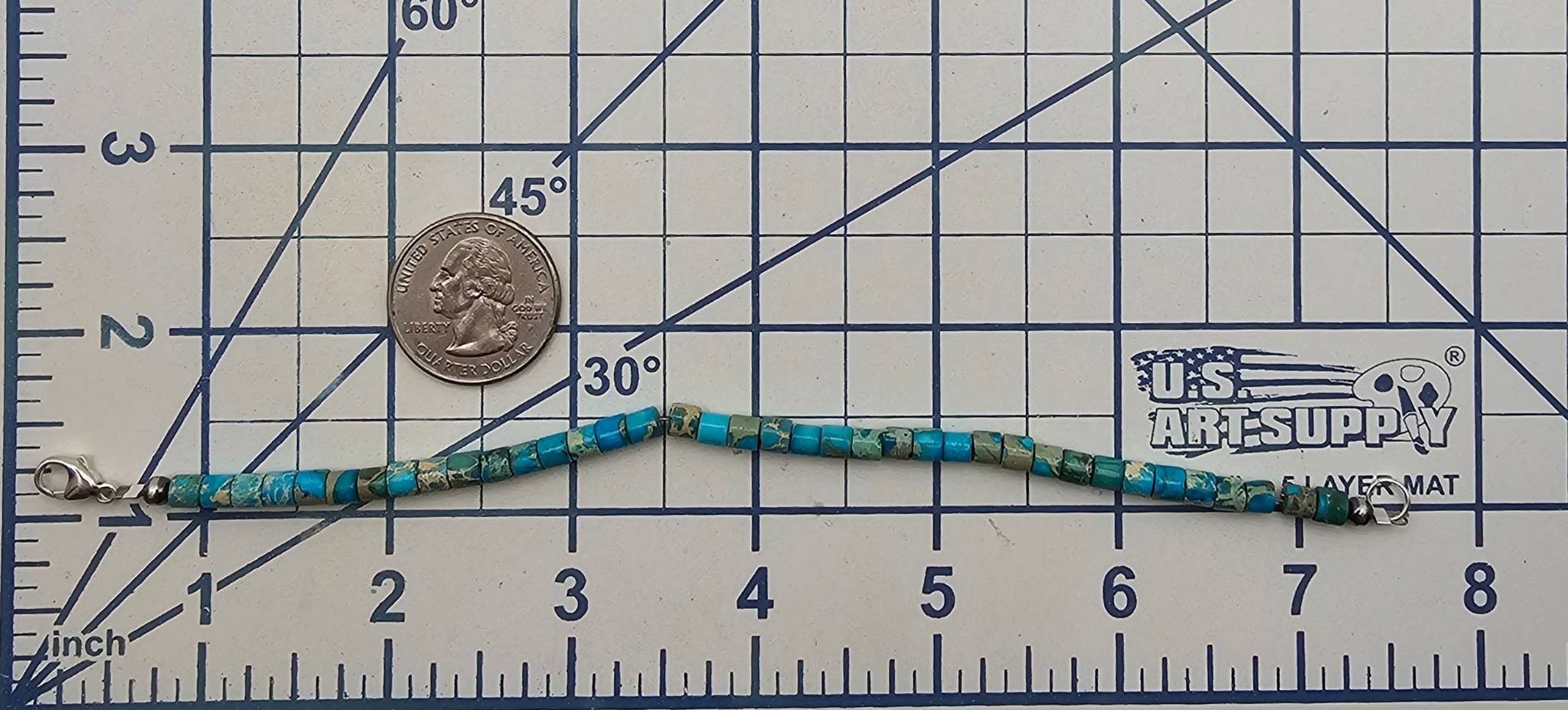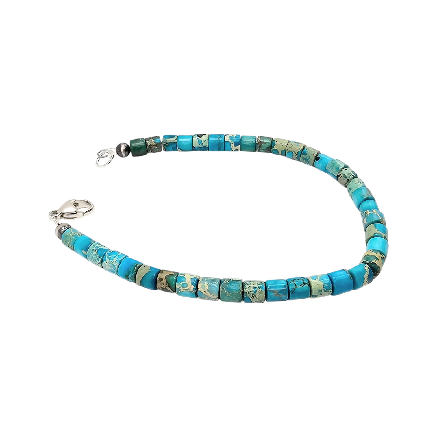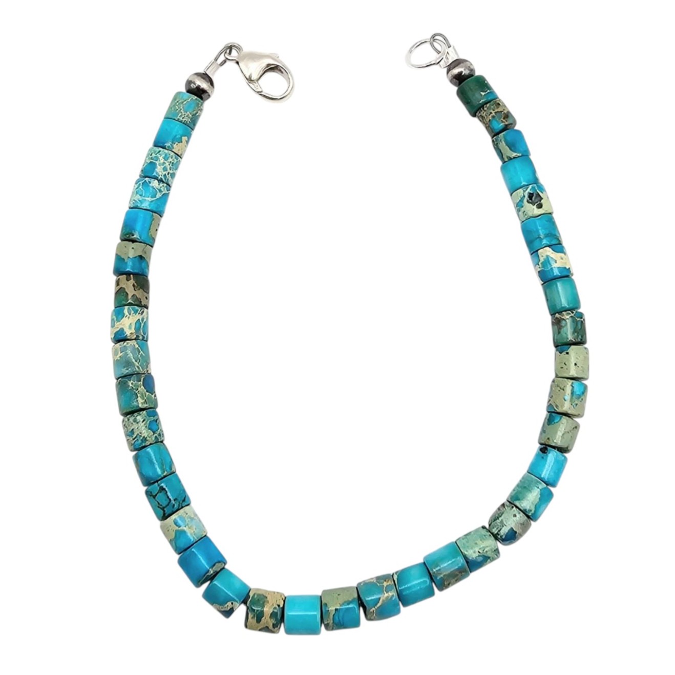 Kingman turquoise bracelet featuring highly polished turquoise cube beads and sterling silver hardware, including a lobster clasp closure. The bracelet weighs 6.4 grams and measures approximately 7 inches in length. The turquoise showcases natural variations in color and matrix patterns, unique to the Kingman mine.