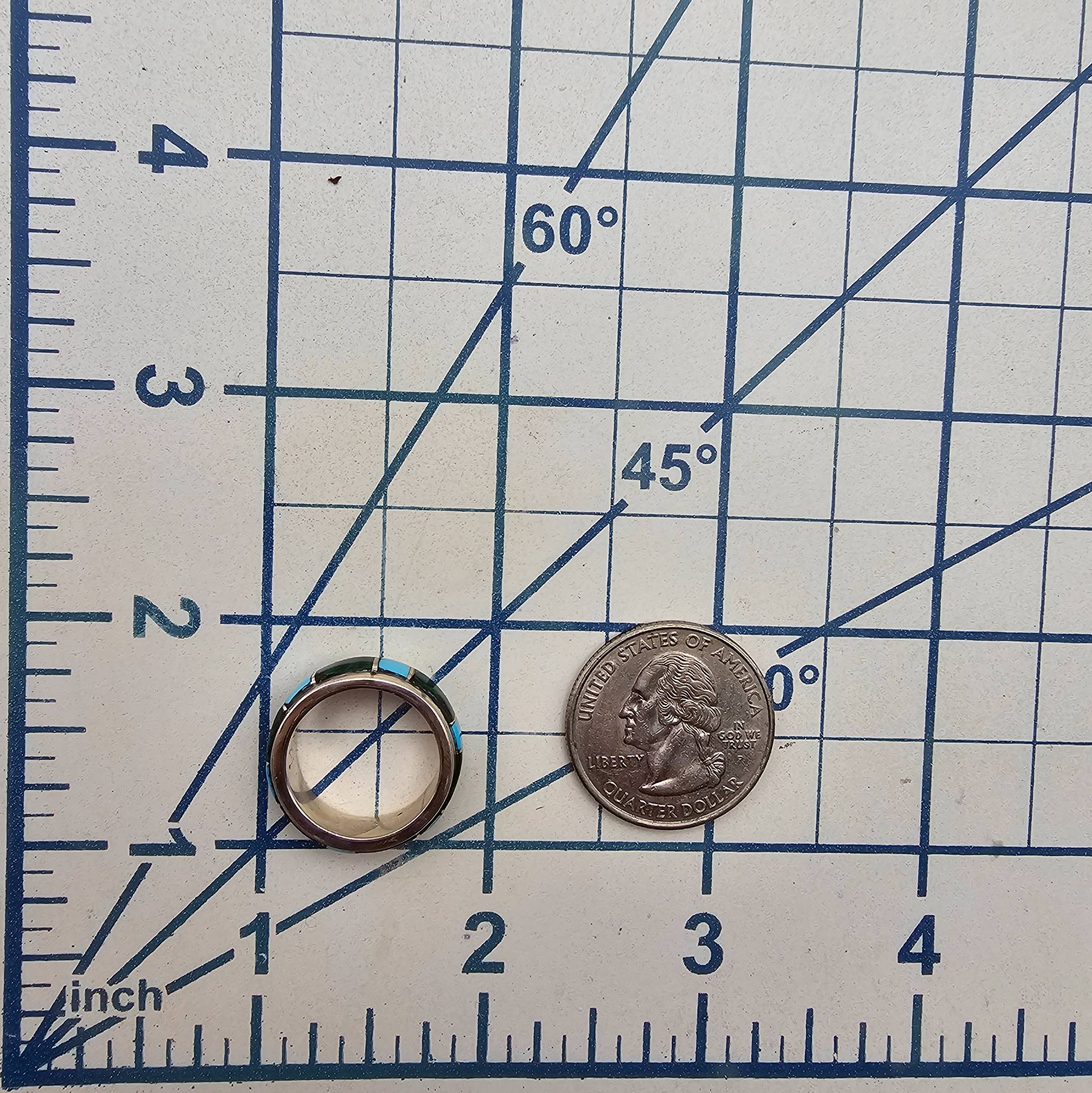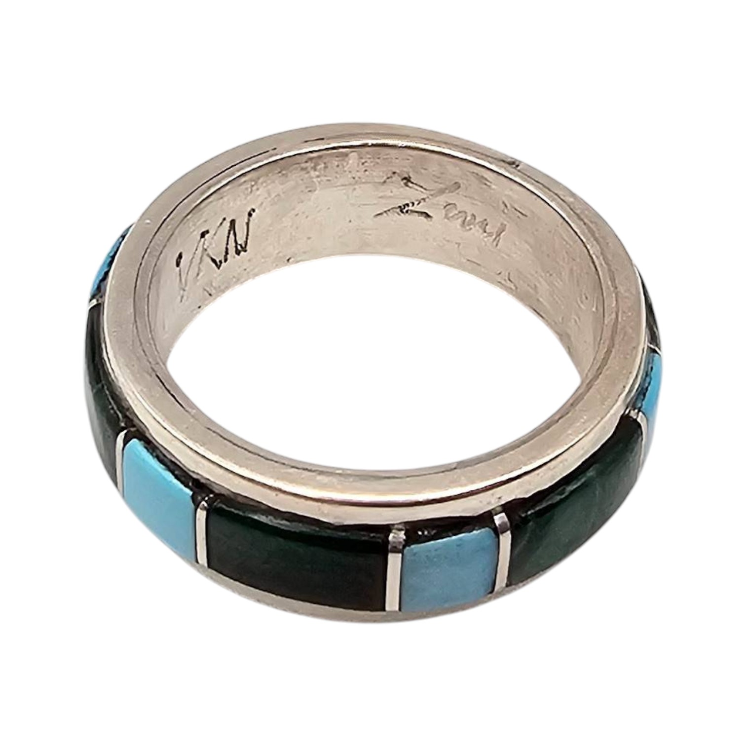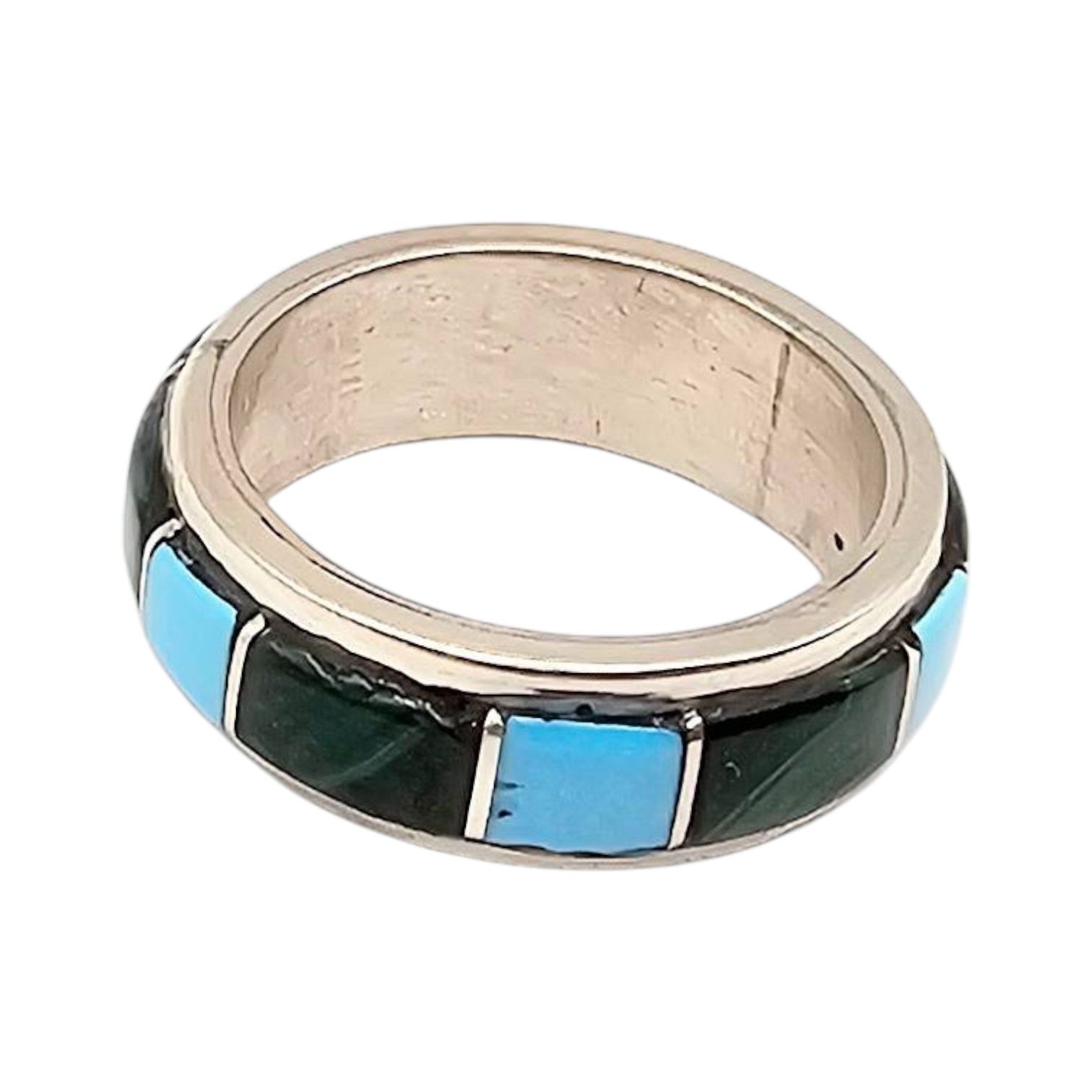 Sterling silver band ring featuring an inlay design with alternating turquoise blue and Malachite rectangular stones. The band is marked with ‘WN’ and ‘sterling.’ Ring size is 5.25, and it weighs approximately 4.8 grams. A unique piece showcasing fine craftsmanship and a striking color contrast.
