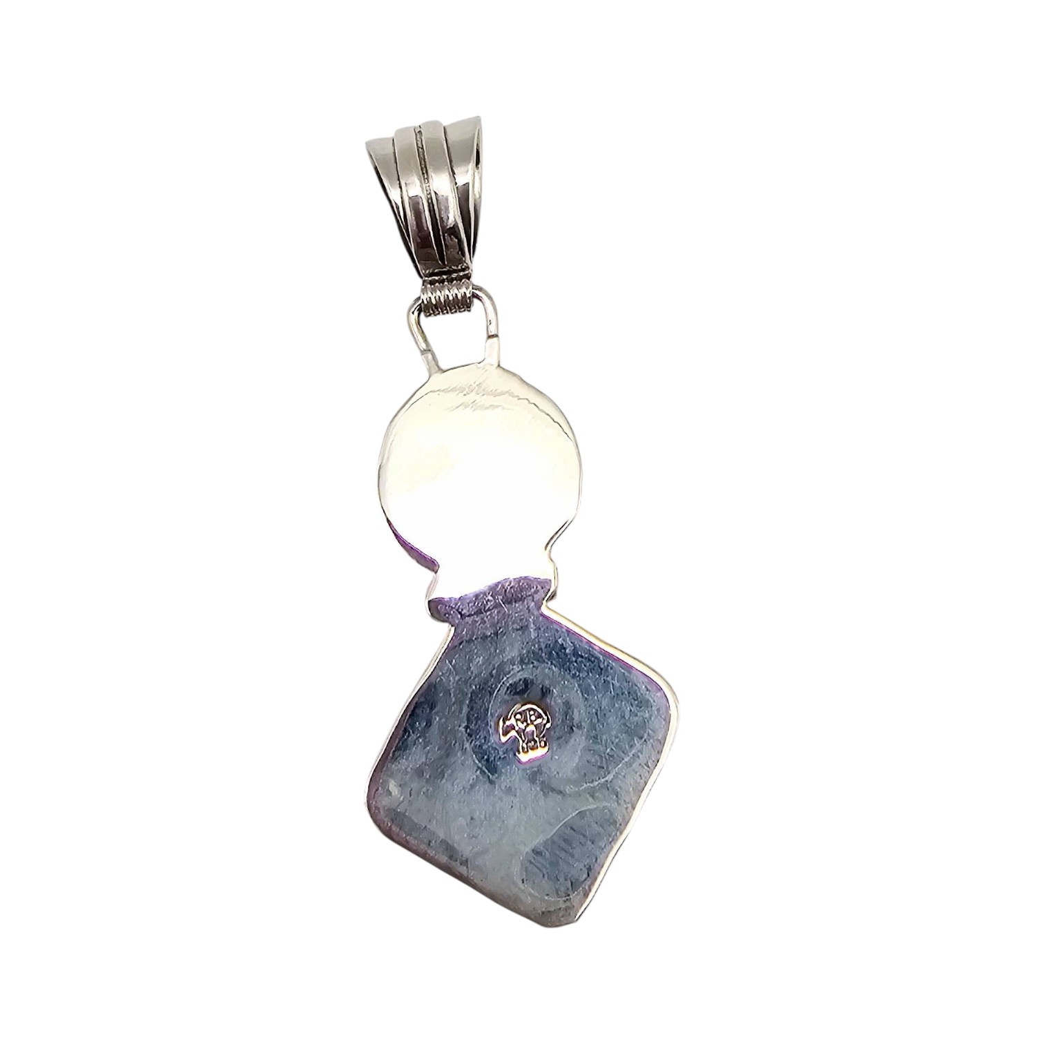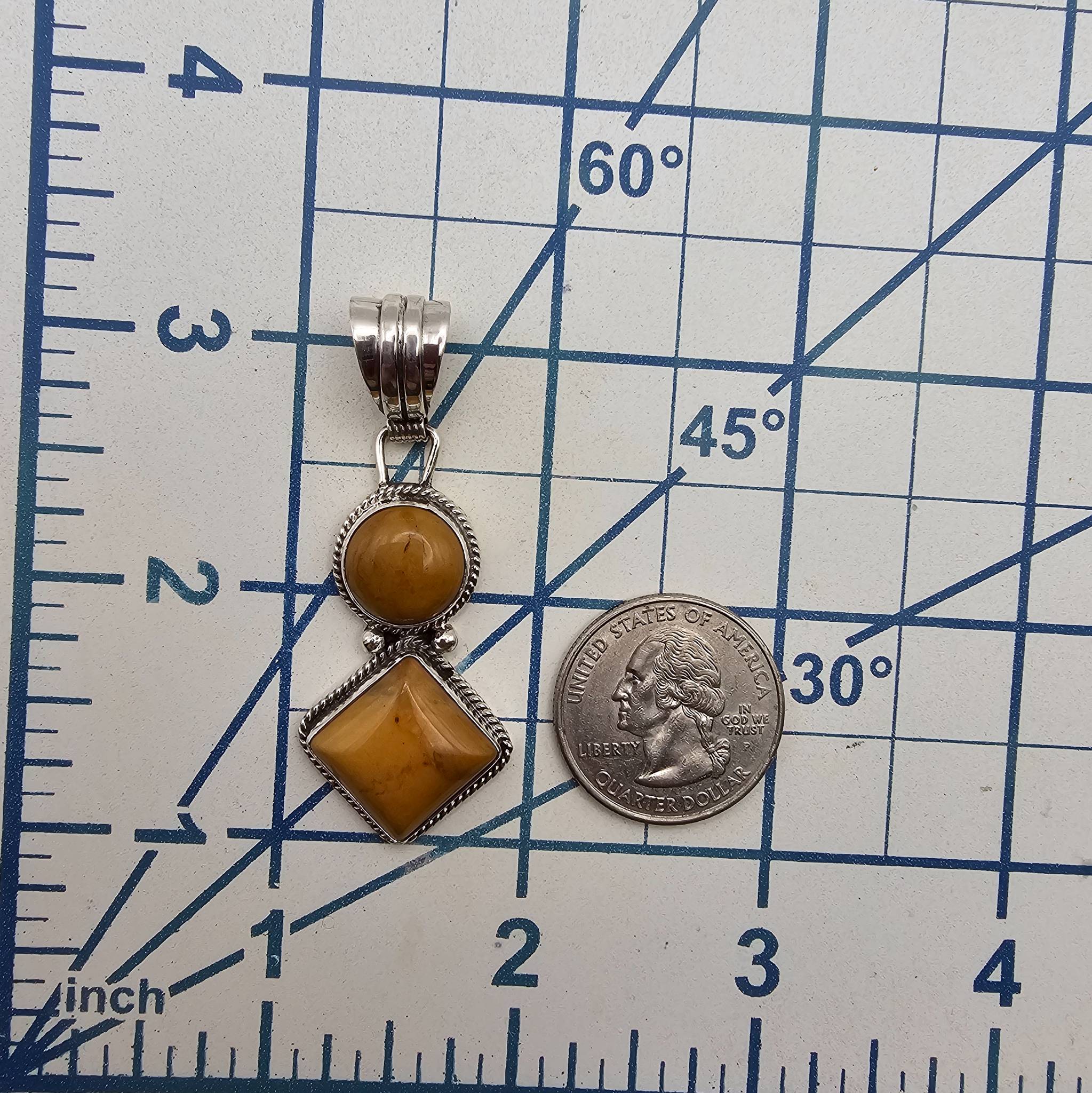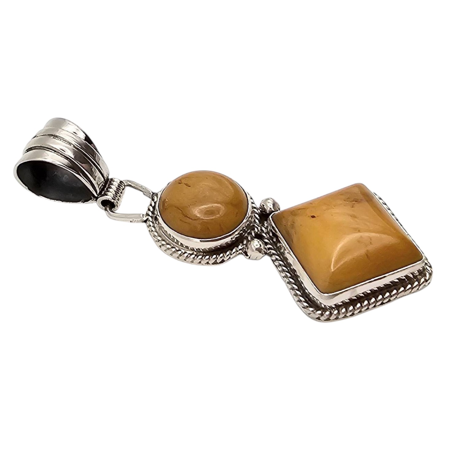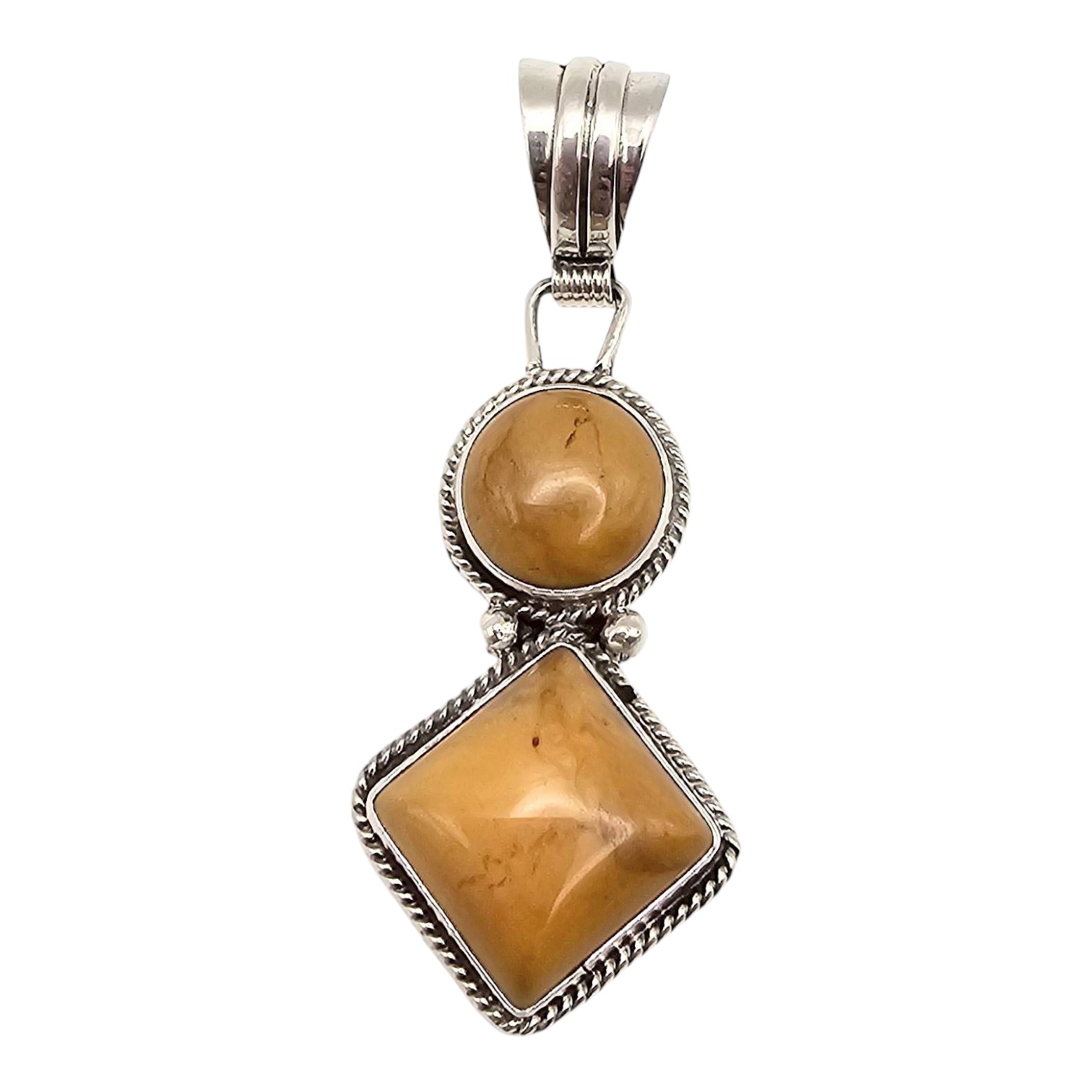 Sterling silver pendant featuring two polished jasper stones, one circular and one diamond-shaped, set in intricately detailed bezels. The pendant weighs approximately 8.9 grams and includes a sturdy silver bail suitable for various chain styles. The reverse side of the pendant exhibits a plain silver finish with a maker’s hallmark.
