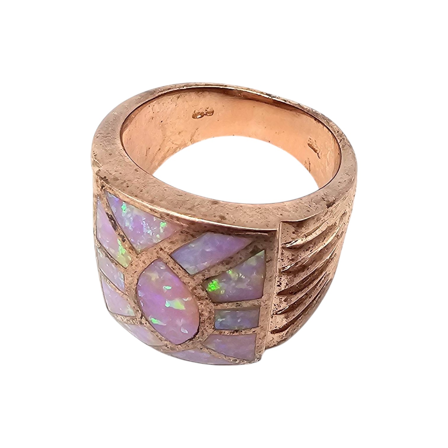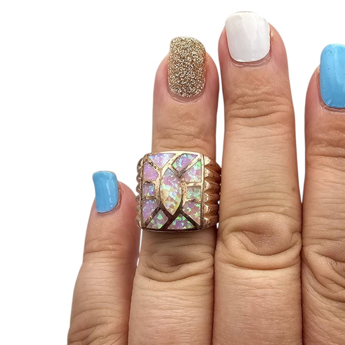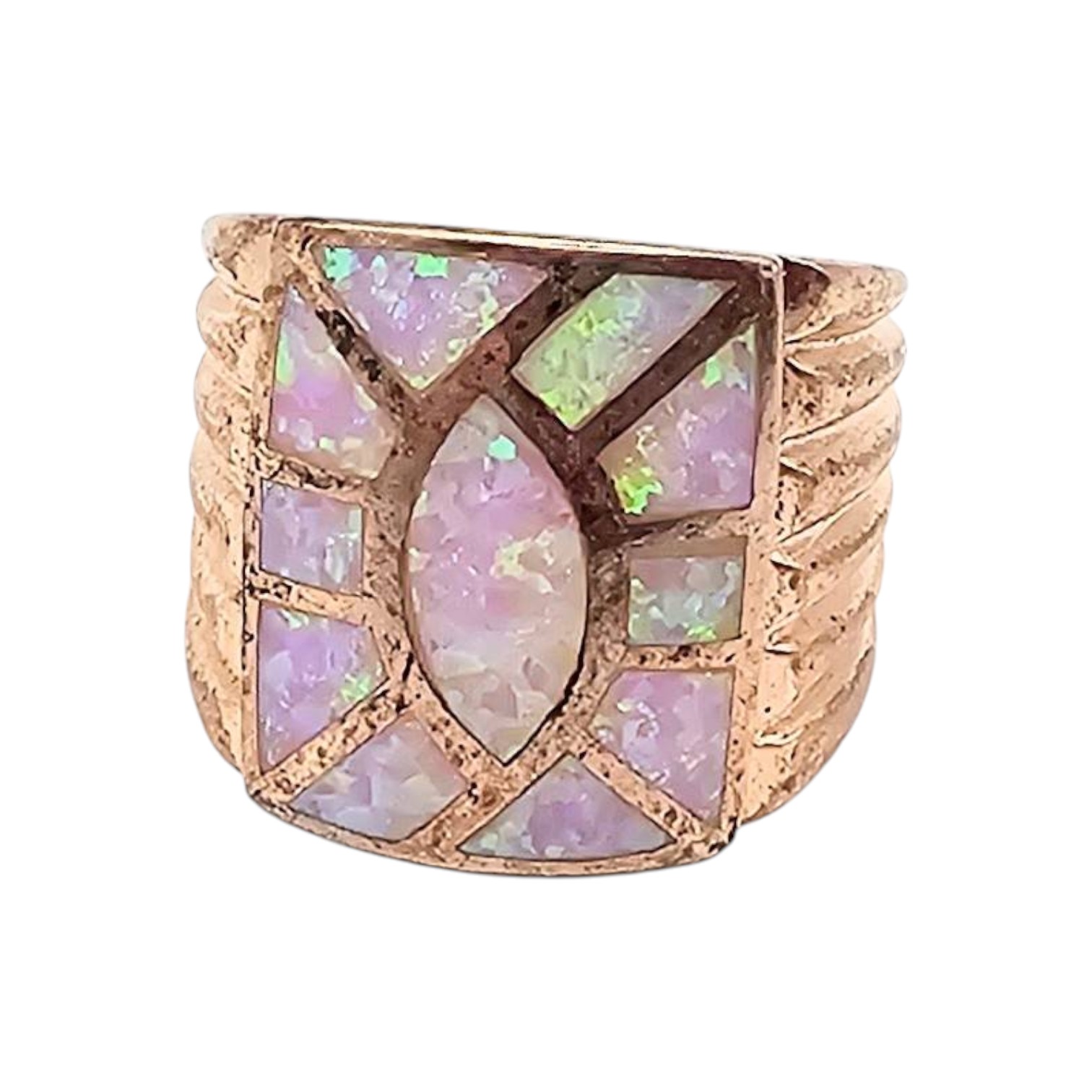 Southwestern opal ring crafted from rose gold over sterling silver. Features a distinctive design with vibrant inlaid opals. Size 6. Weight is approximately 10.8 grams. The ring is finely detailed, making it a substantial and elegant accessory.