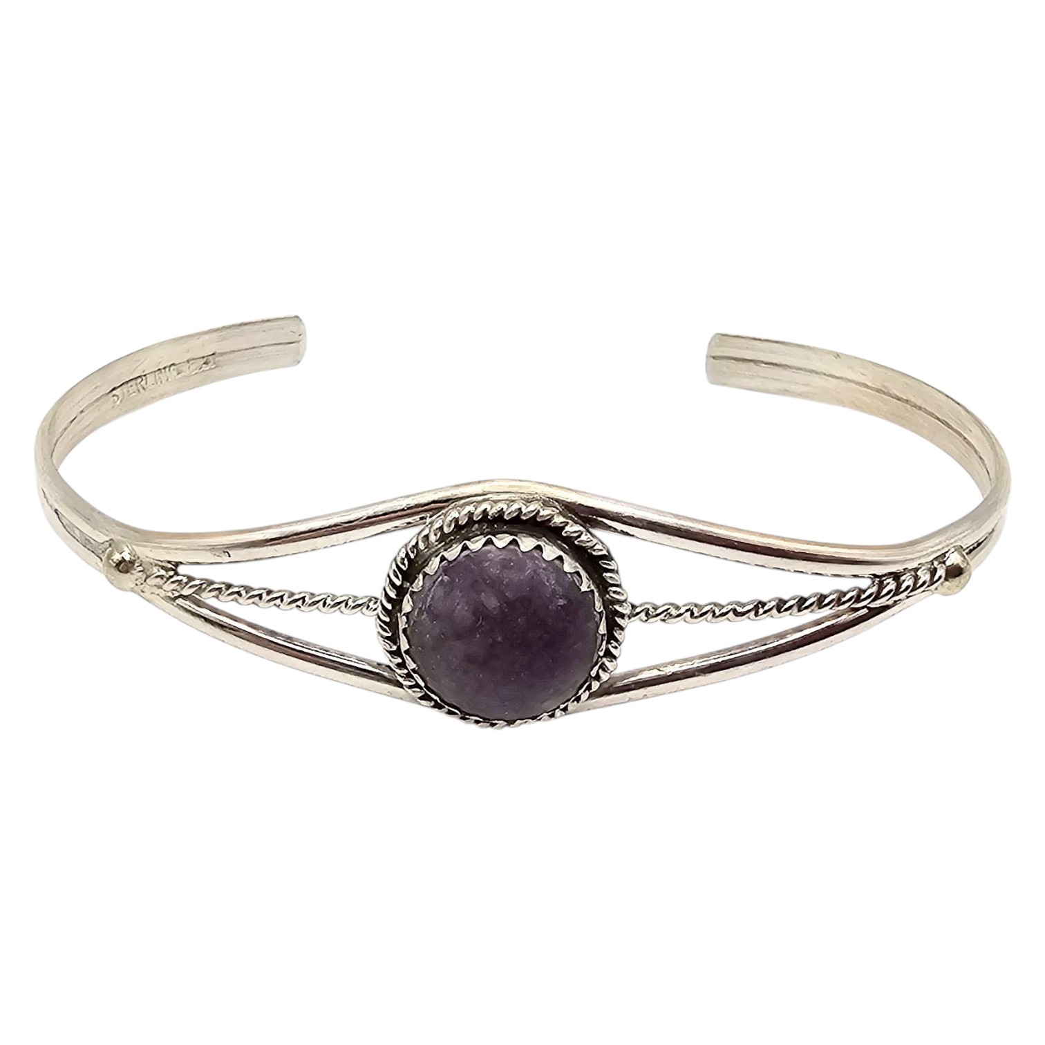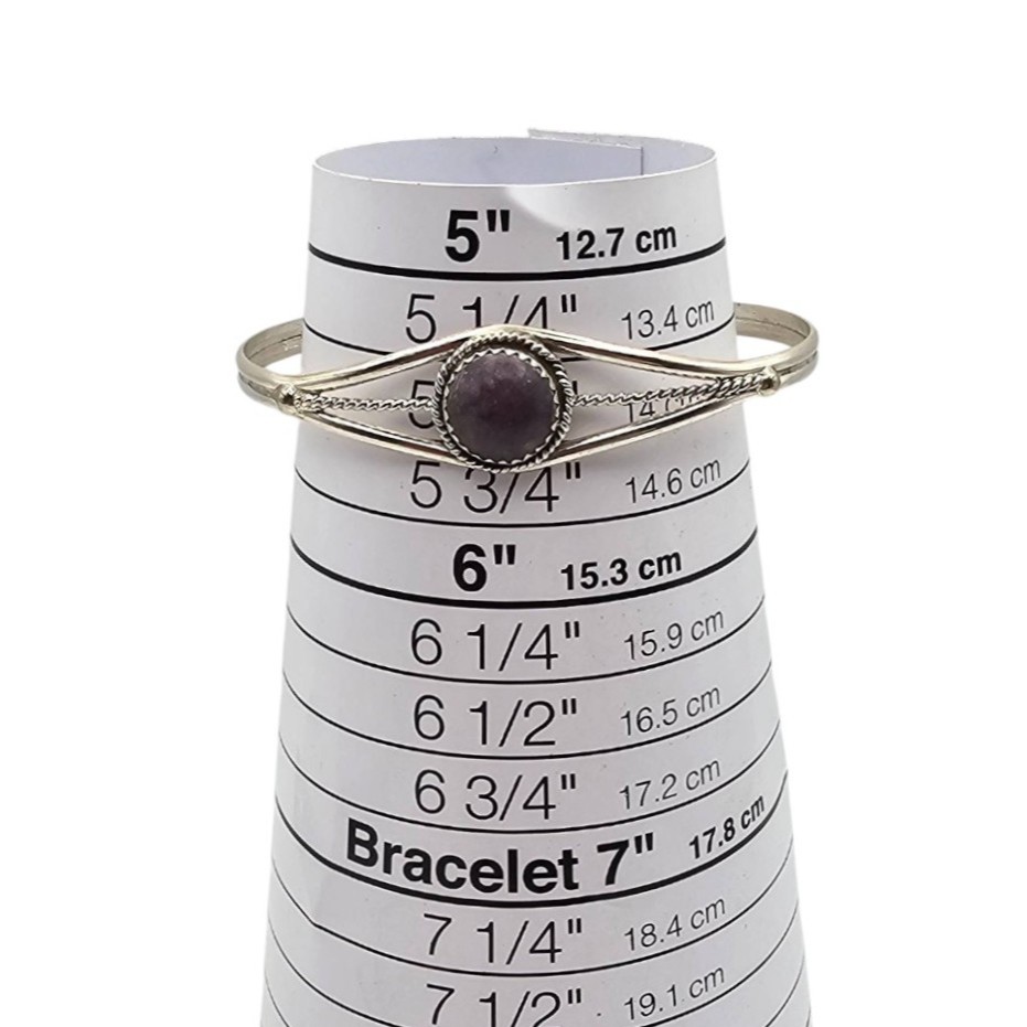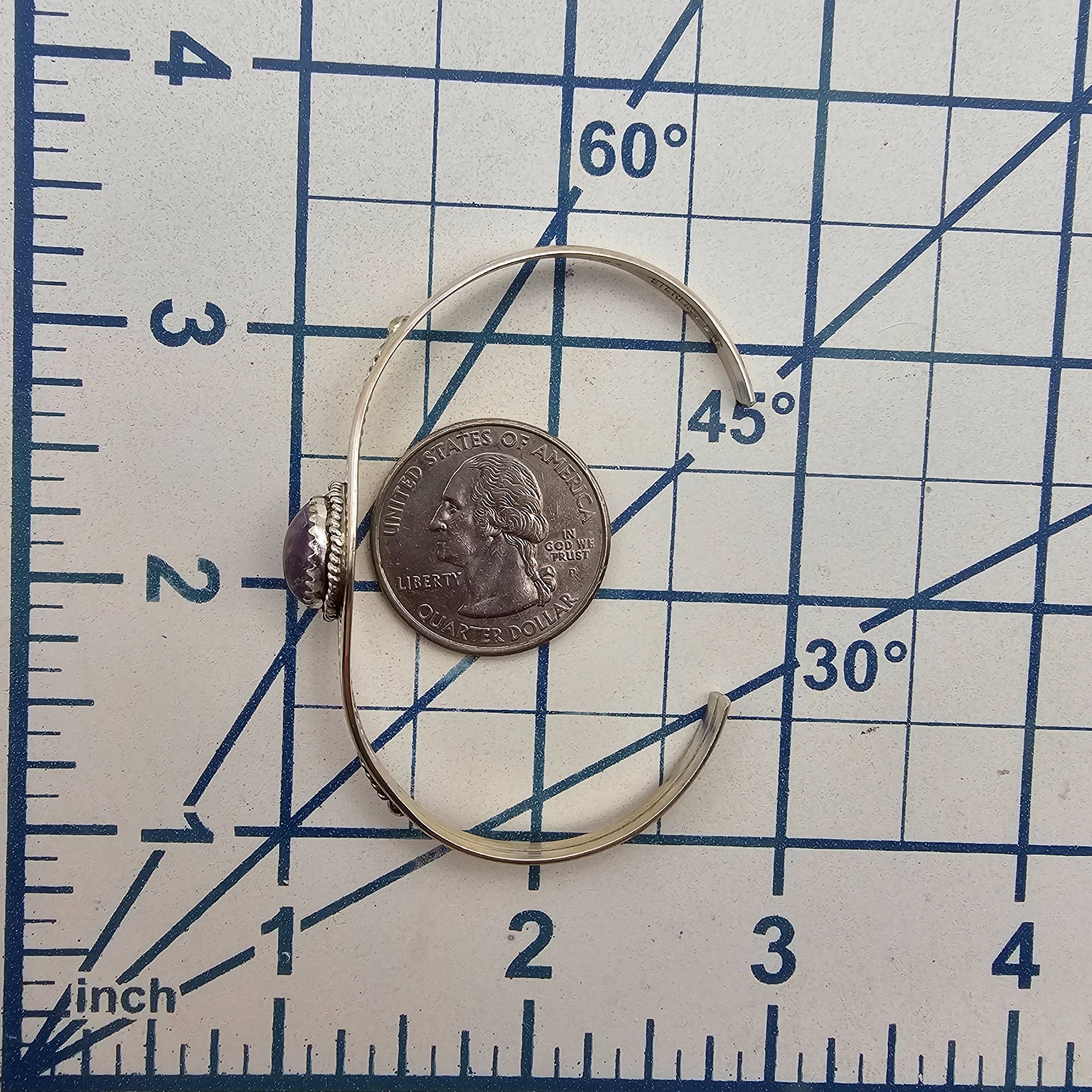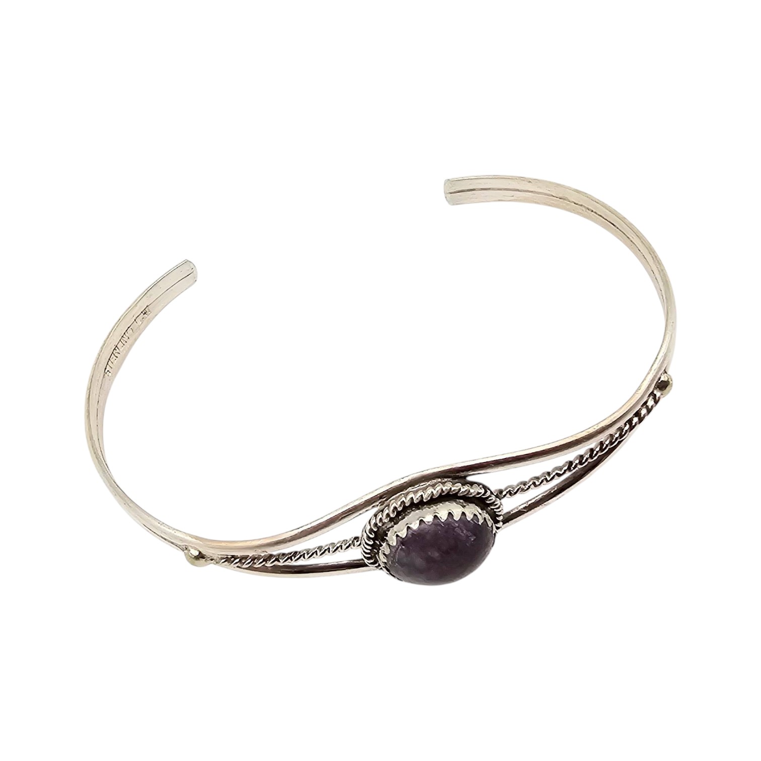 Navajo handmade bracelet crafted by Esther White featuring a central charoite stone set in sterling silver. Intricate wirework design enhances the piece, showcasing traditional craftsmanship. Weighs approximately 6.3 grams with an adjustable open-back cuff design. Bracelet measures suitable for a wrist size approximately 6 inches.