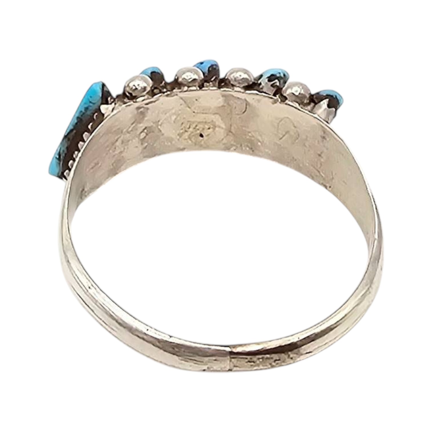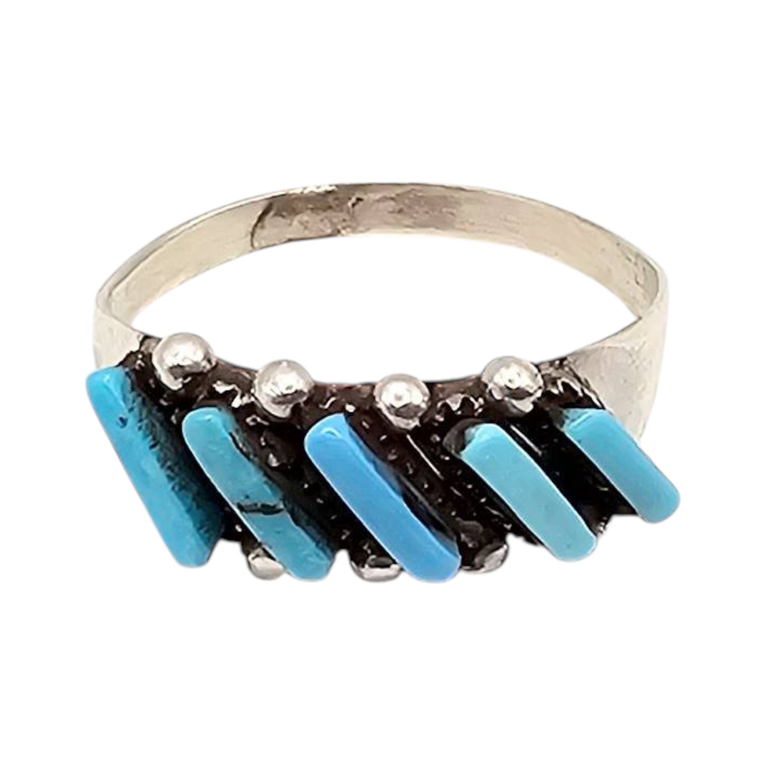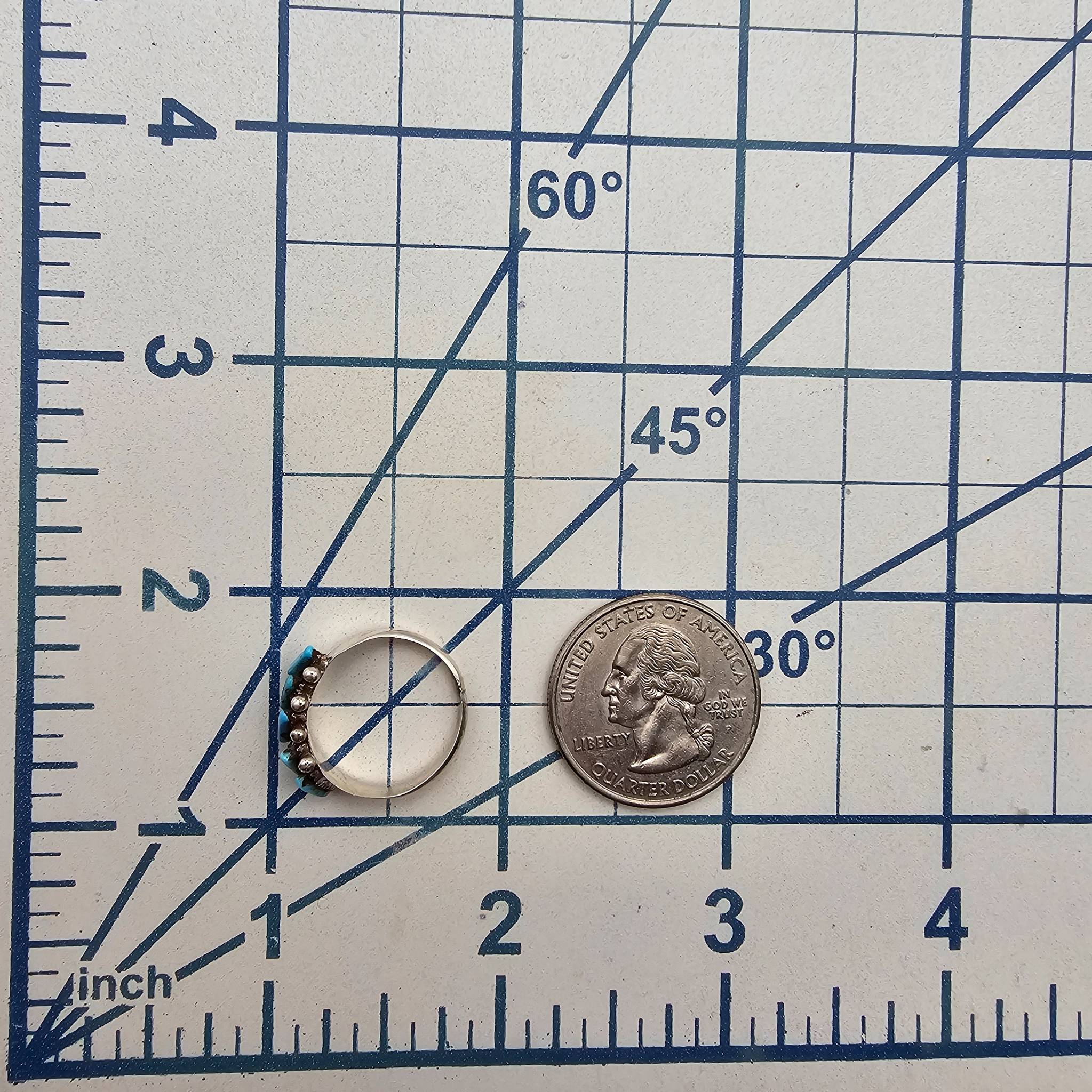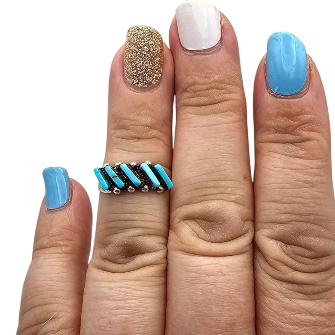 Zuni handmade sterling silver ring by Cletus Lamy featuring five inlaid Kingman turquoise stones set in a diagonal row. The ring is a women’s size 6 and weighs approximately 1.5 grams. Traditional craftsmanship displays the hallmark Zuni style. The band exhibits the natural finish and markings consistent with artisan handcrafted jewelry.