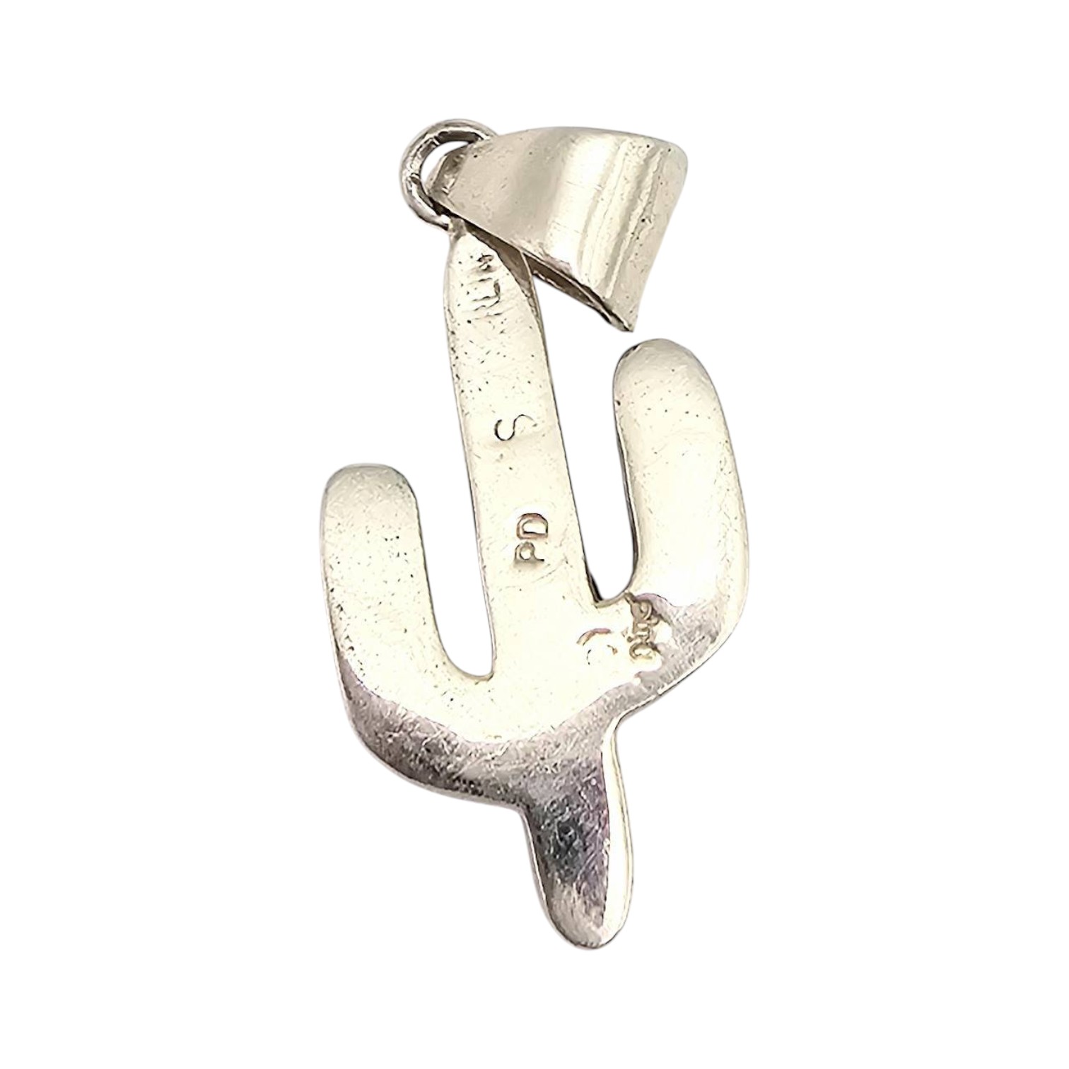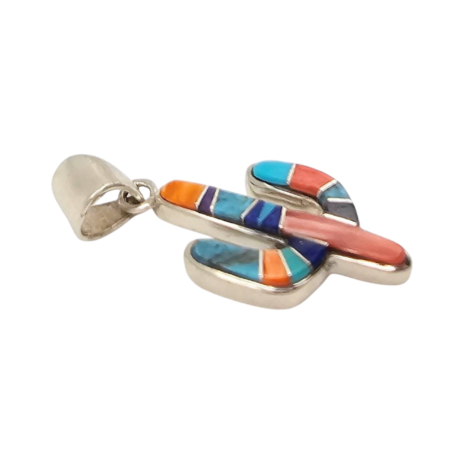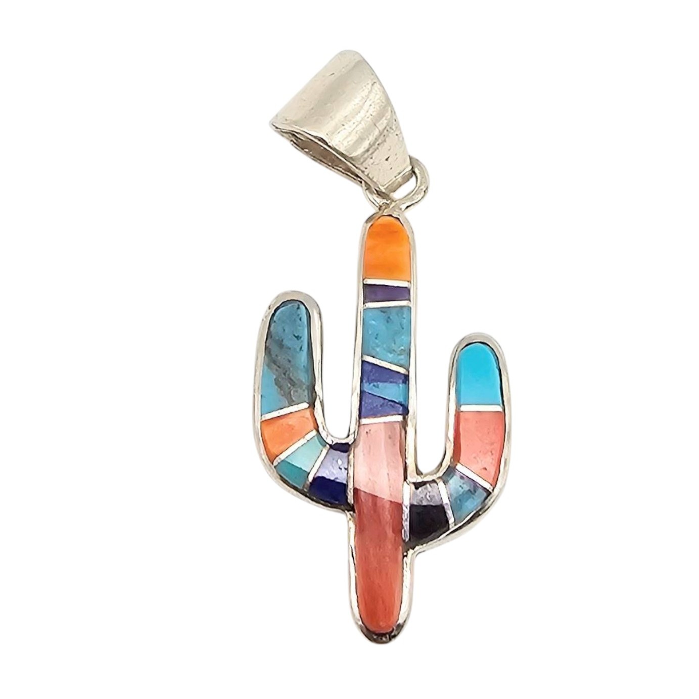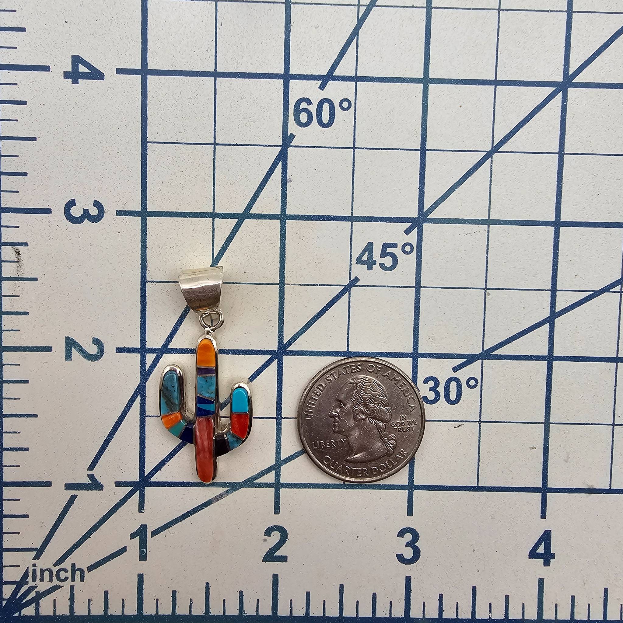 Sterling silver pendant handcrafted by Navajo artisan Aldora Henry. Features a cactus design with Multi-Stone inlay made of vibrant stones, including turquoise, coral, spiny oyster, lapis, and onyx, Weighing 5.8 grams, the pendant measures approximately 1.5 inches in length. Marked on the back with “PD” and “S.” A finely crafted piece of Native American jewelry.