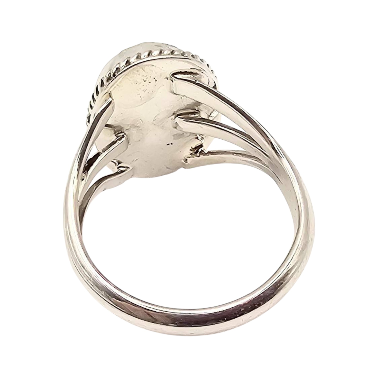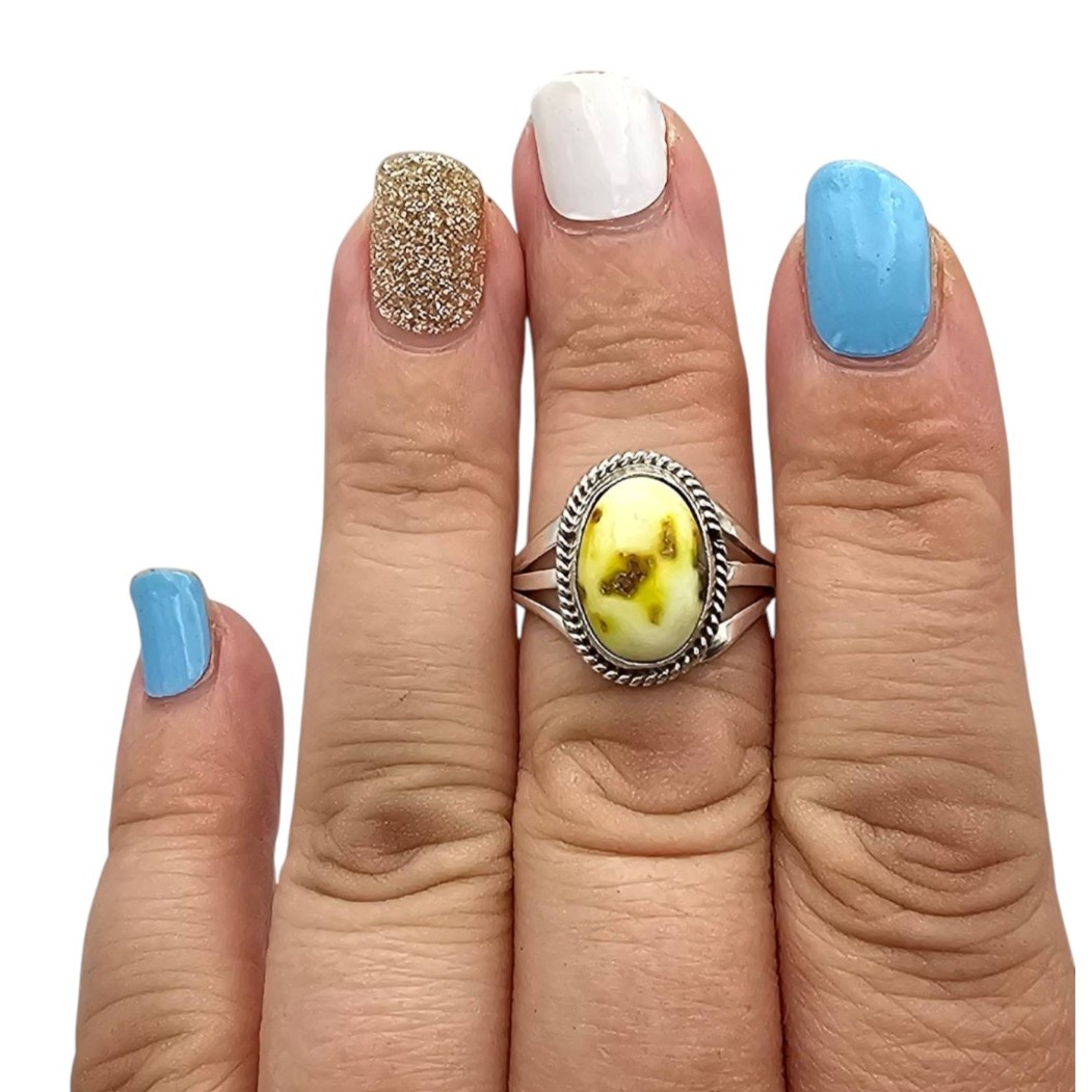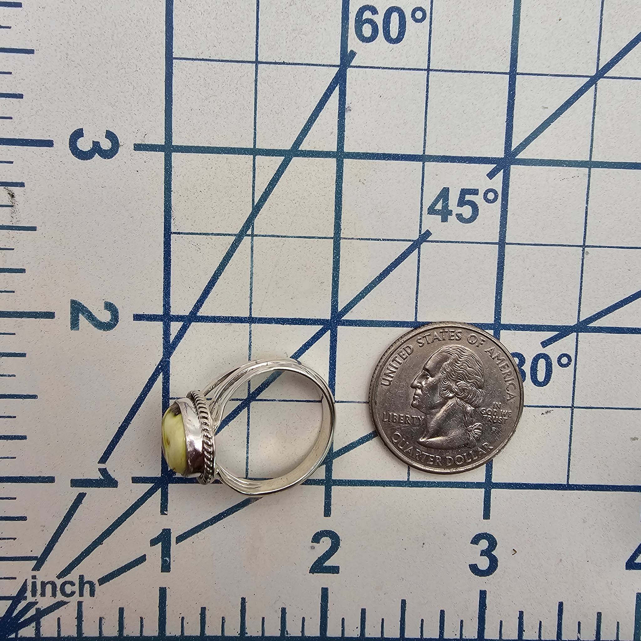Sterling silver ring featuring an oval cabochon yellow stone with brown inclusions. The setting includes a twisted rope border and a split shank band design. The ring weighs 4.7 grams and includes a distinct craftsmanship back design. The size of the ring appears comparable to a U.S. quarter, Size 7.5