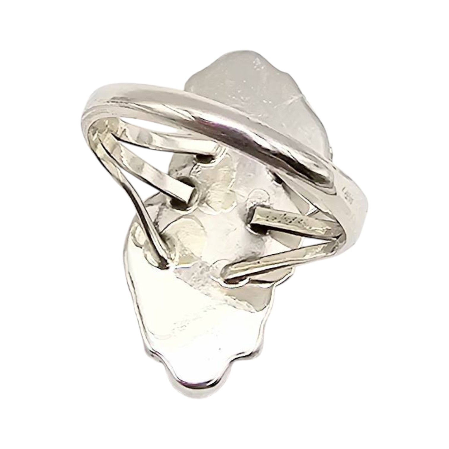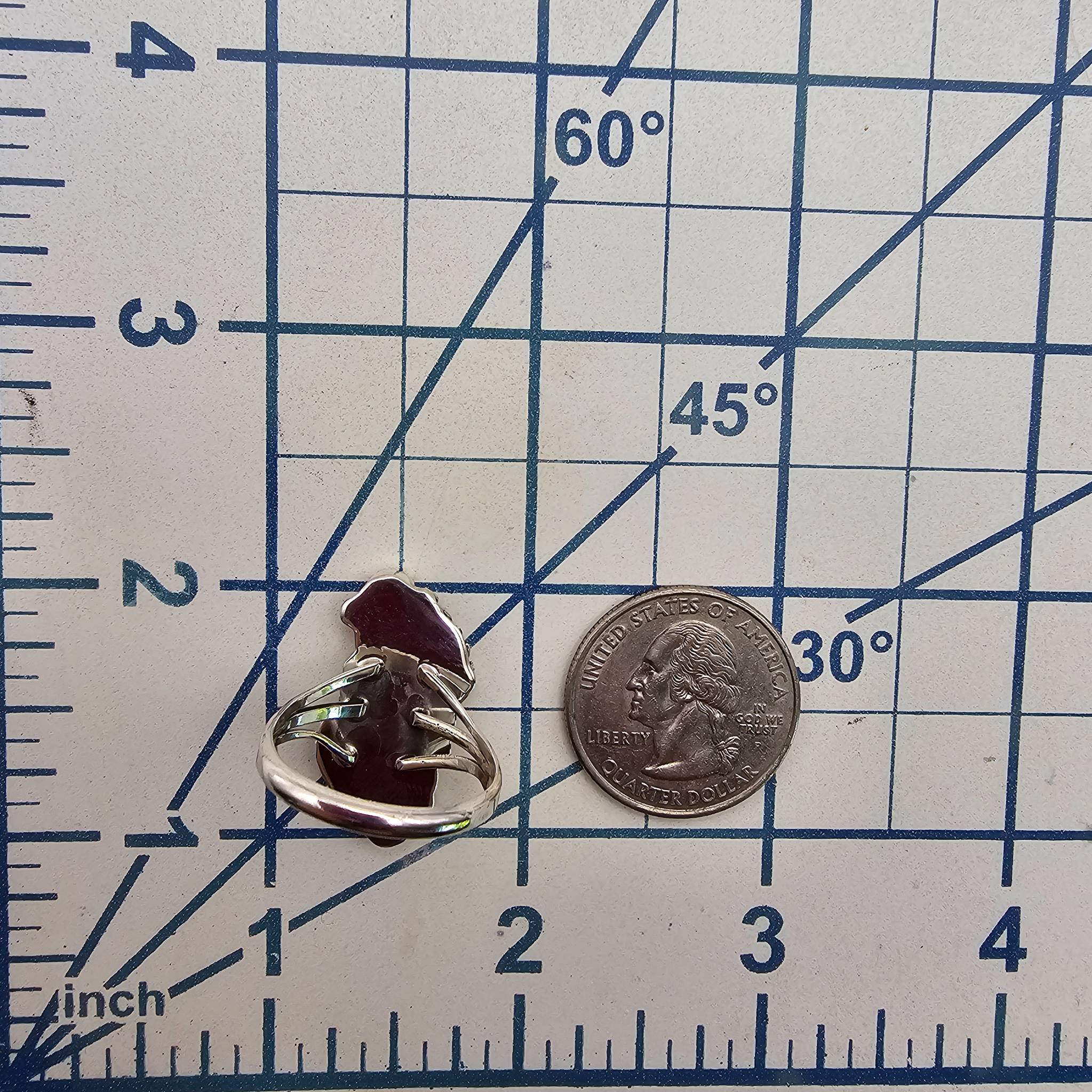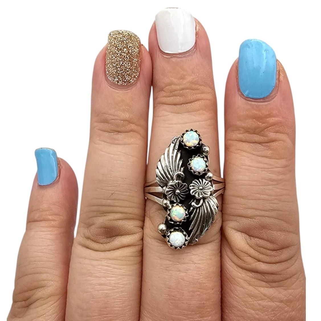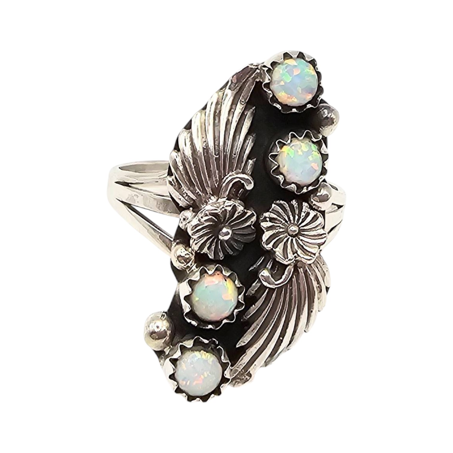 Navajo sterling silver ring by artisan Judy Largo, featuring five opal stones set in a floral and leaf motif. The ring is a size 8.75 and weighs approximately 5 grams. The design showcases a blend of traditional Navajo craftsmanship with intricate detailing.