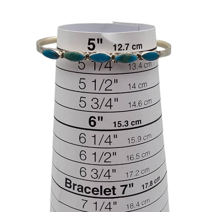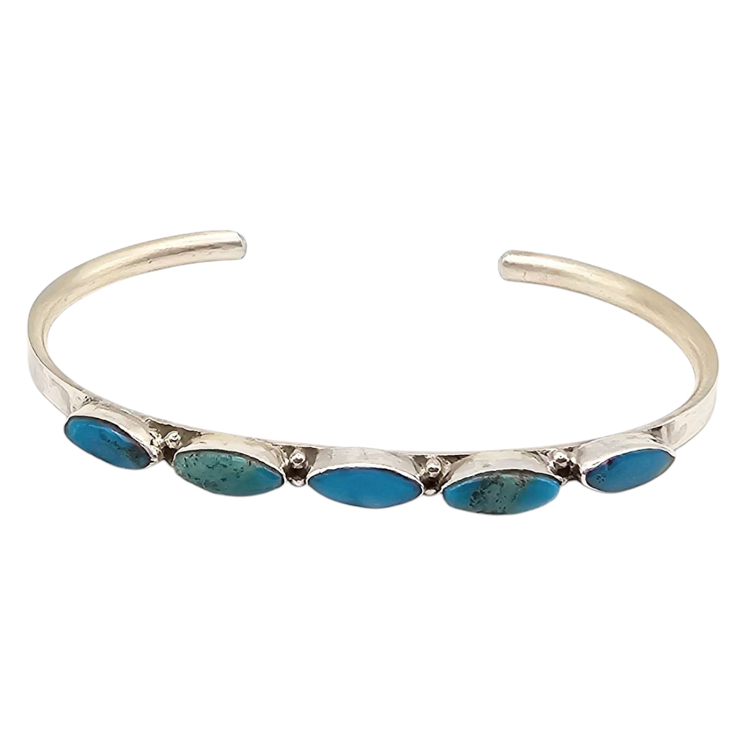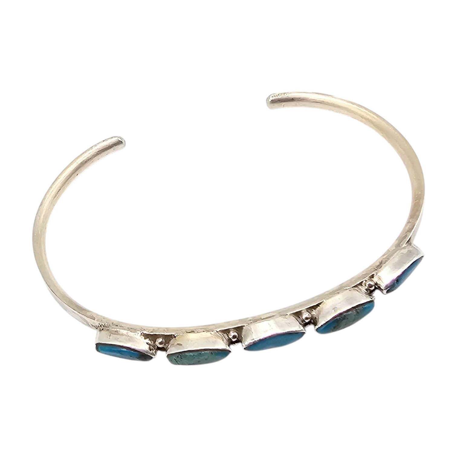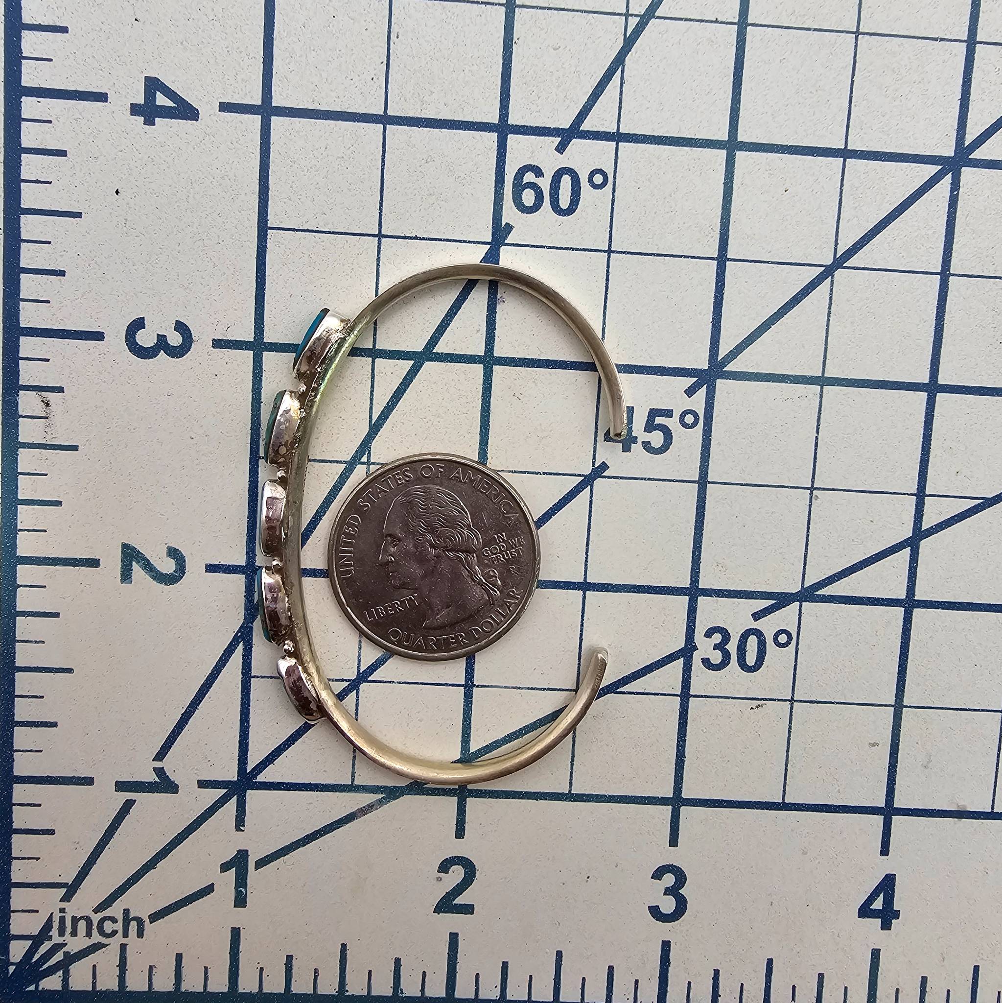 Sterling silver cuff bracelet handcrafted by Zuni artisan Andrea Dishta featuring five turquoise stones in a simple, elegant setting. The hallmark is visible on the inner band. The bracelet weighs 7.1 grams and fits a wrist size of approximately 6 inches. Excellent example of Zuni craftsmanship.