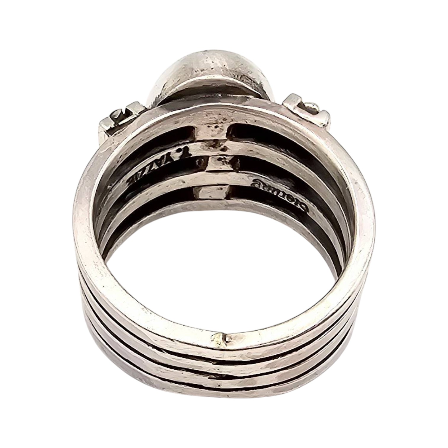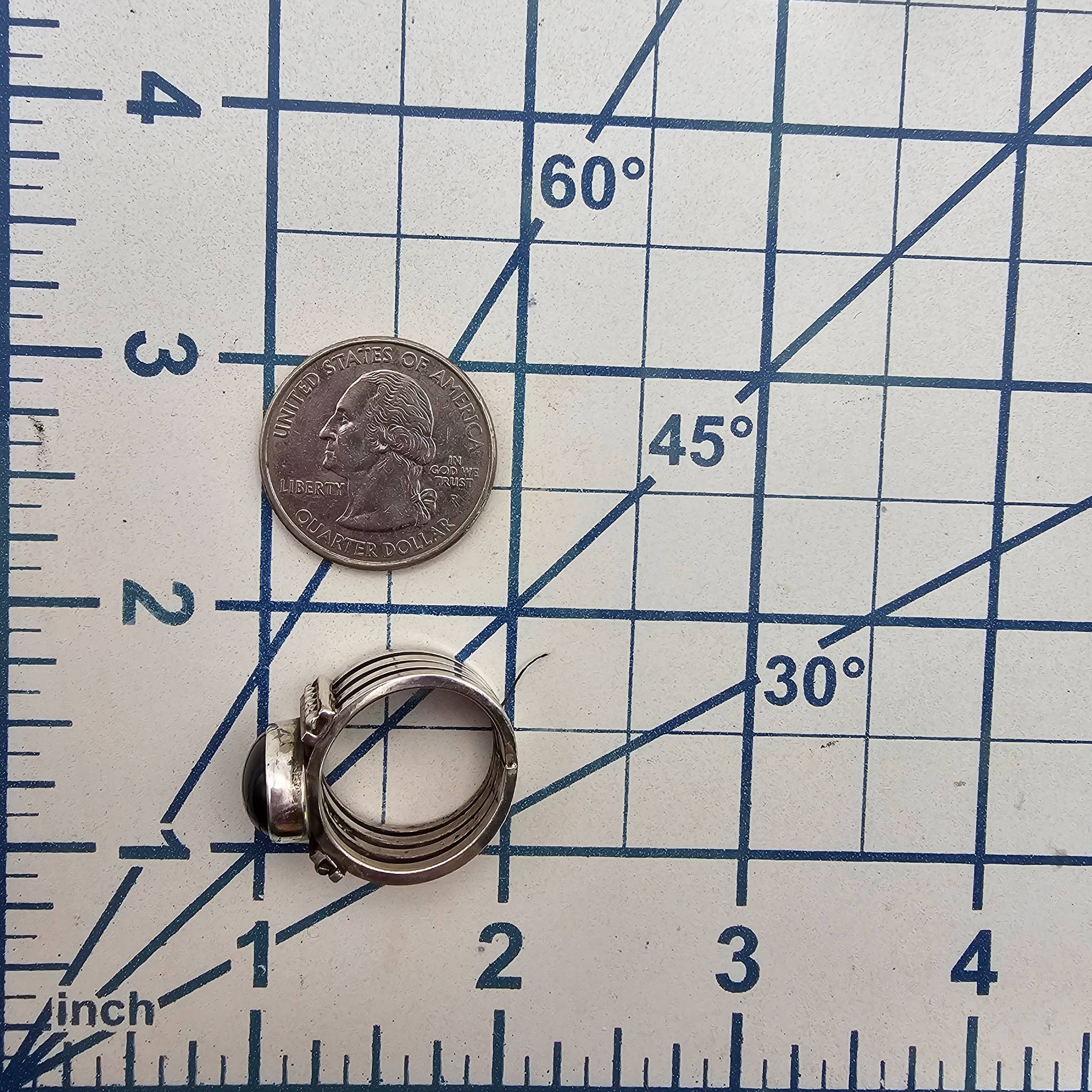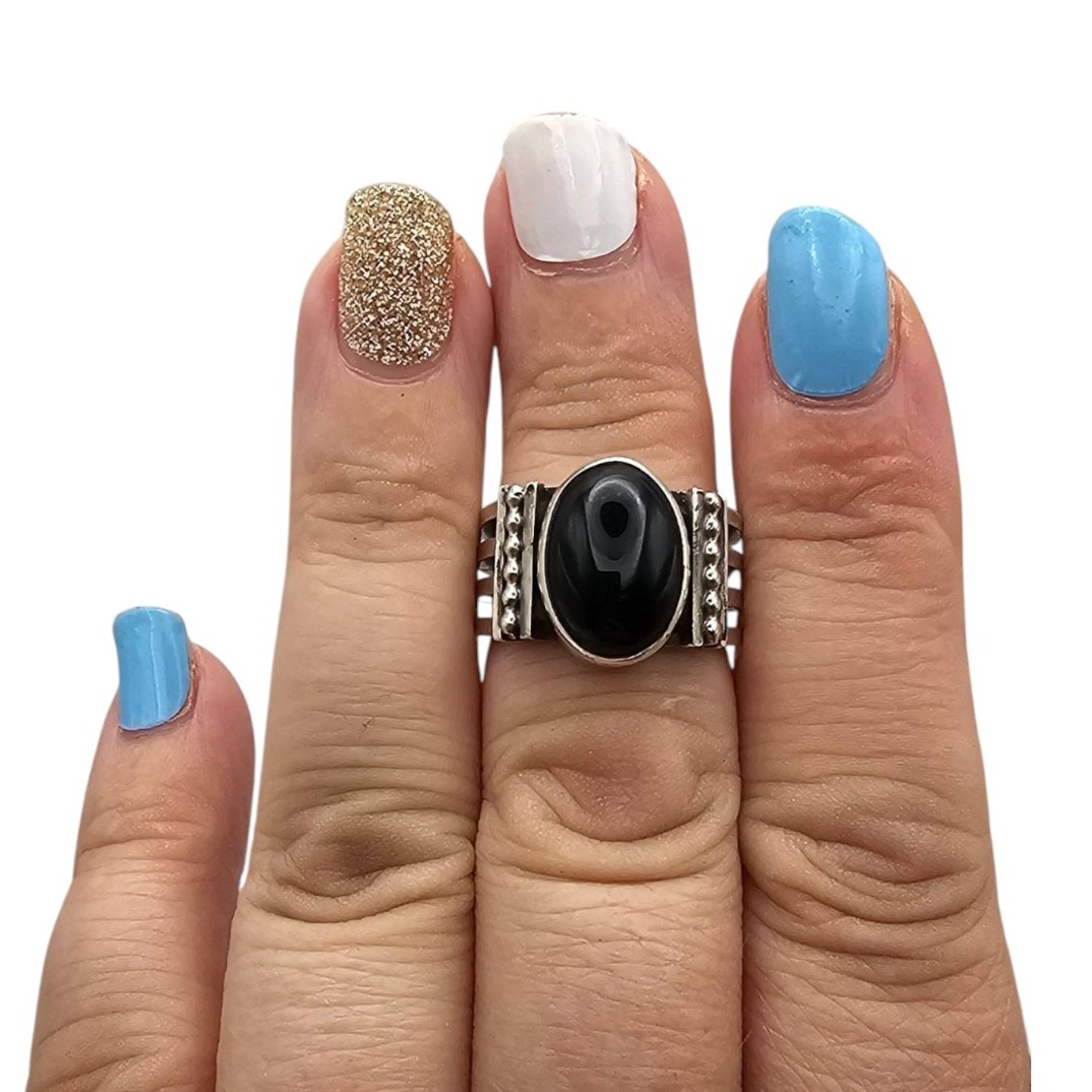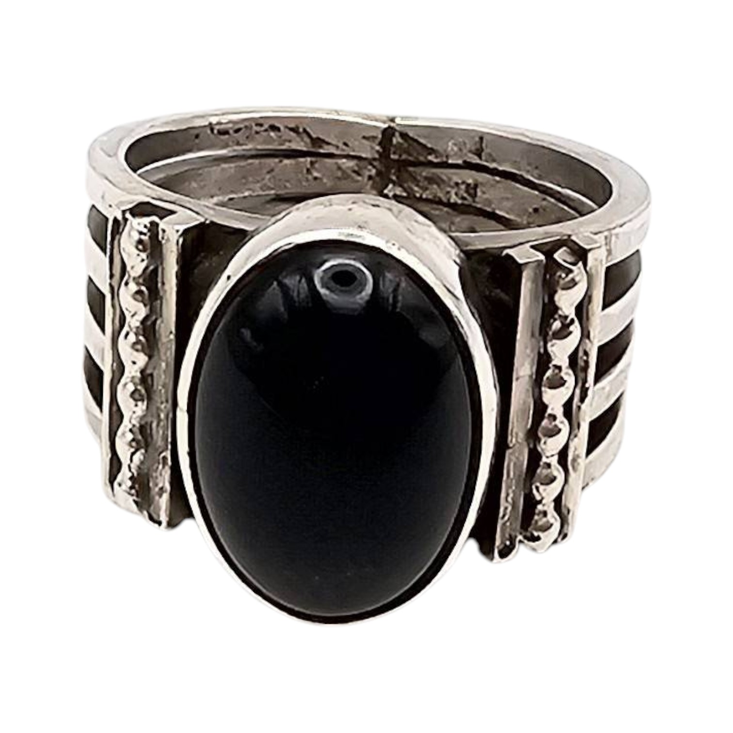 Navajo sterling silver ring handcrafted by Thomas Yazzie, featuring an oval black stone centerpiece. The band showcases an intricate design with multiple bands and detailed accents along the sides. Marked size is 7, and the ring weighs 8.5 grams.