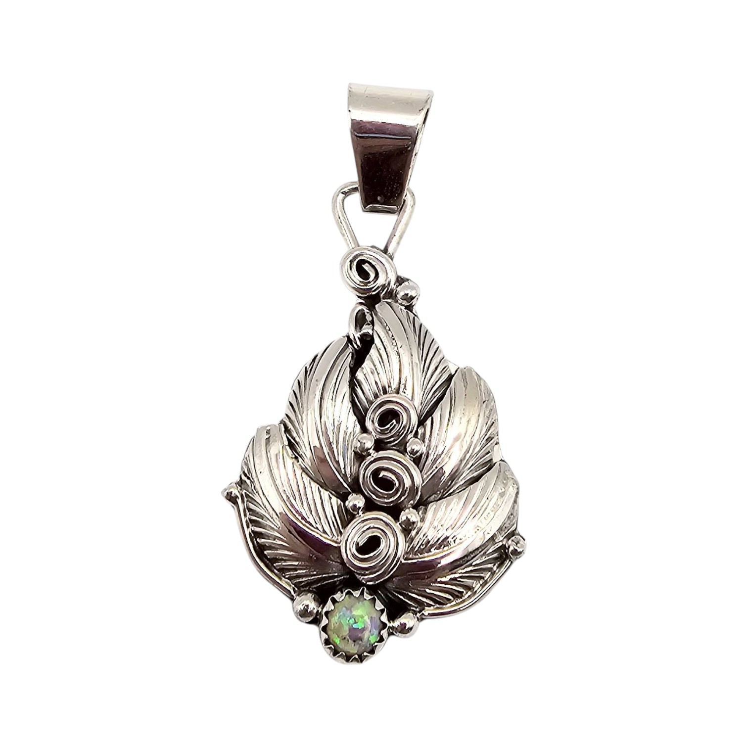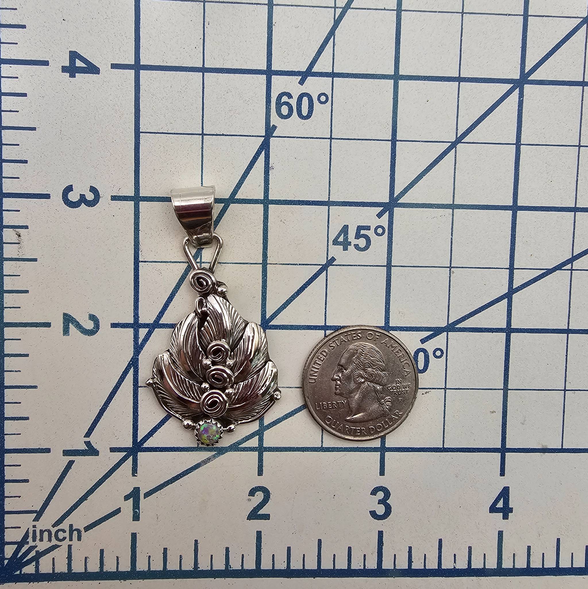 Sterling silver pendant handcrafted by Navajo artist Darrell Morgan, featuring intricate feather designs and spiraled details. The pendant includes a vibrant opal accent at the base. Stamped with the artist’s hallmark on the reverse side. The piece weighs 8.5 grams and measures approximately 2 inches in length, including the bail.