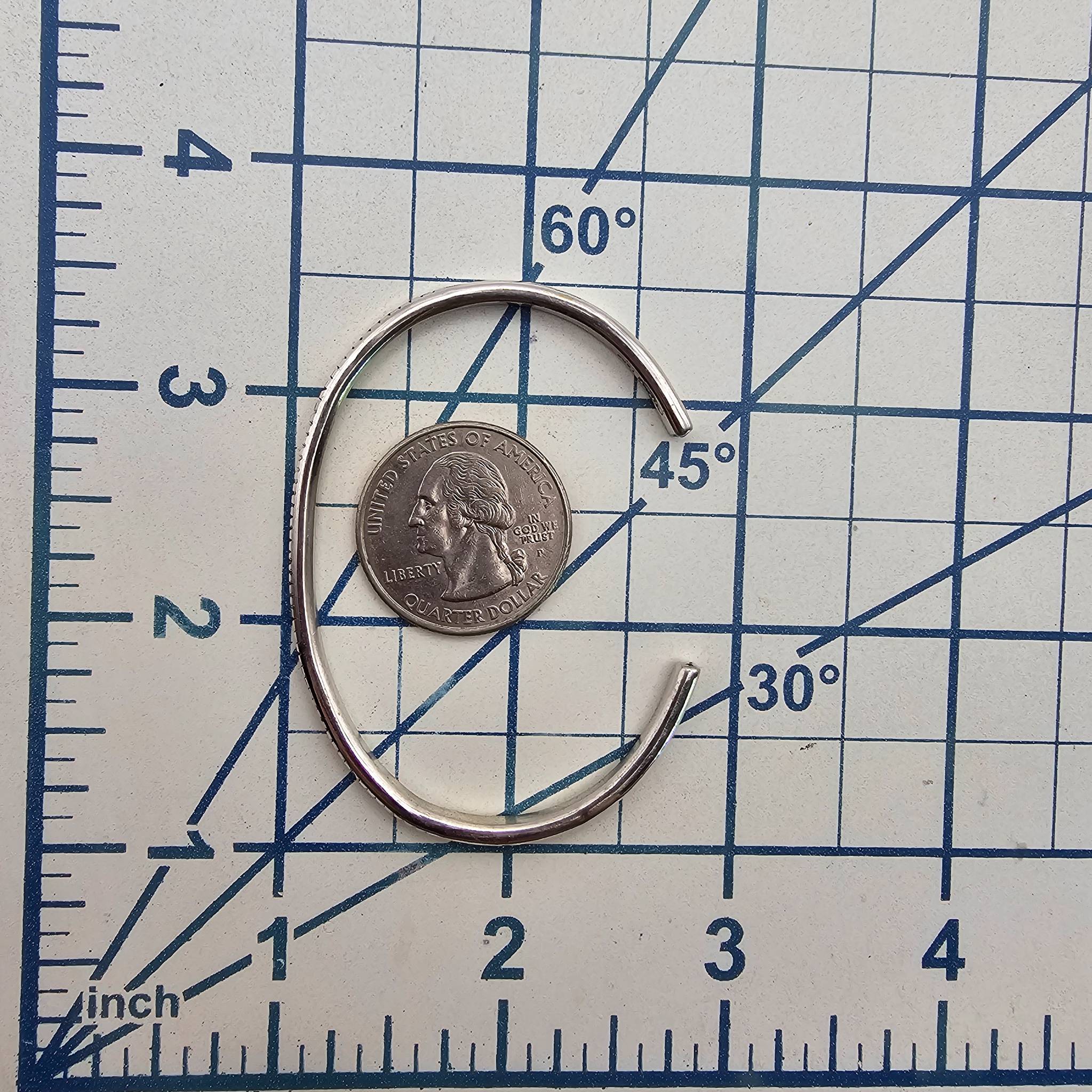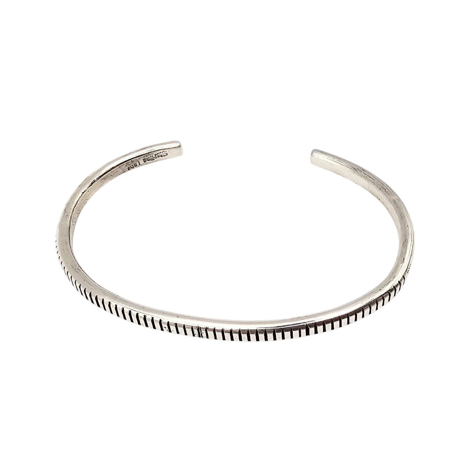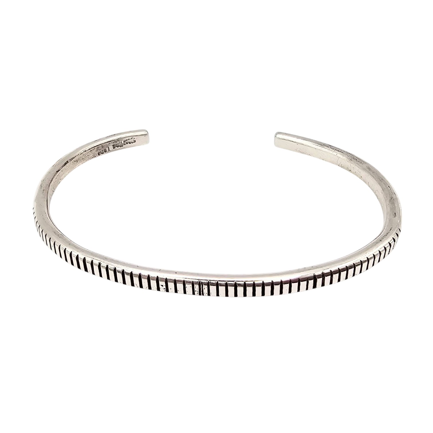 Sterling silver cuff bracelet handcrafted by Navajo artisan Elaine Tahe. The bracelet features a fine, evenly spaced line pattern along its surface, showcasing traditional Navajo craftsmanship. Weighing approximately 11.2 grams, this piece is hallmarked on the inner band and is designed as an open cuff for adjustable wear. Suitable for collectors and those appreciating Native American jewelry.