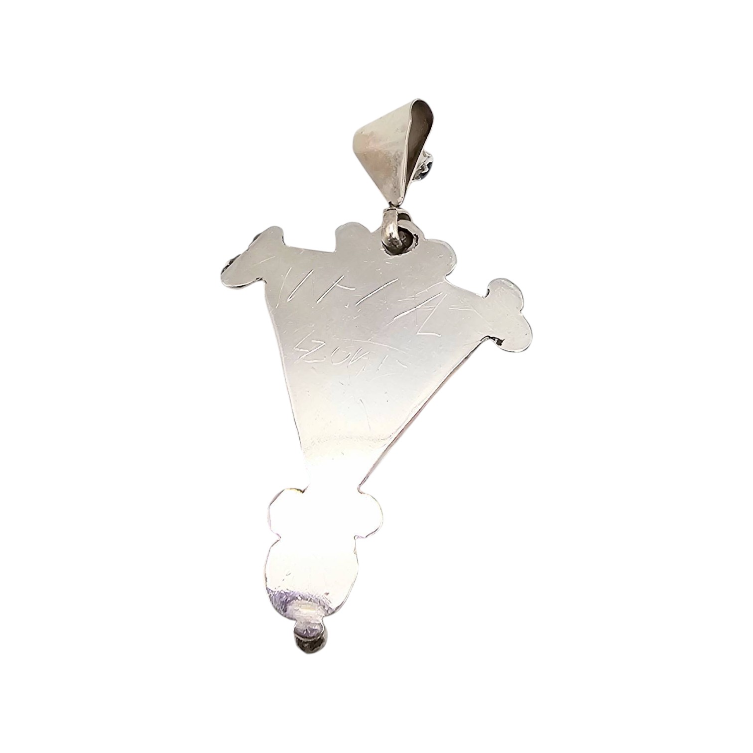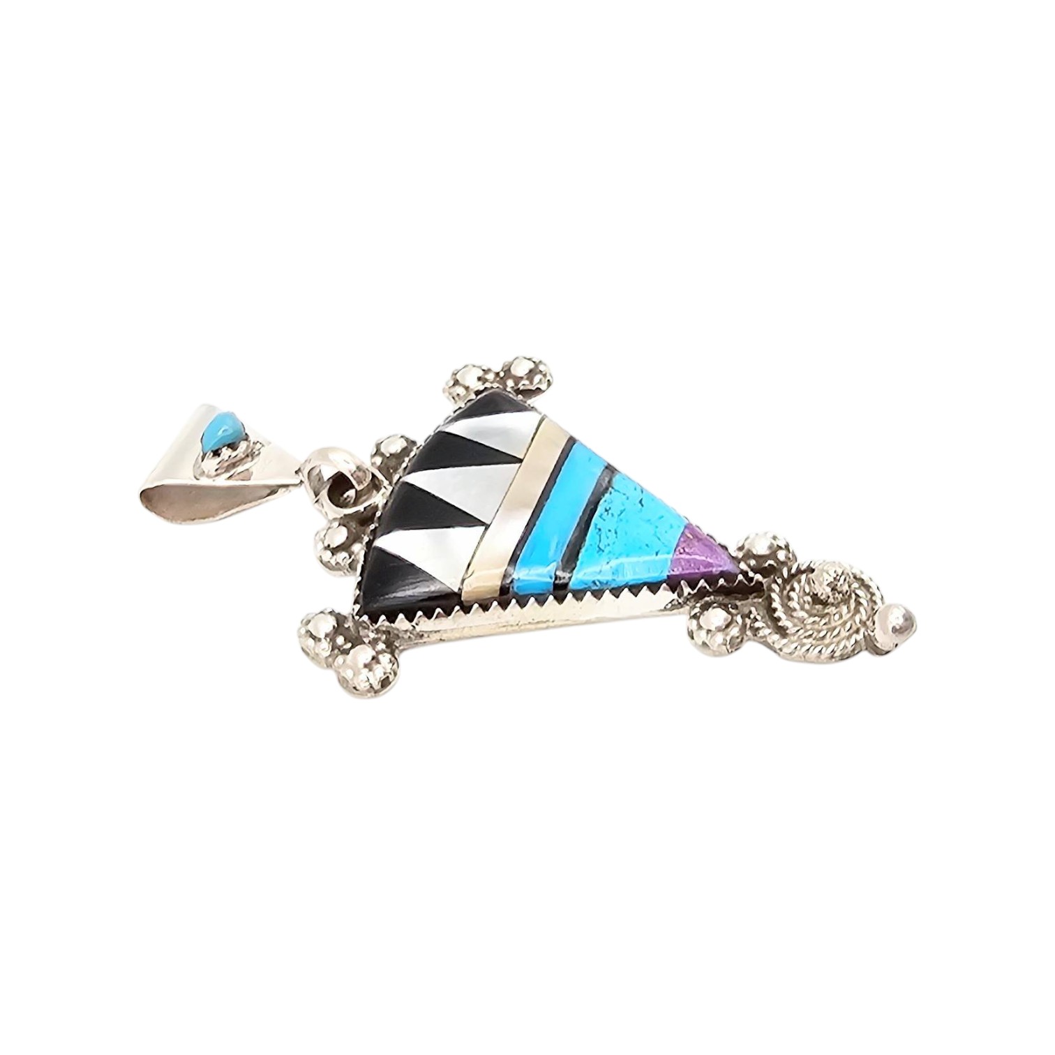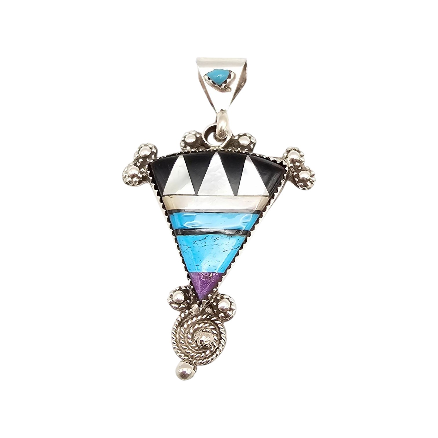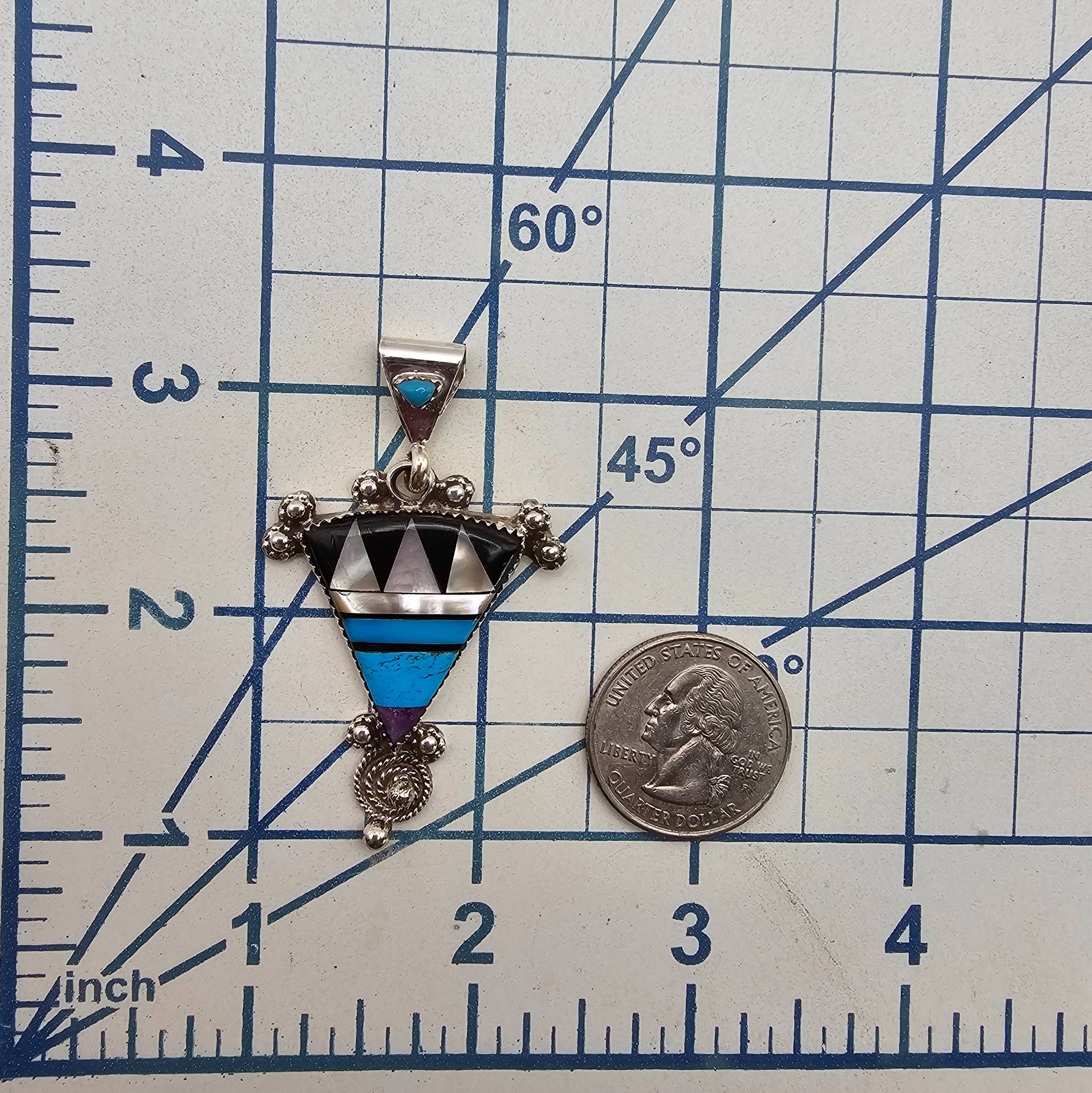 Sterling silver pendant featuring geometric inlay work with turquoise, onyx, and additional stones in a triangular design. The piece is accented with bead embellishments and a spiral detail at the base. Crafted with a polished finish, it weighs approximately 7.7 grams. The back shows a smooth surface with no apparent maker’s mark displayed.