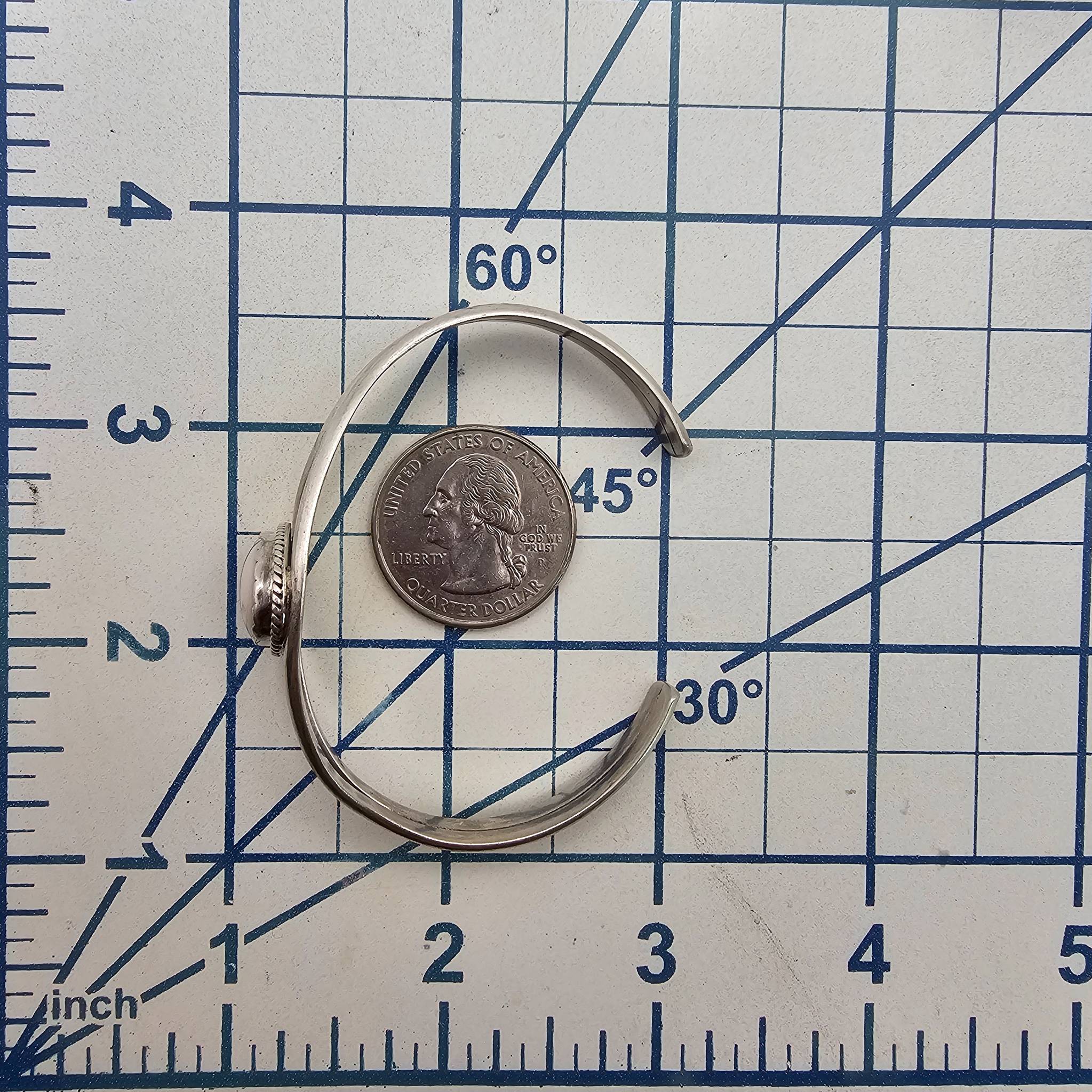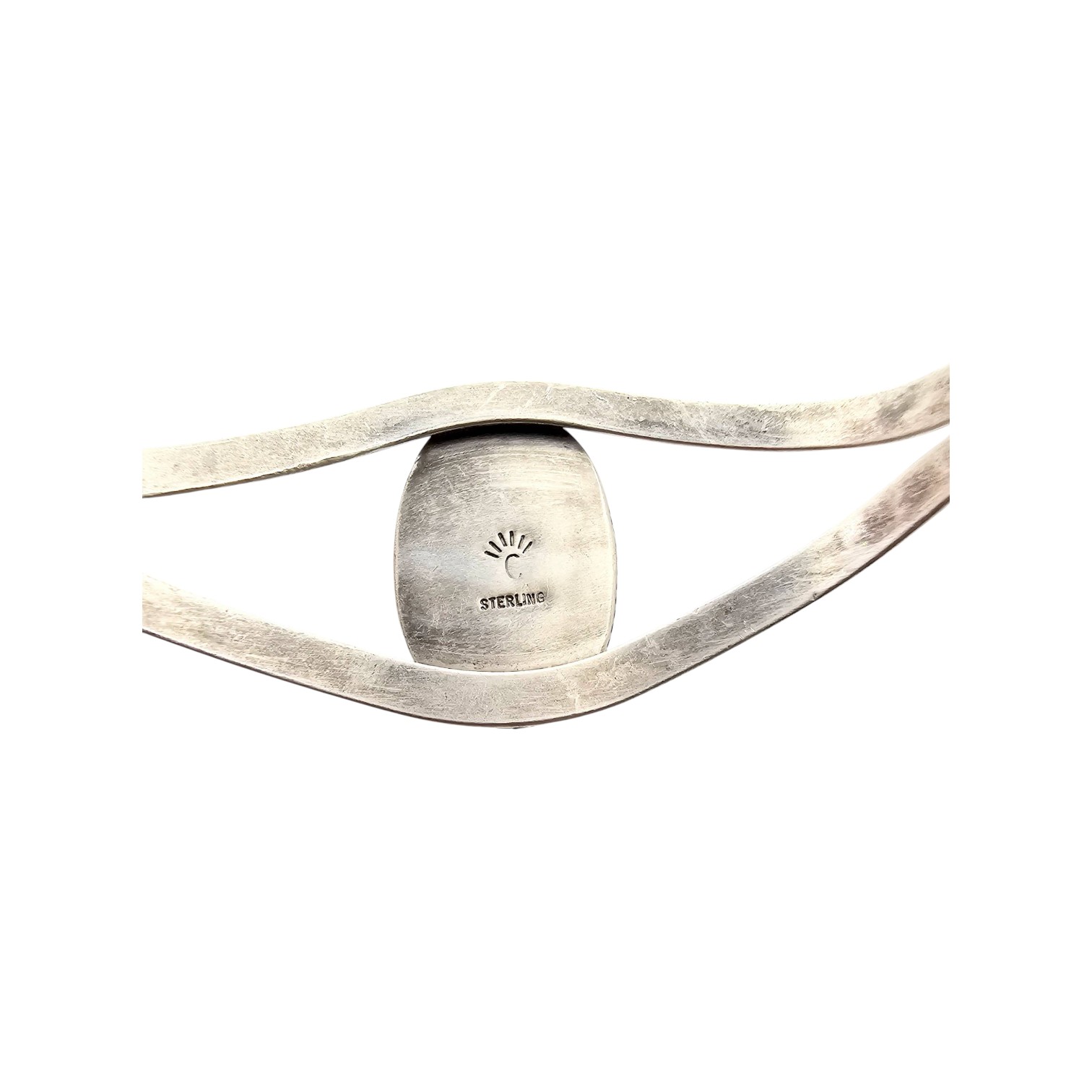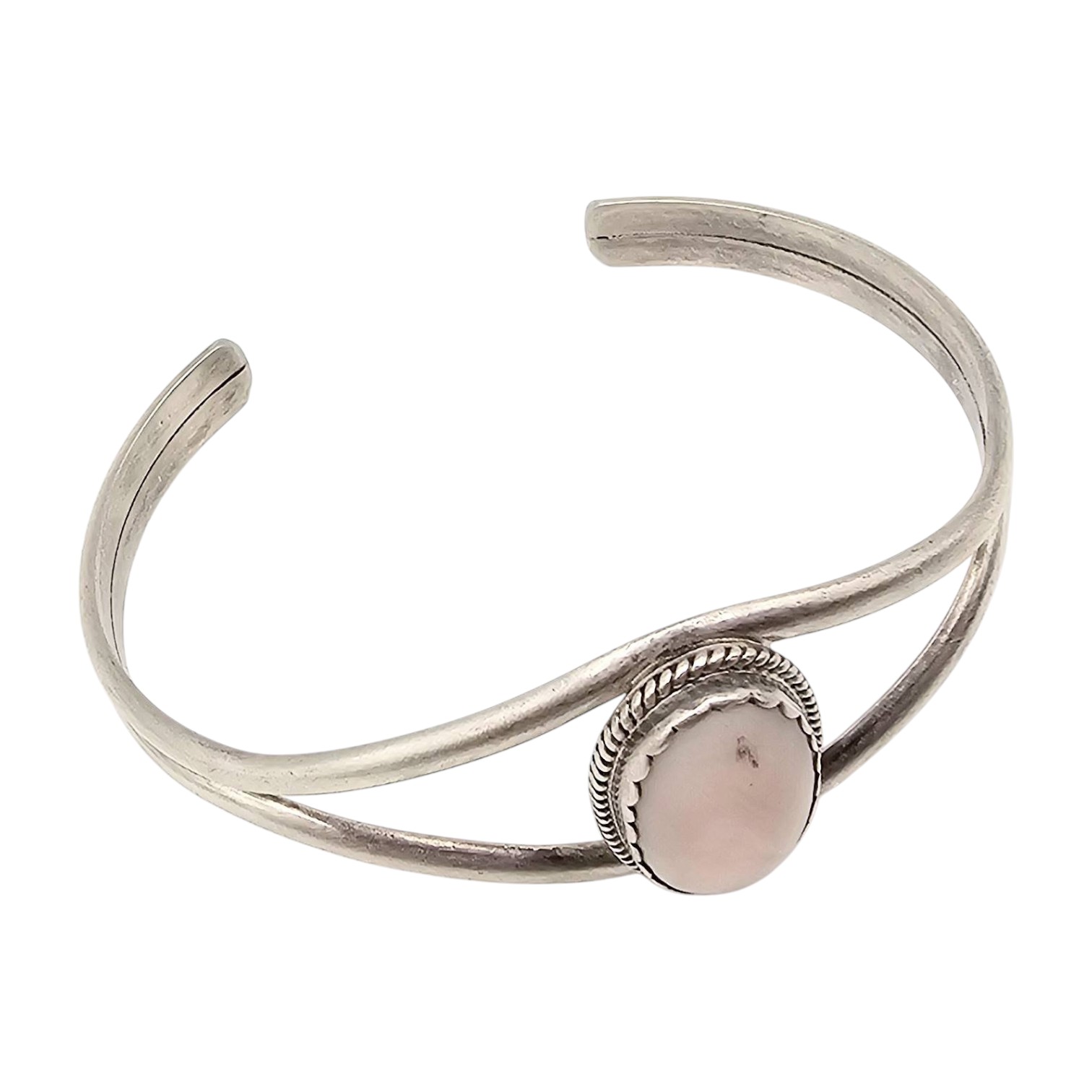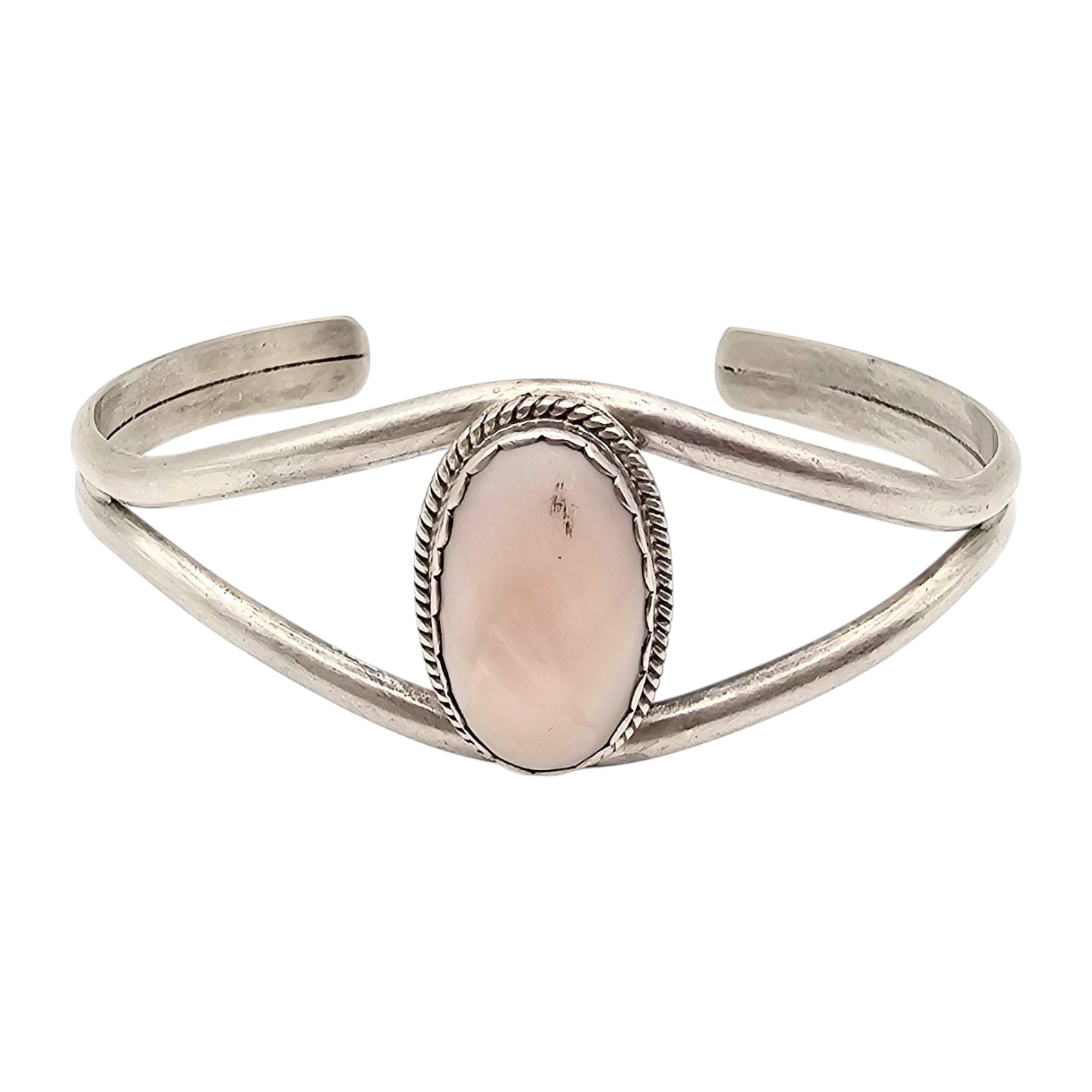 Sterling silver handmade cuff bracelet featuring an oval mother of pearl stone inlay secured within a twisted bezel setting. Weighs approximately 14.7 grams and measures around 5 inches in circumference with a slight gap for adjustability. Marked ‘Sterling’ and stamped with an artisan hallmark on the reverse. Suitable for small wrist sizes.