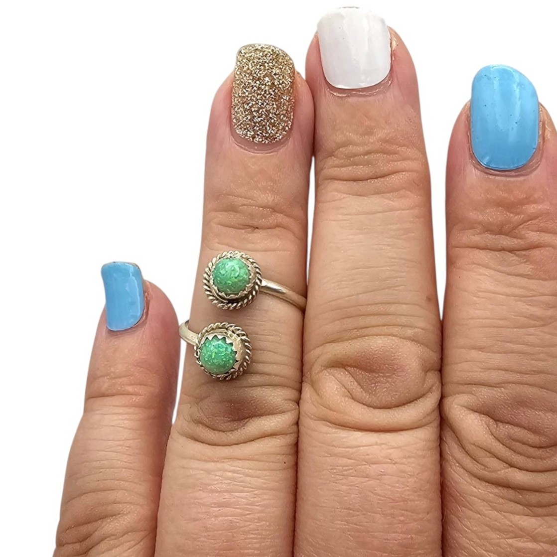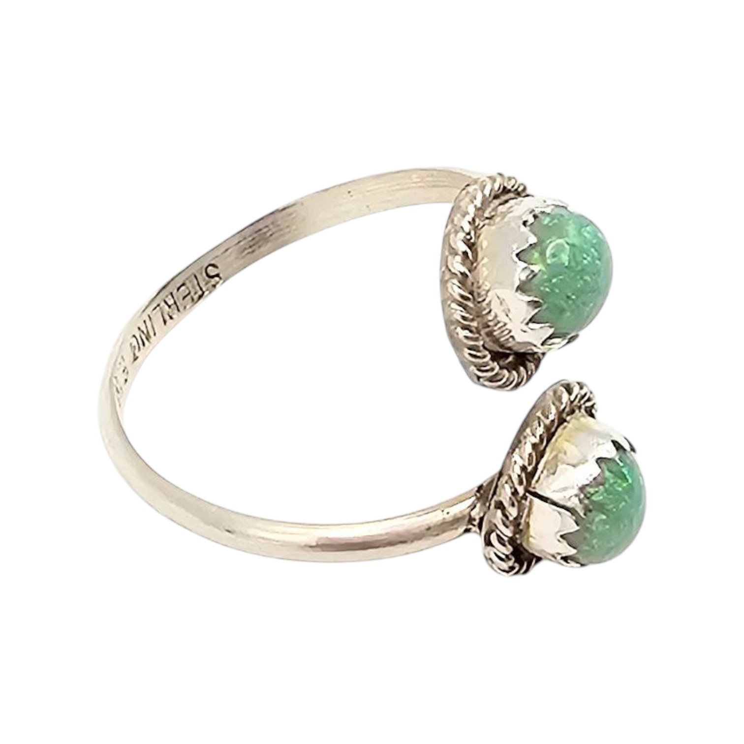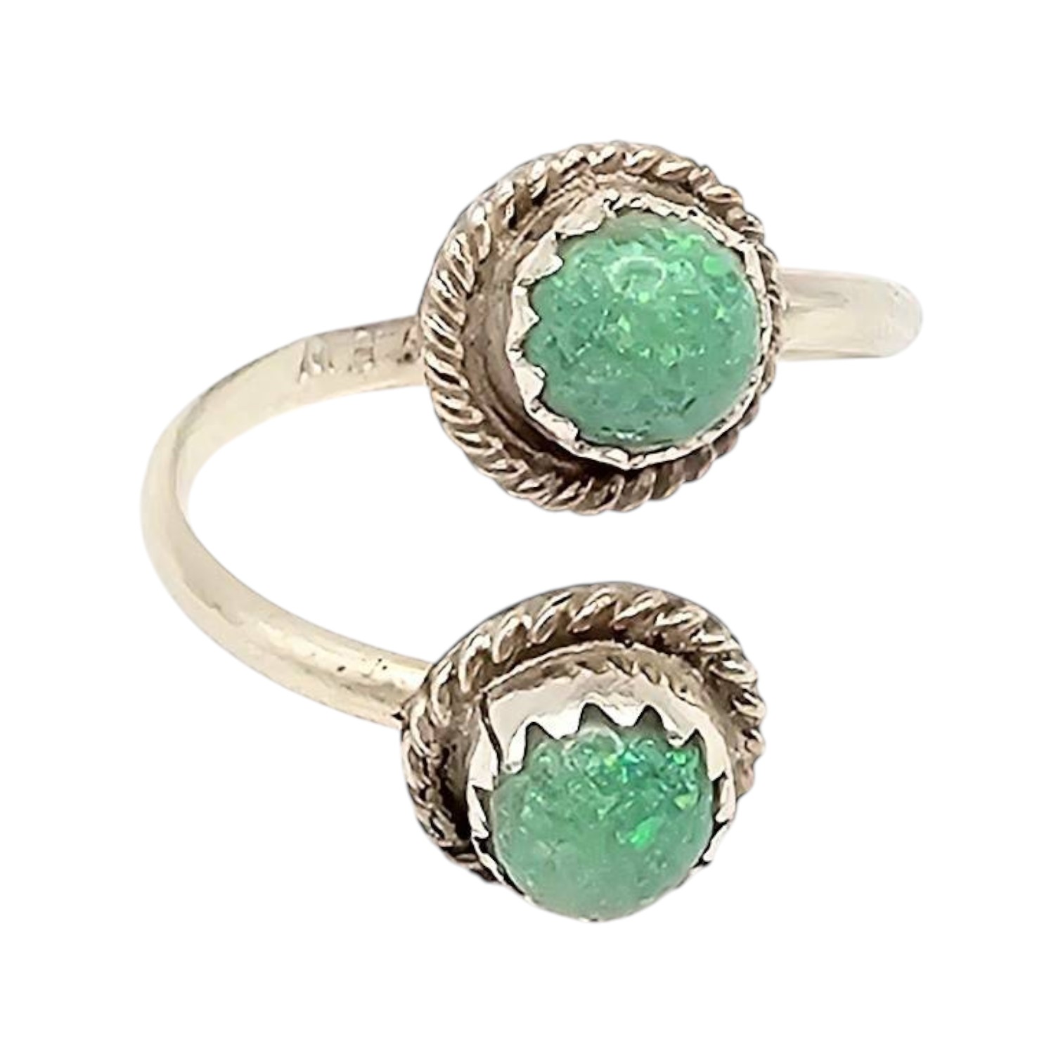 Sterling silver adjustable ring handcrafted by Navajo artisan Esther White. Features two opal stones set in decorative silver bezels. Weighs approximately 1.5 grams as shown on the scale. Adjustable ring design Size 6.5 allows for a customizable fit. A fine example of Navajo artistry.