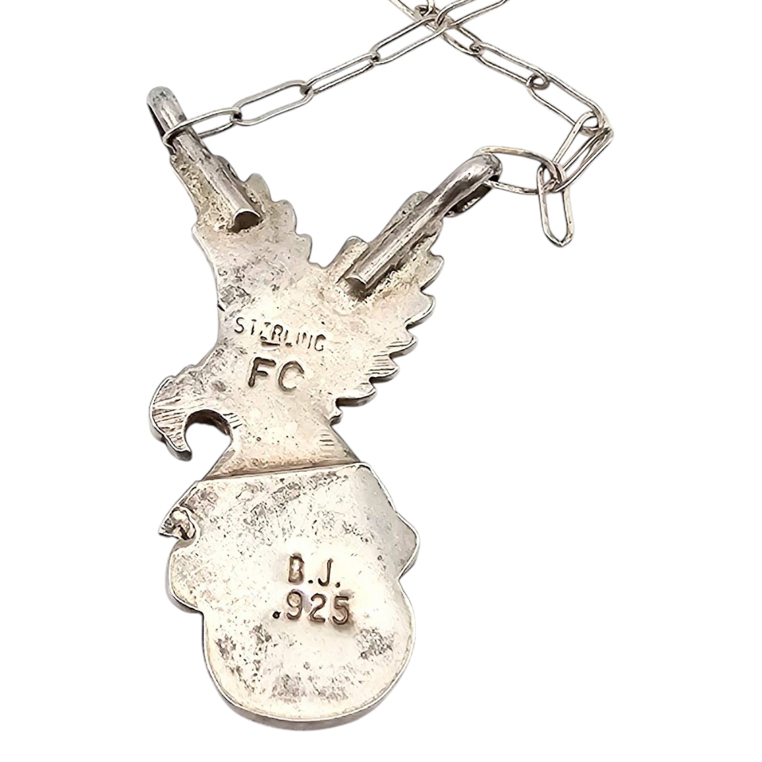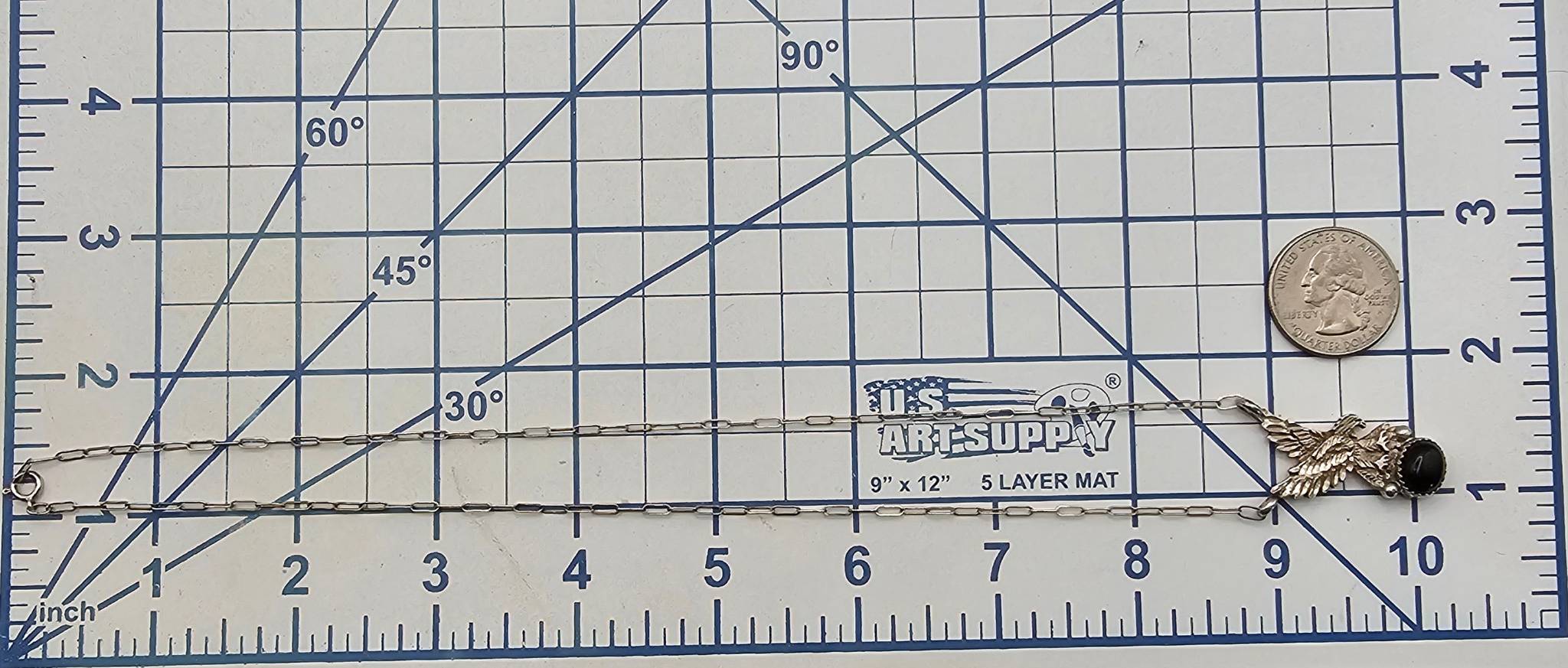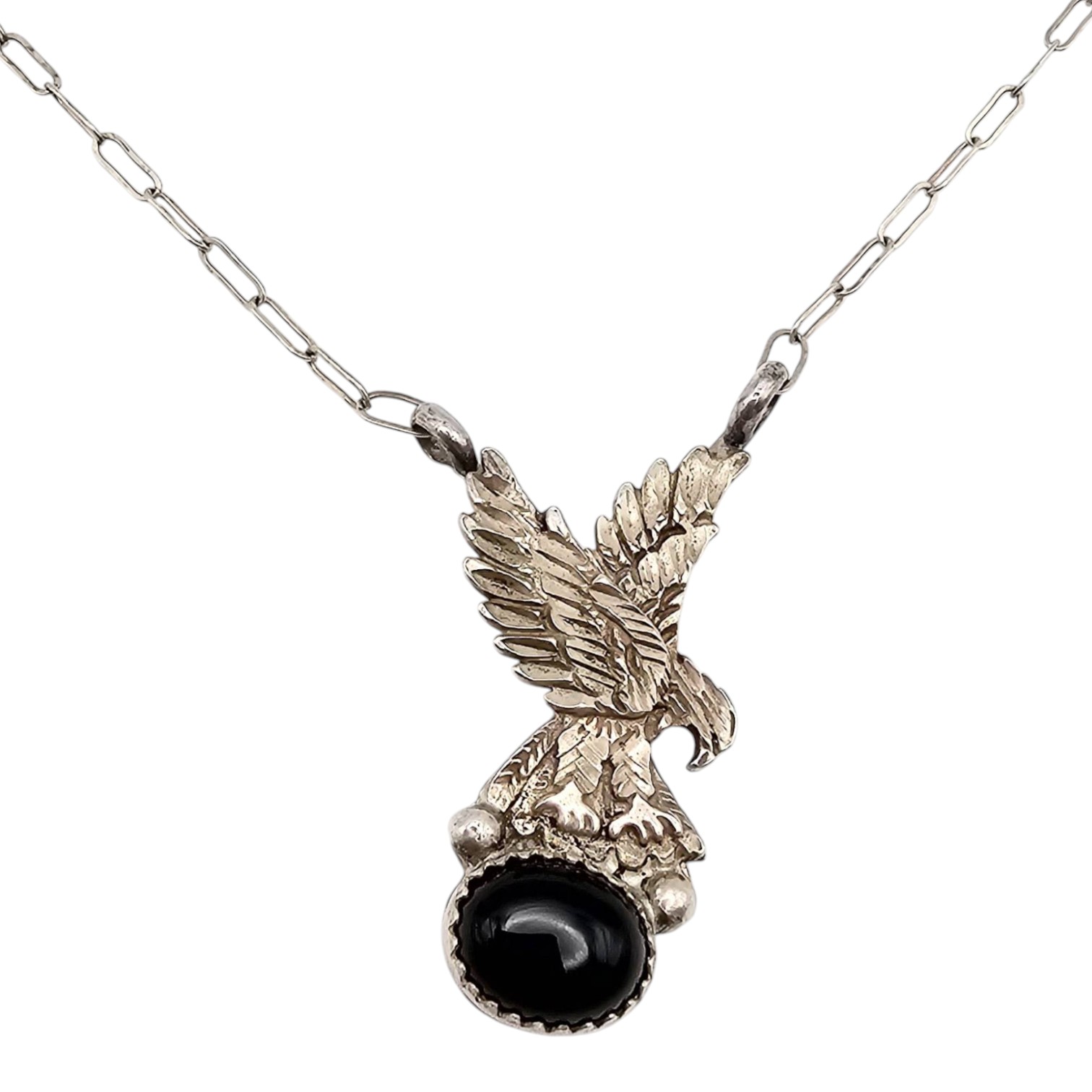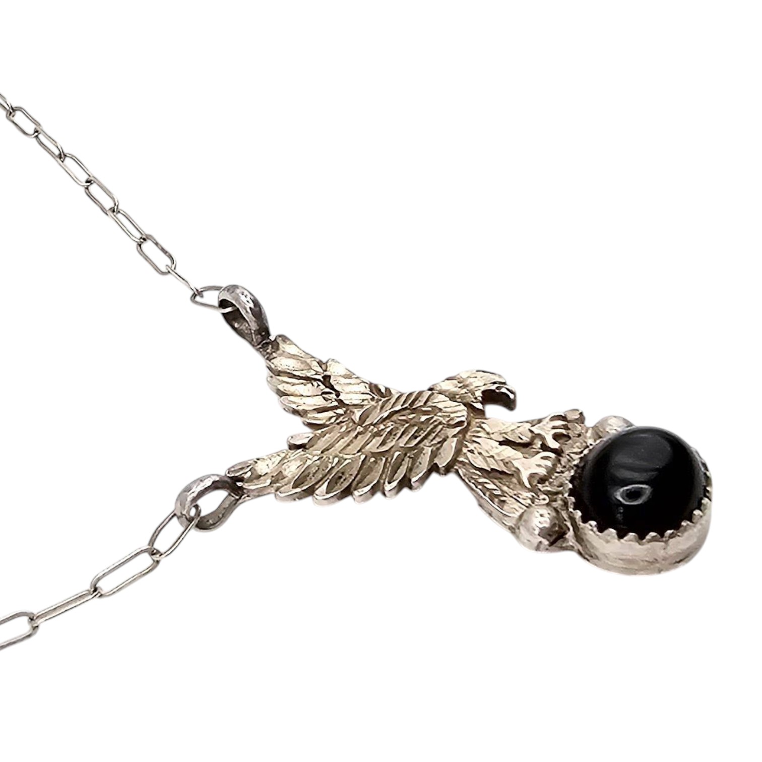 Sterling silver necklace featuring a detailed eagle design with an onyx stone pendant. The piece is marked ‘Sterling FC’ and ‘BJ’ on the reverse. Weighs approximately 6.8g and has a delicate chain with a clasp closure. Chain length is shown alongside a scale in the images, offering clear reference to size.