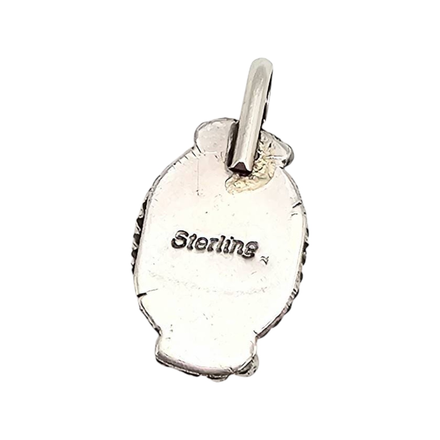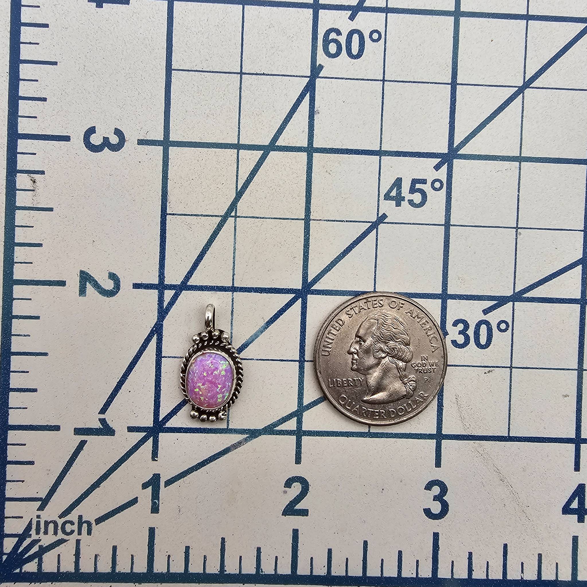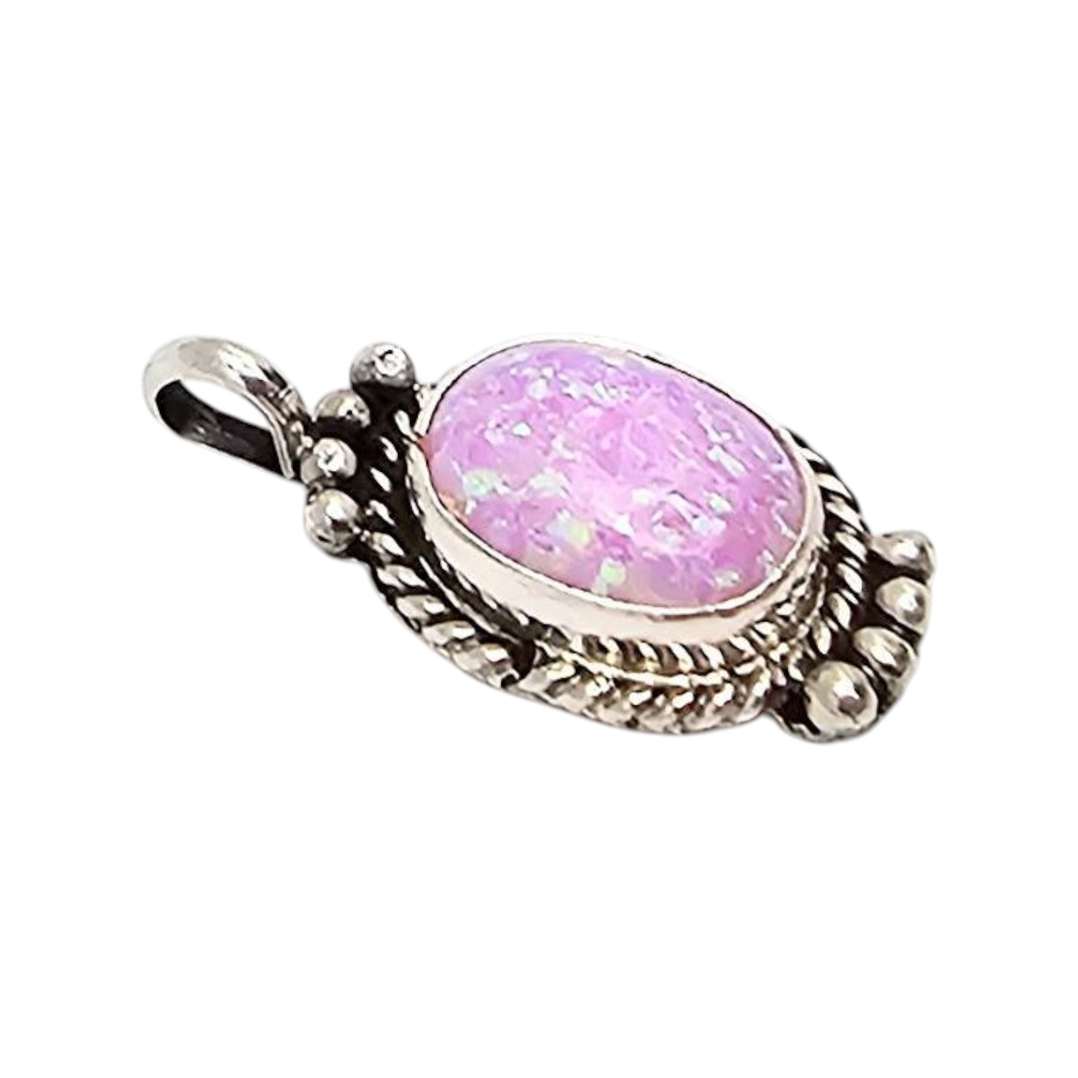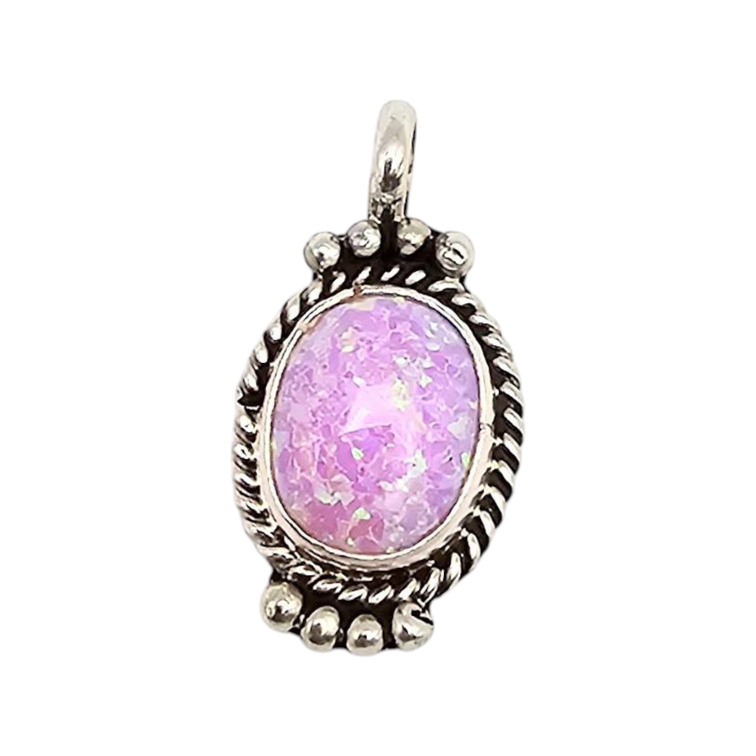 Navajo handcrafted sterling silver pendant by Geneva Werito featuring a pink opal oval stone with an iridescent finish. The pendant showcases intricate silverwork, including bead and rope details around the stone. Marked ‘Sterling’ on the back. Weighs approximately 1.7 grams. Includes a loop for attaching to a chain.