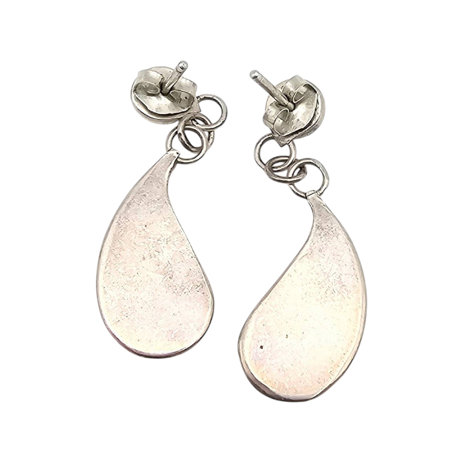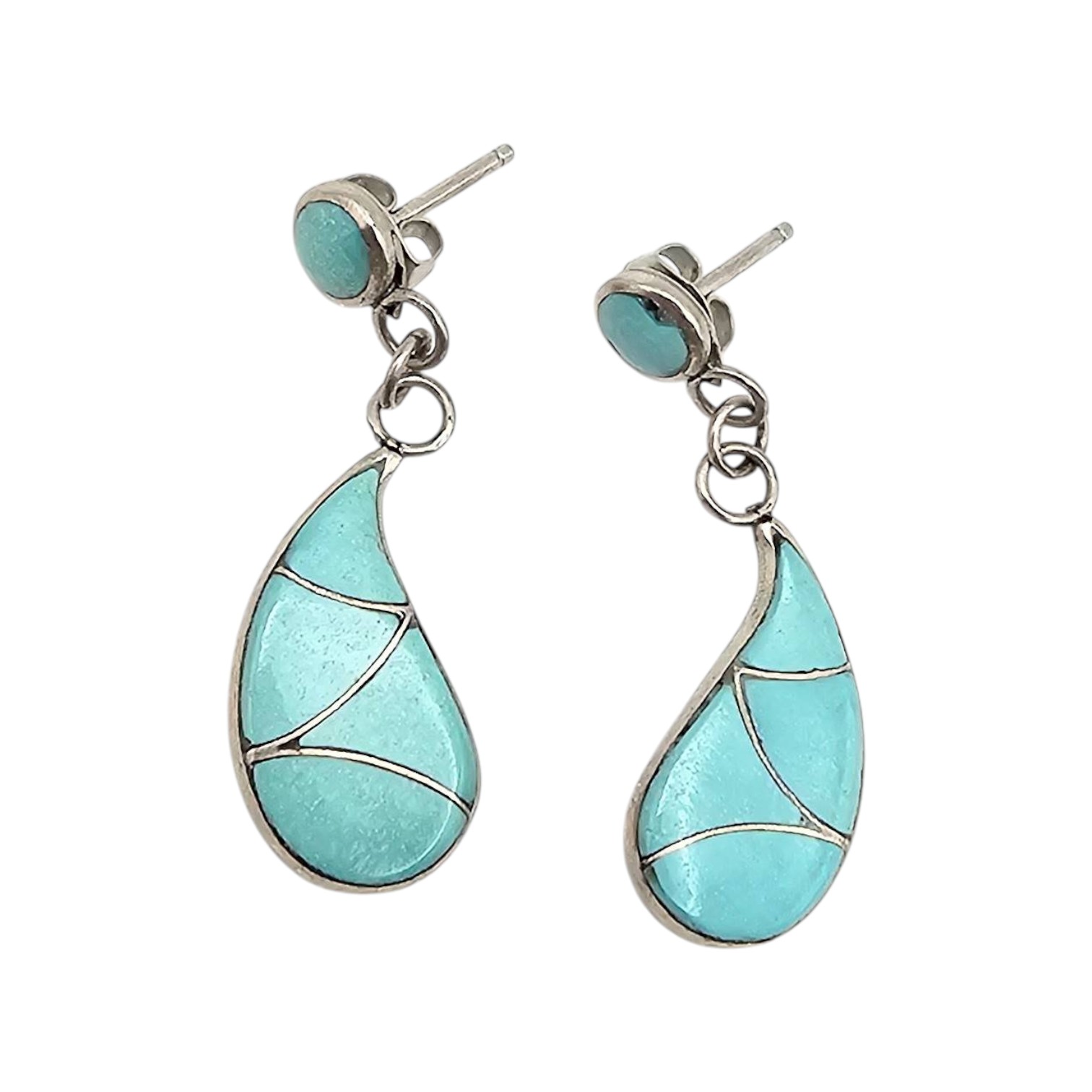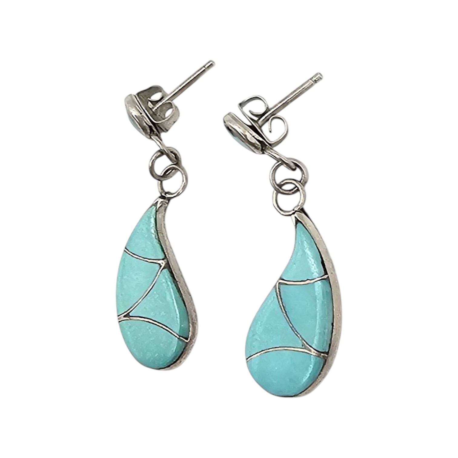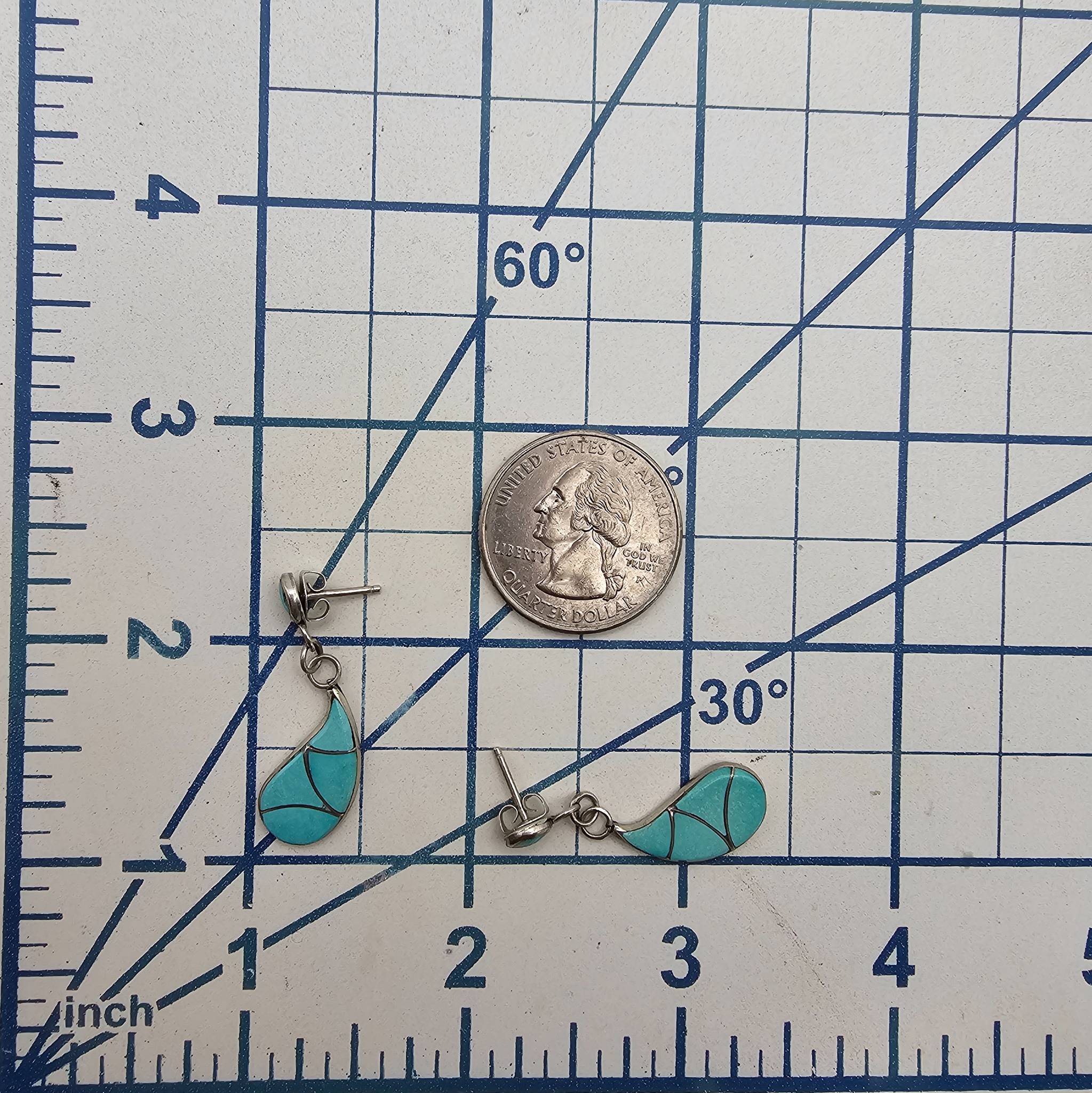 Drop earrings featuring Navajo craftsmanship, made of sterling silver with turquoise inlay detail. Weighing approximately 2.8 grams, these earrings showcase a teardrop shape and secure post backings. The overall design incorporates silver inlay lines, creating an intricate look. Dimensions are provided in accordance with the measurement grid shown.