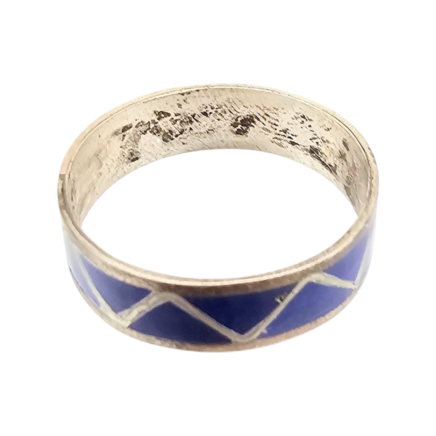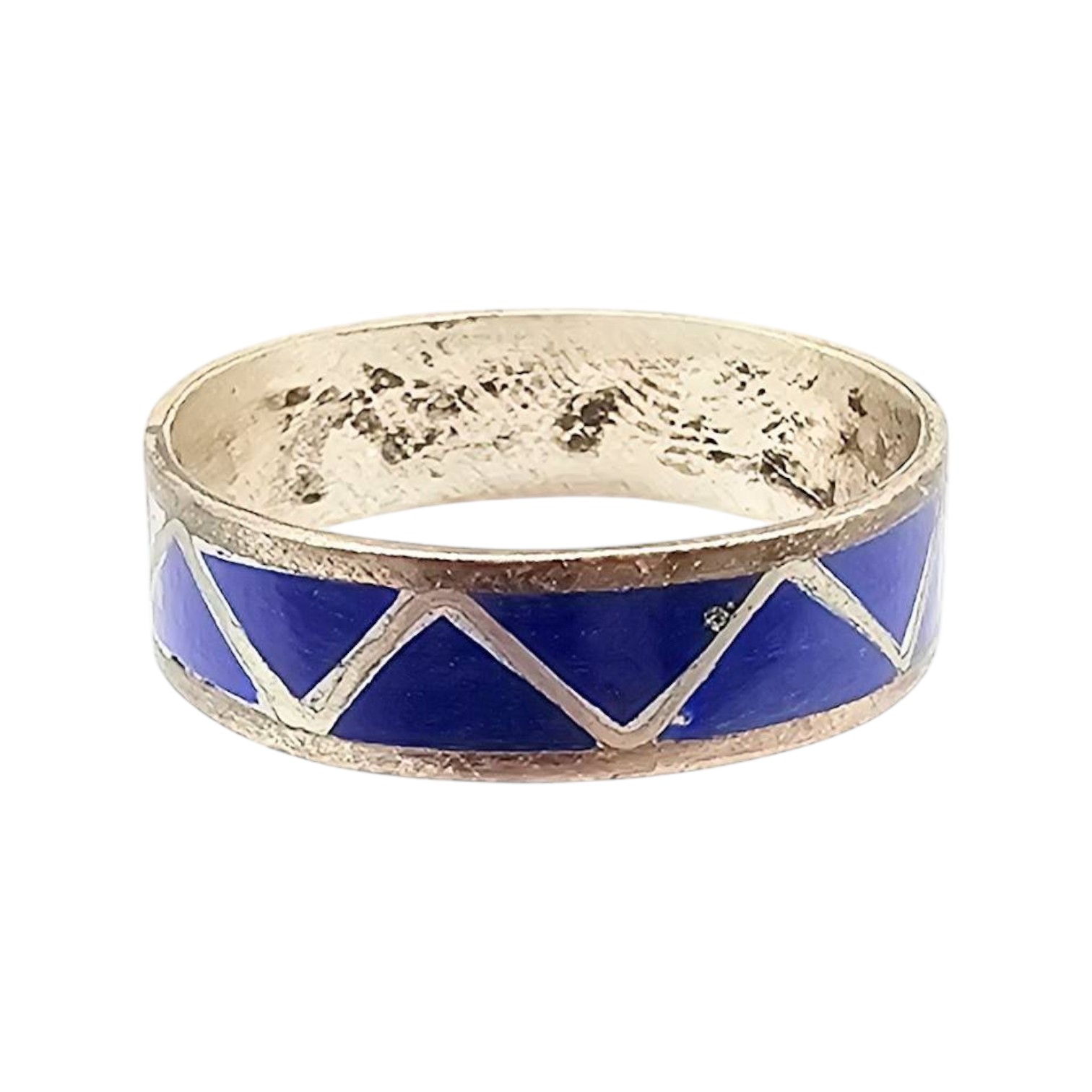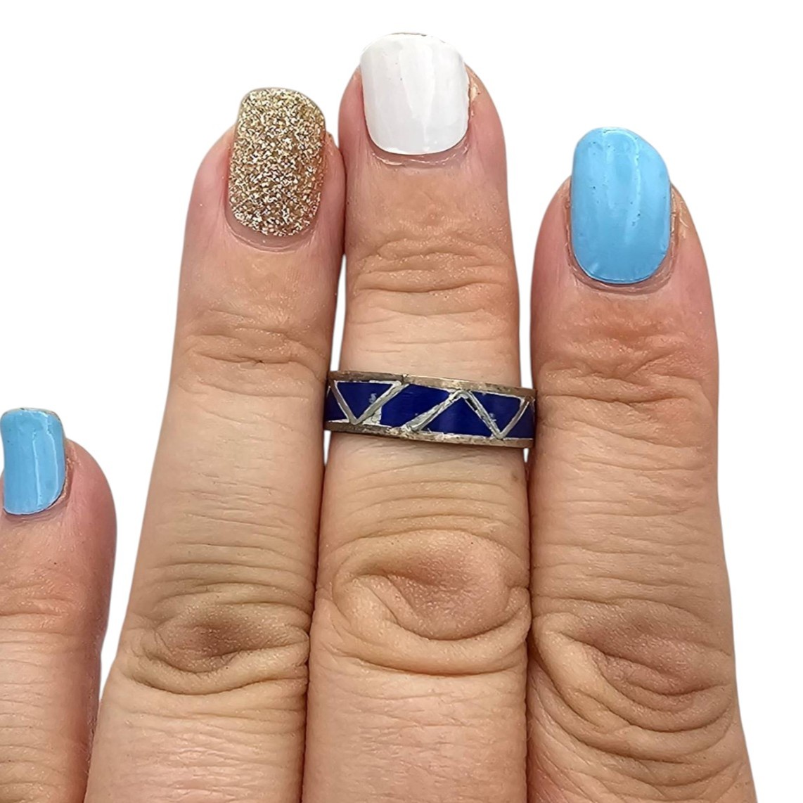 Sterling silver ring handcrafted by Navajo artisan Roger Morgan, featuring lapis lazuli inlay with geometric patterns. Marked size 8, the ring weighs 1.4 grams and showcases the artisan’s hallmark. Excellent craftsmanship and bright lapis accents make this piece a true representation of Navajo jewelry artistry.