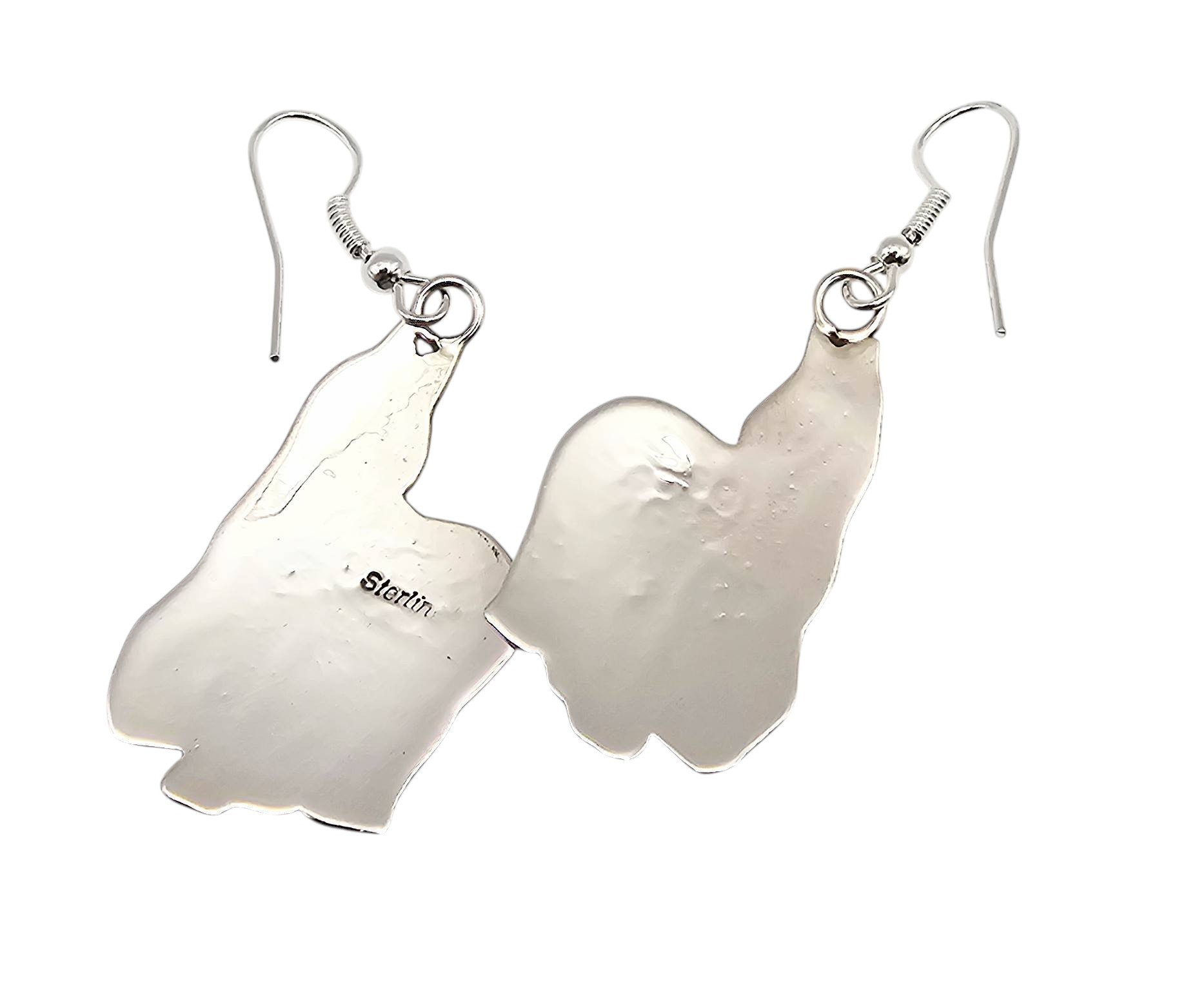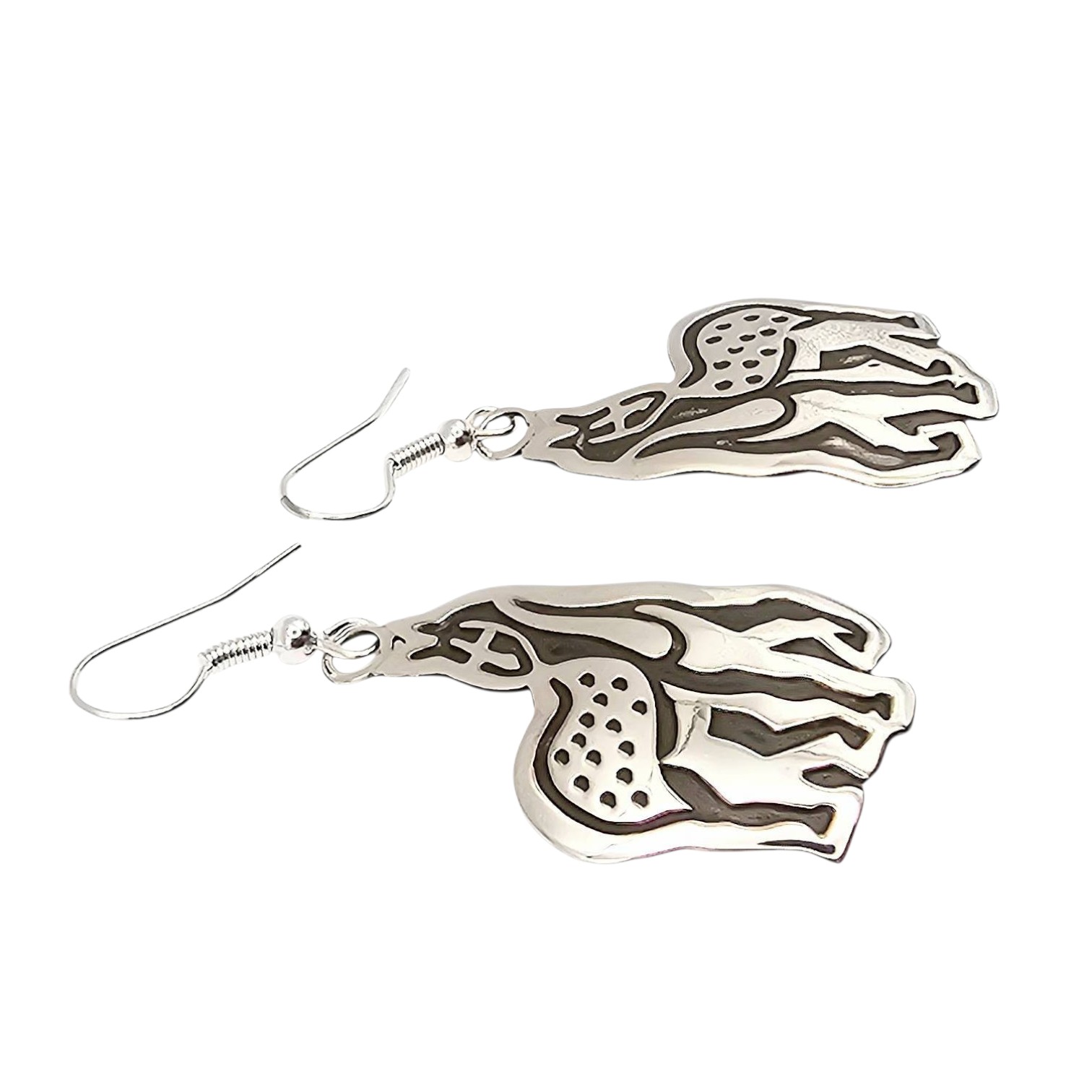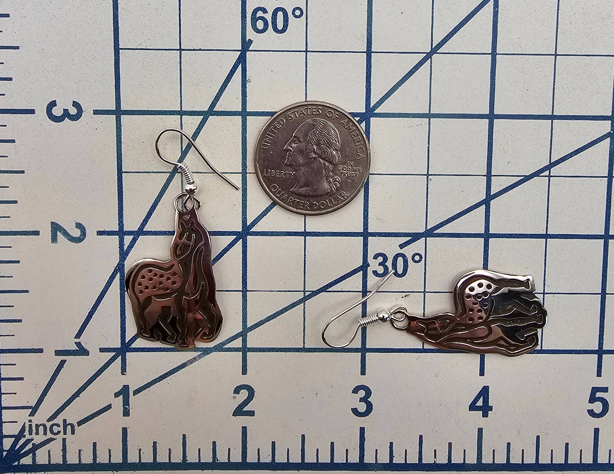 Sterling silver earrings by Navajo artisan Sonny Gene Jr., featuring an intricate horse design. Each earring is stamped ‘Sterling’ on the back, The earrings weigh approximately 4.4 grams total and are measured against industry-standard references for scale. They include French hook attachments for easy wearing.