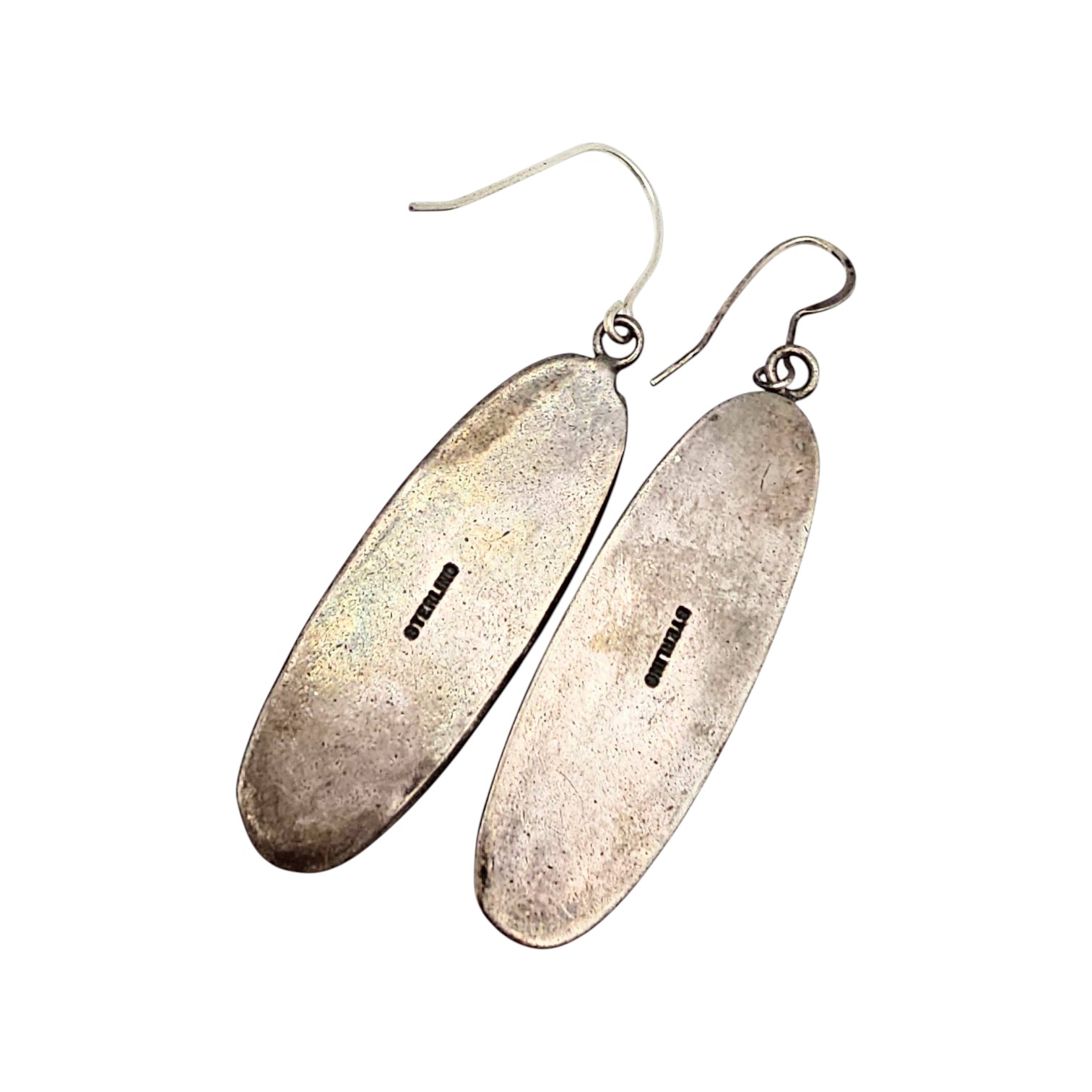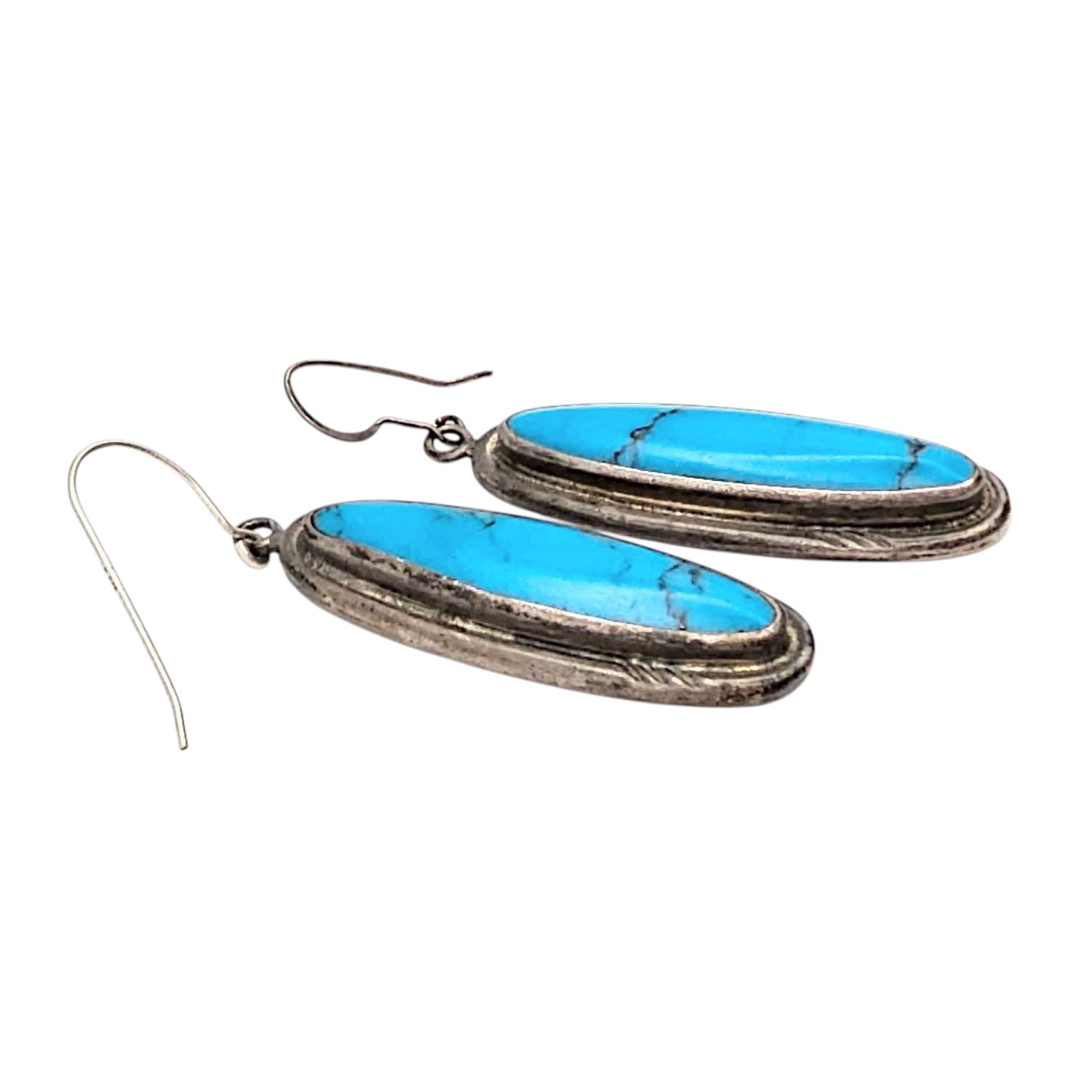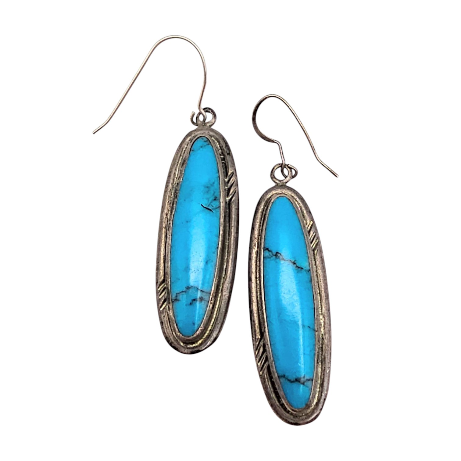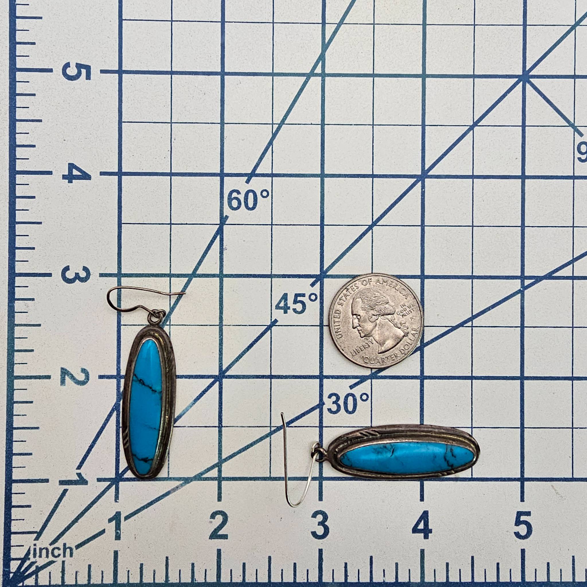 Native handcrafted drop earrings featuring turquoise gemstones set in sterling silver. The earrings are adorned with elegant bezel settings and intricate etched details. Stamped ‘STERLING’ on the back. Total weight is 15.4 grams. Approximate dimensions can be inferred from the coin and grid for reference.