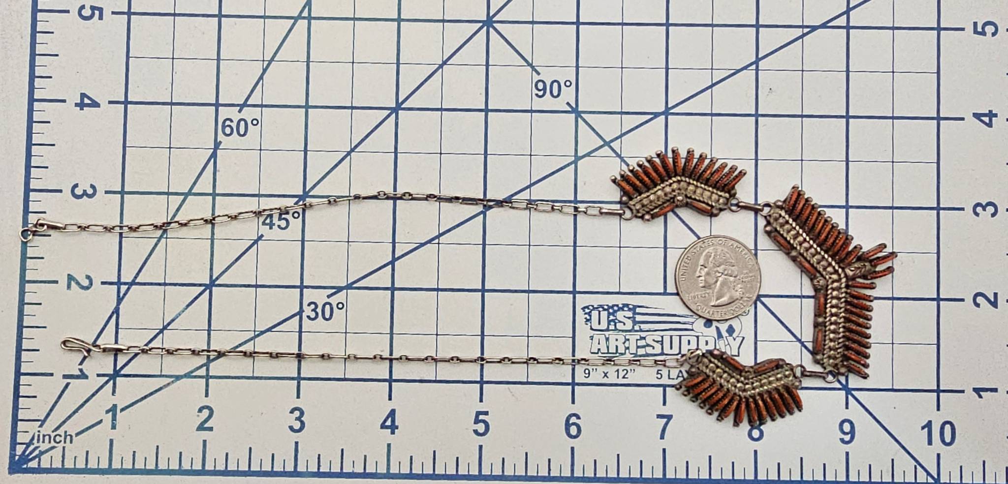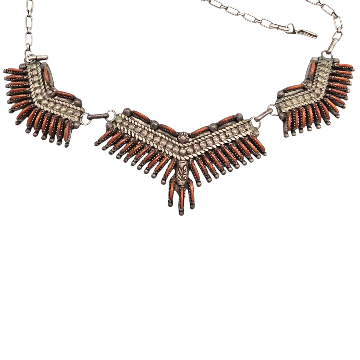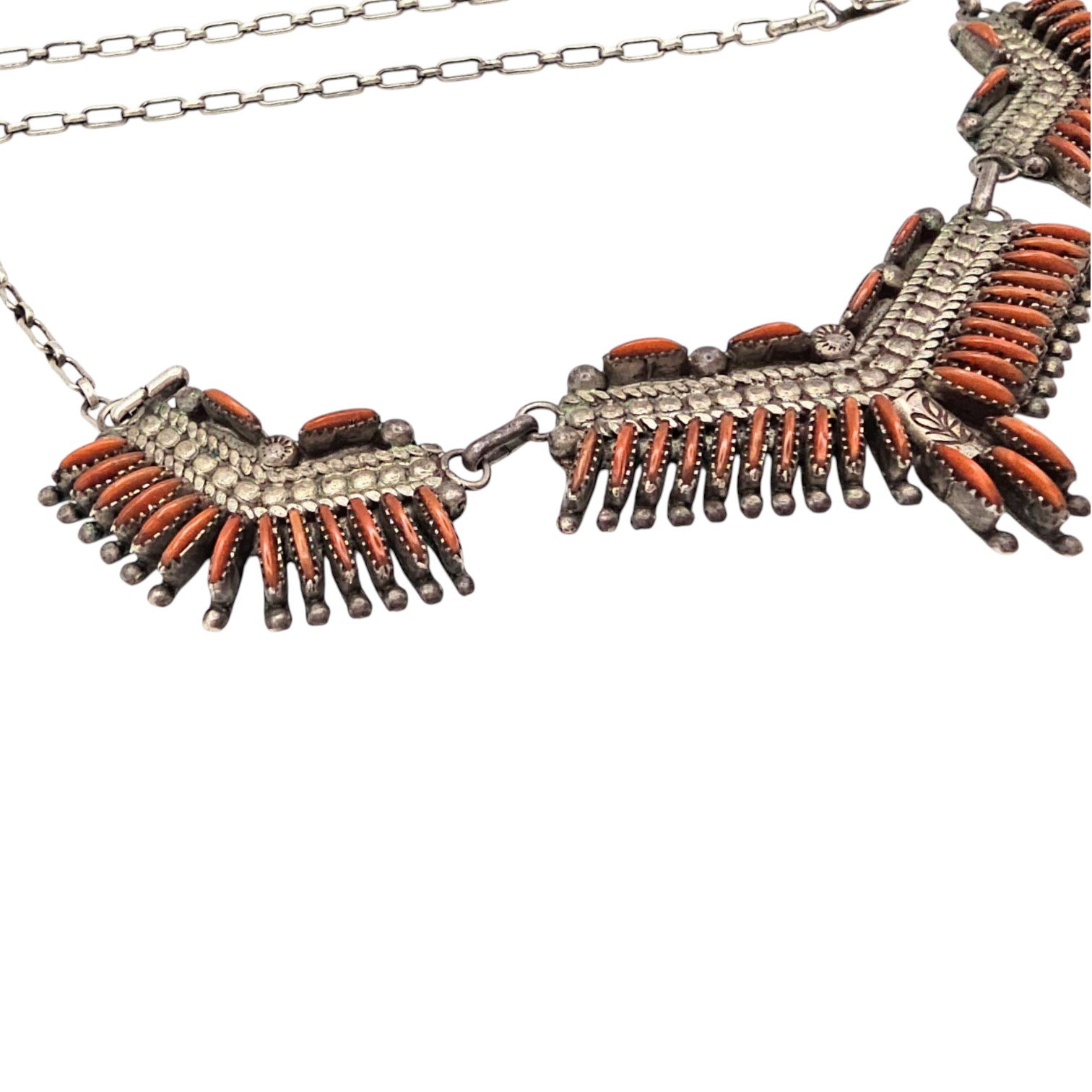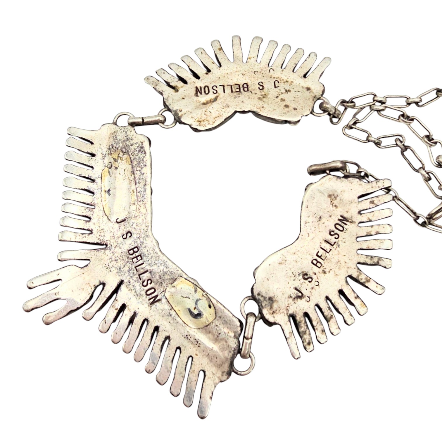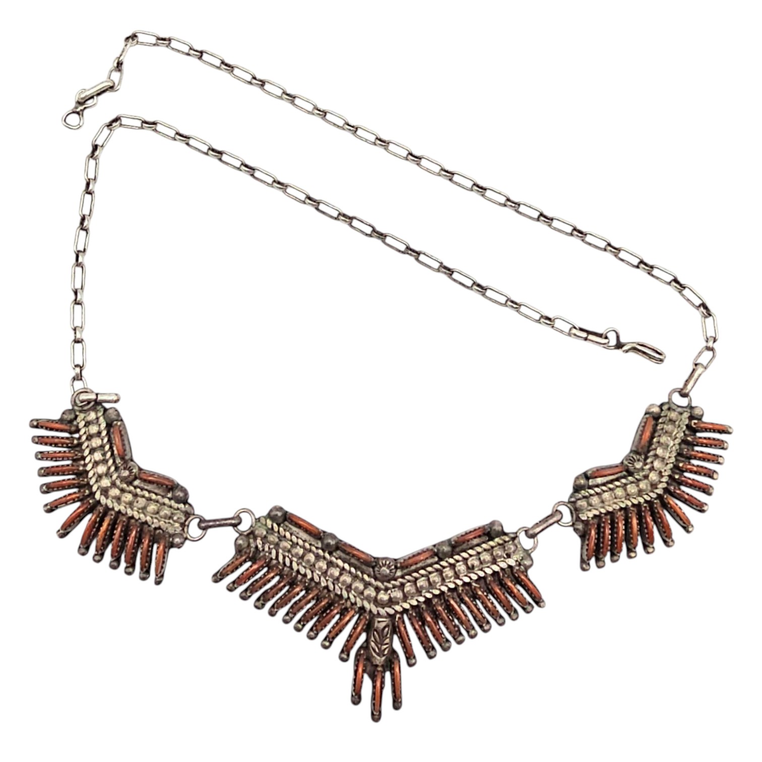 JS Bellson sterling silver necklace featuring needlepoint design with coral inlays. Approximate weight is 27.1 grams. Chain includes a hook clasp, and back of pendants is stamped ‘JS Bellson.’ Measures approximately 15 inches in length and includes intricately crafted, pointed coral details.