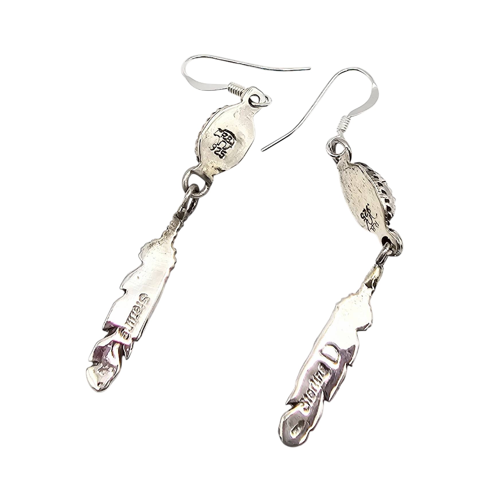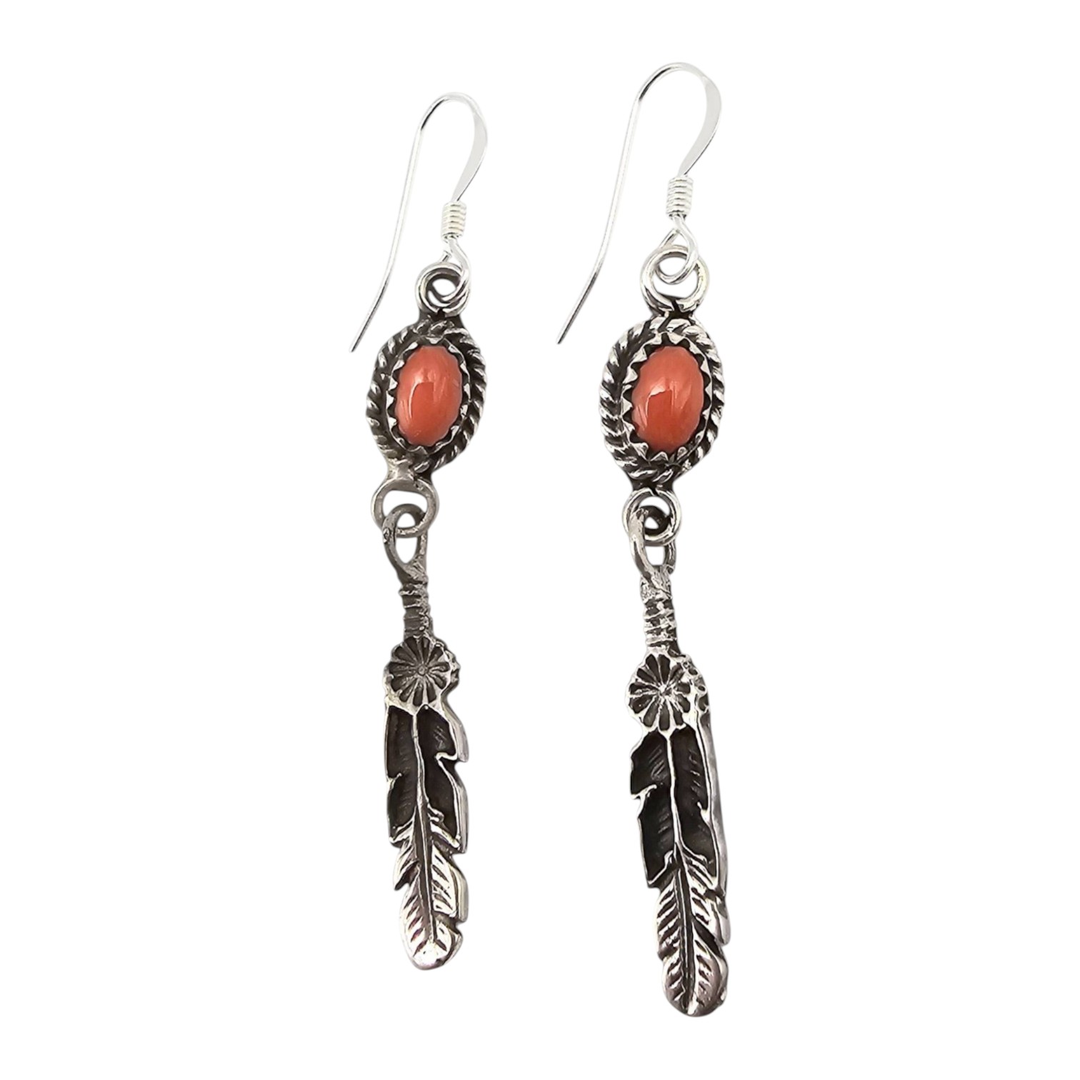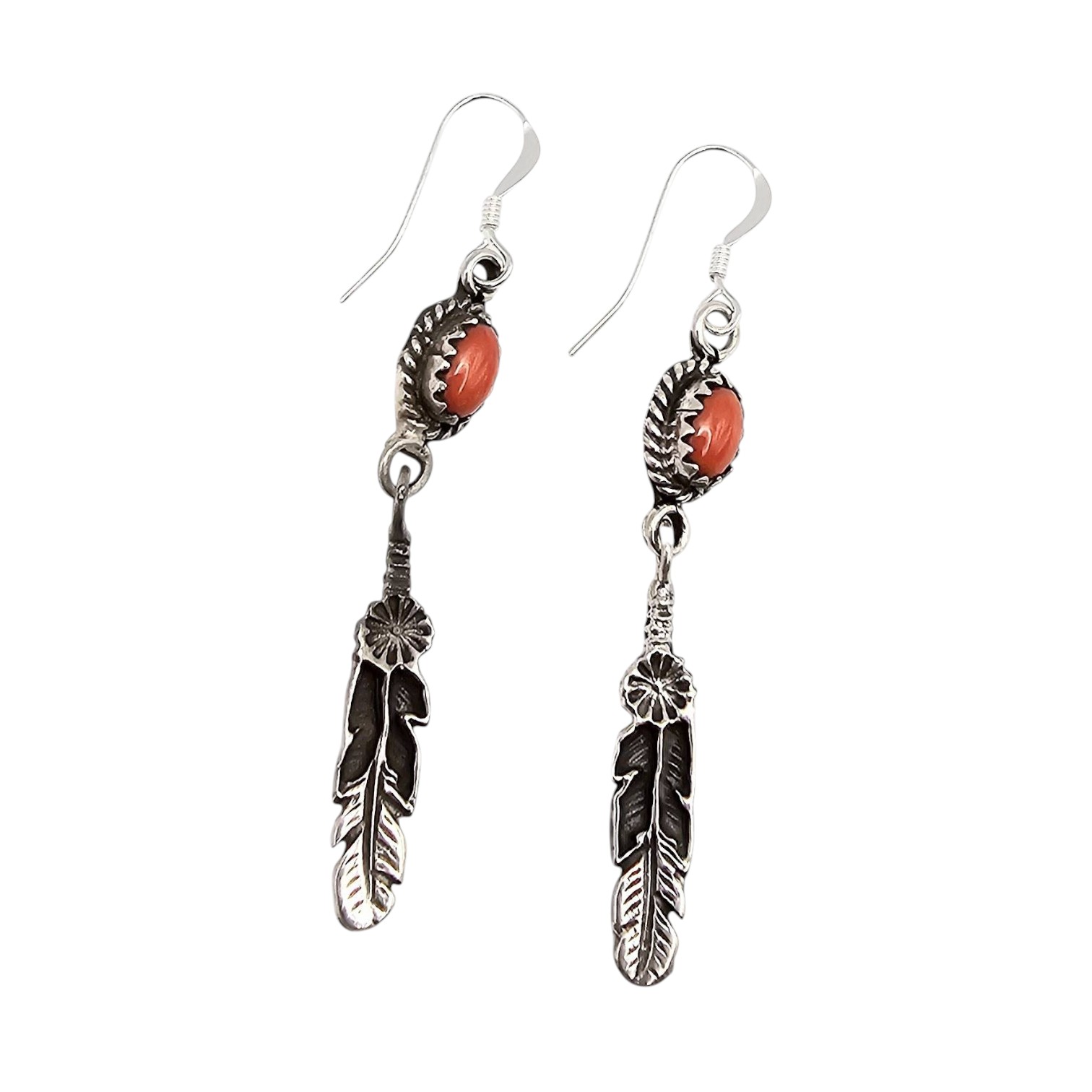 Genuine handcrafted sterling silver earrings by Navajo artisan Letricia Largo. Features a detailed feather design with coral stone accents. The pair weighs 3.4 grams and includes hook fastenings.