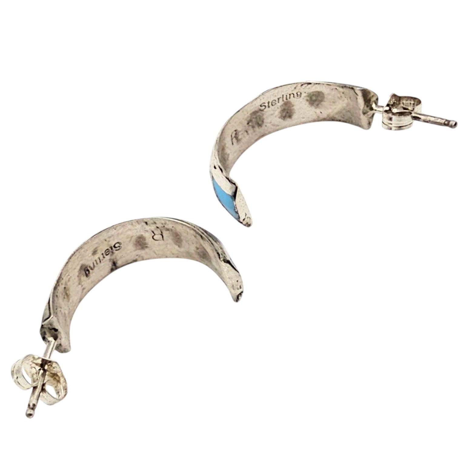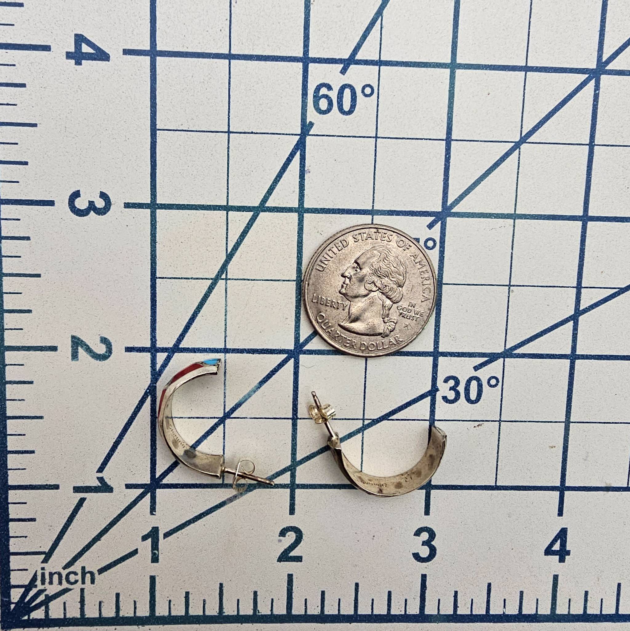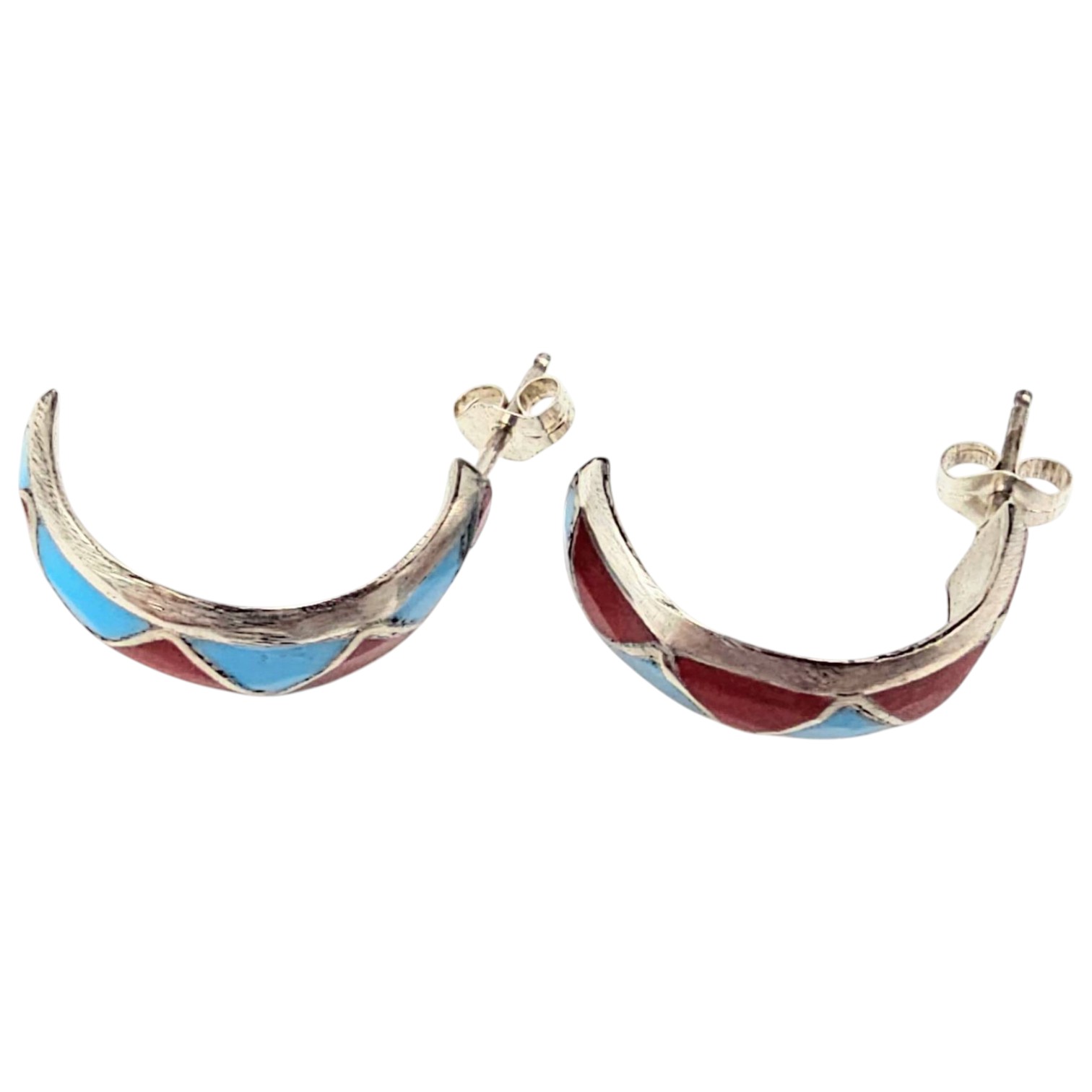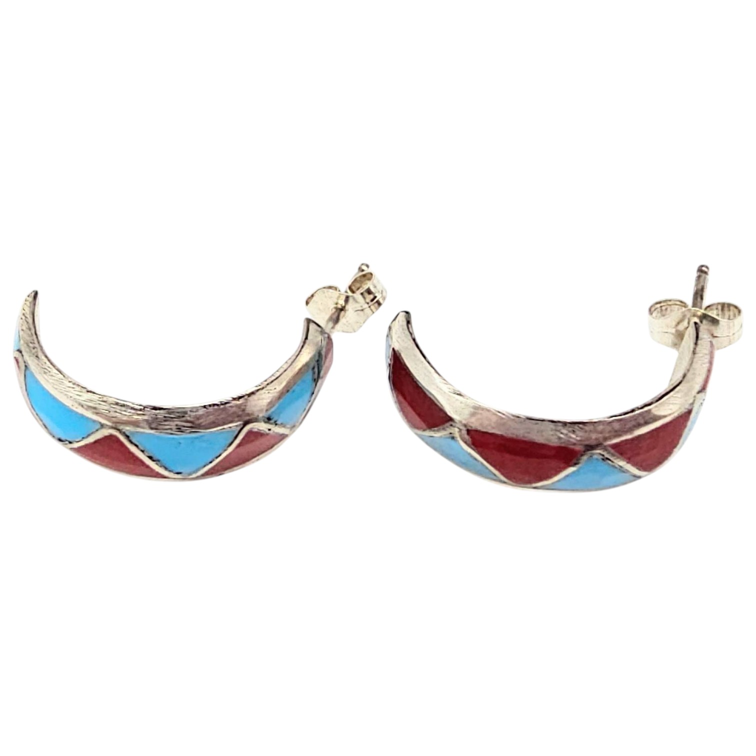 Navajo handmade earrings by Raymond Morgan, crafted from sterling silver. Features a multi-color inlay design with turquoise and coral accents. Marked as ‘Sterling’ on the back of the earrings. Weighs approximately 2.7 grams, and dimensions are shown relative to a U.S. quarter.