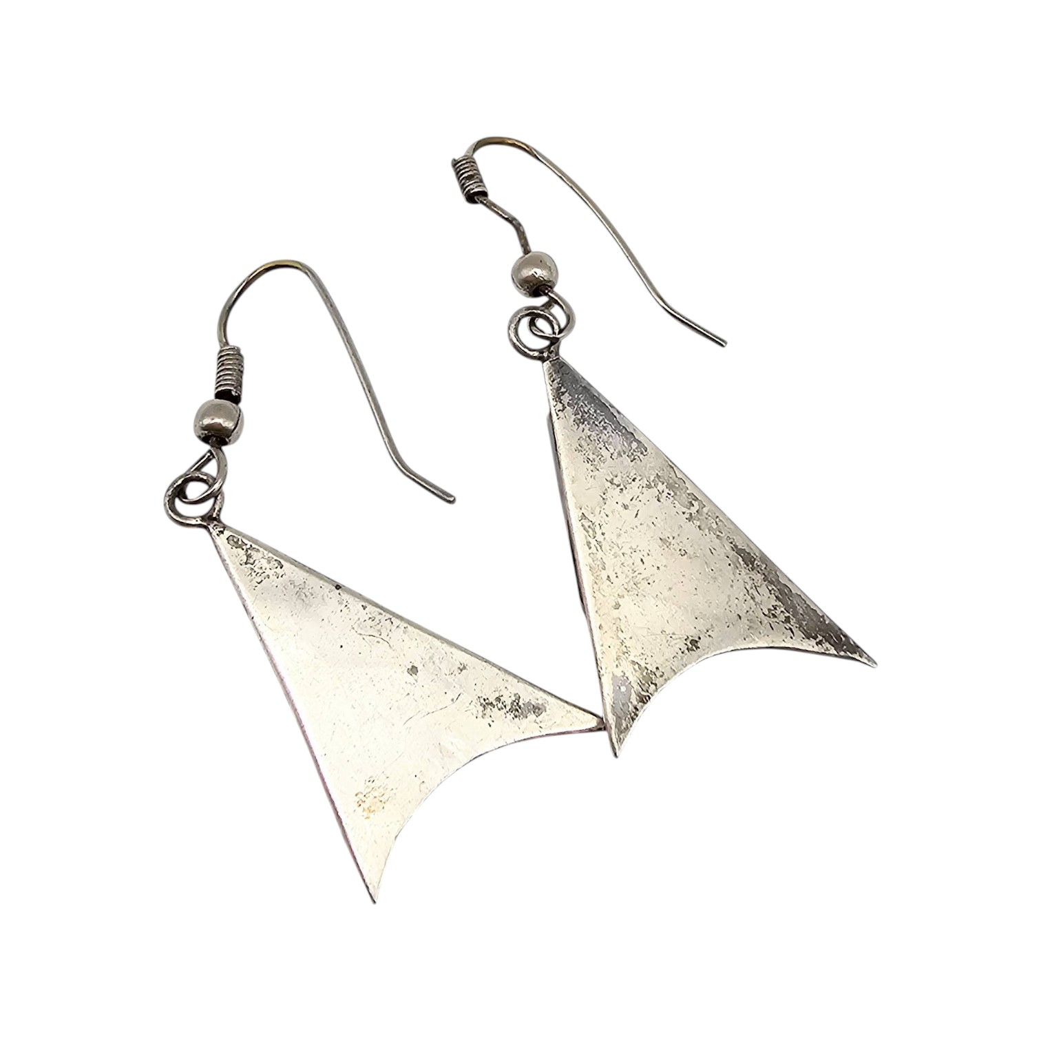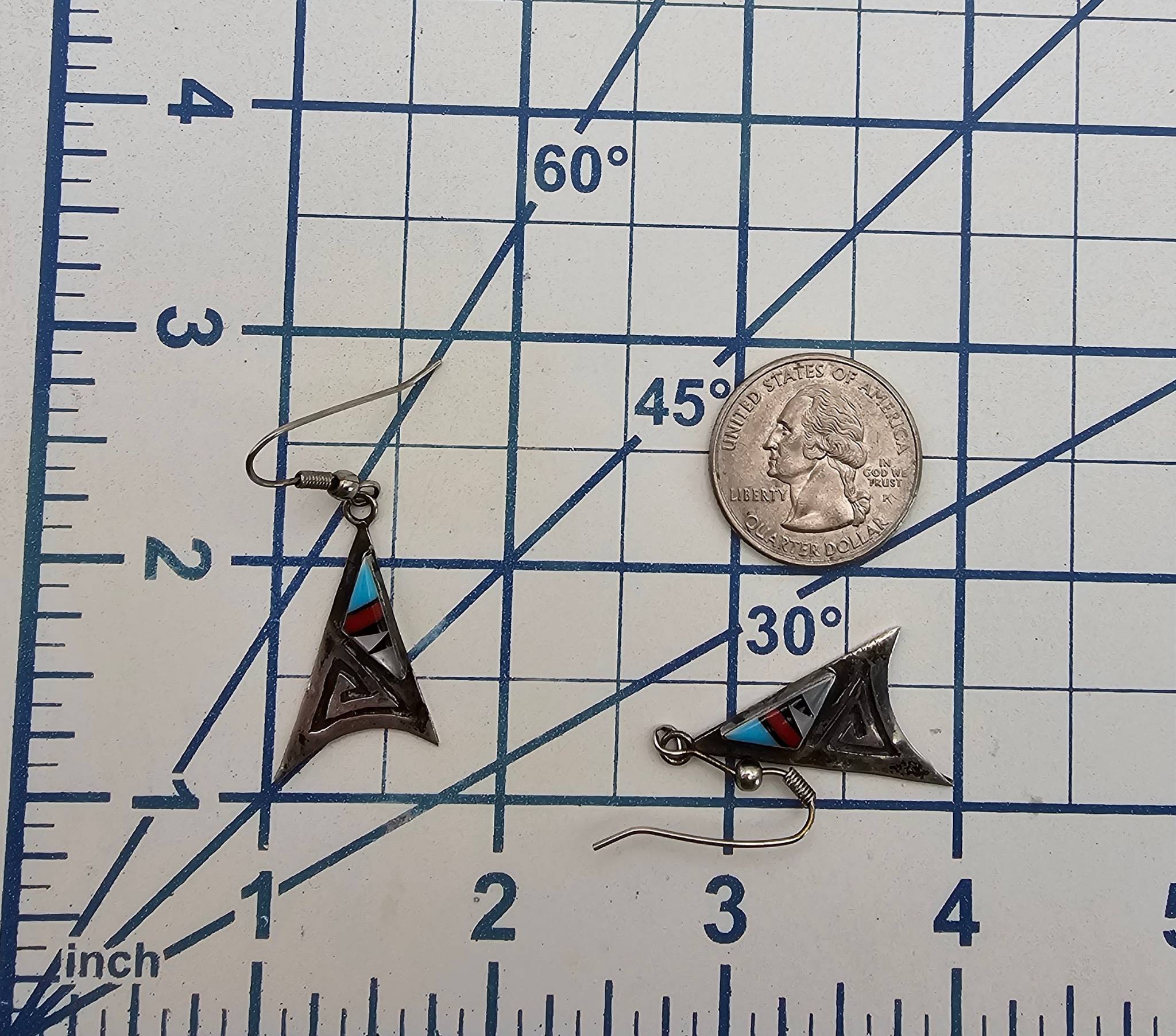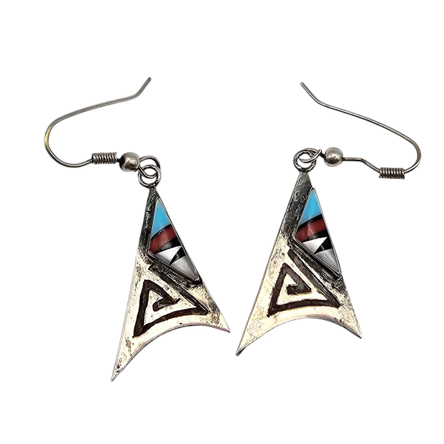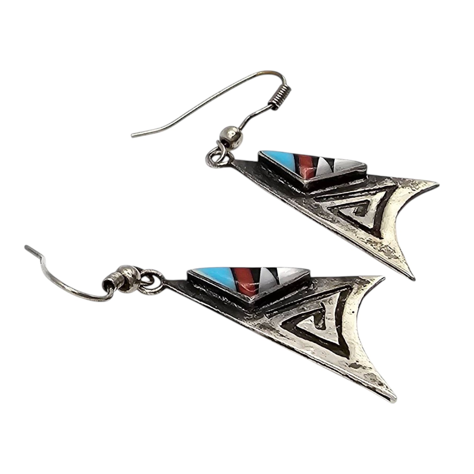 Navajo-made earrings crafted from sterling silver featuring multi-stone inlay including mother of pearl, turquoise, coral, and black accents. Weighing approximately 4.8 grams, these earrings feature a triangular design with geometric detailing. Includes hook-style ear wires for comfortable wear.